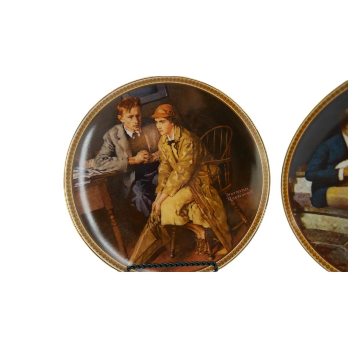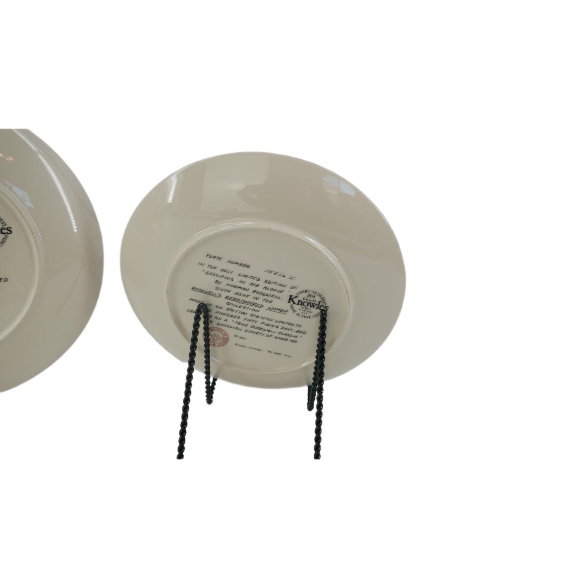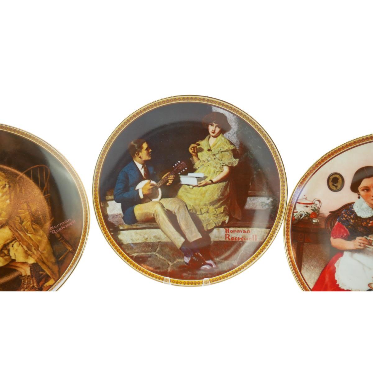 Three vintage Norman Rockwell collectors plates. Limited edition 1983 "Confiding in the Den" Rockwell's Rediscovered Women Collection #8784L. Limited edition "Pondering on the Porch" Rockwell's Rediscovered Women Collection #13528T. Limited edition 1983 "Gossiping in the Alcove" Rockwell's Rediscovered Women Collection #15866L. All in excellent condition. Stands not included. Each measures approximately 8.5" in diameter. Lot weighs 2 lb 8 oz. (C103)