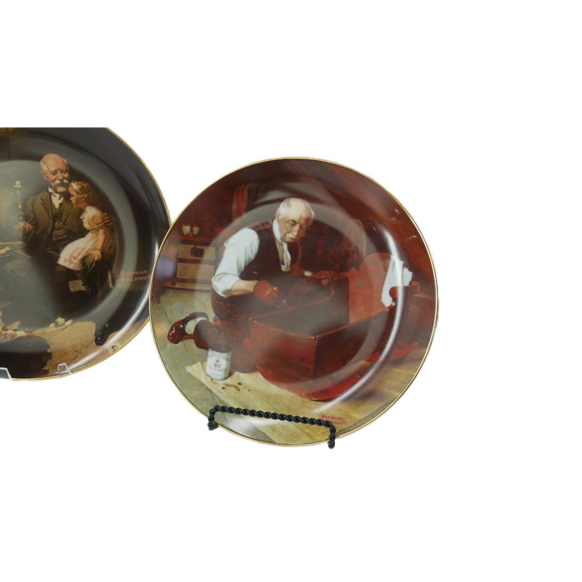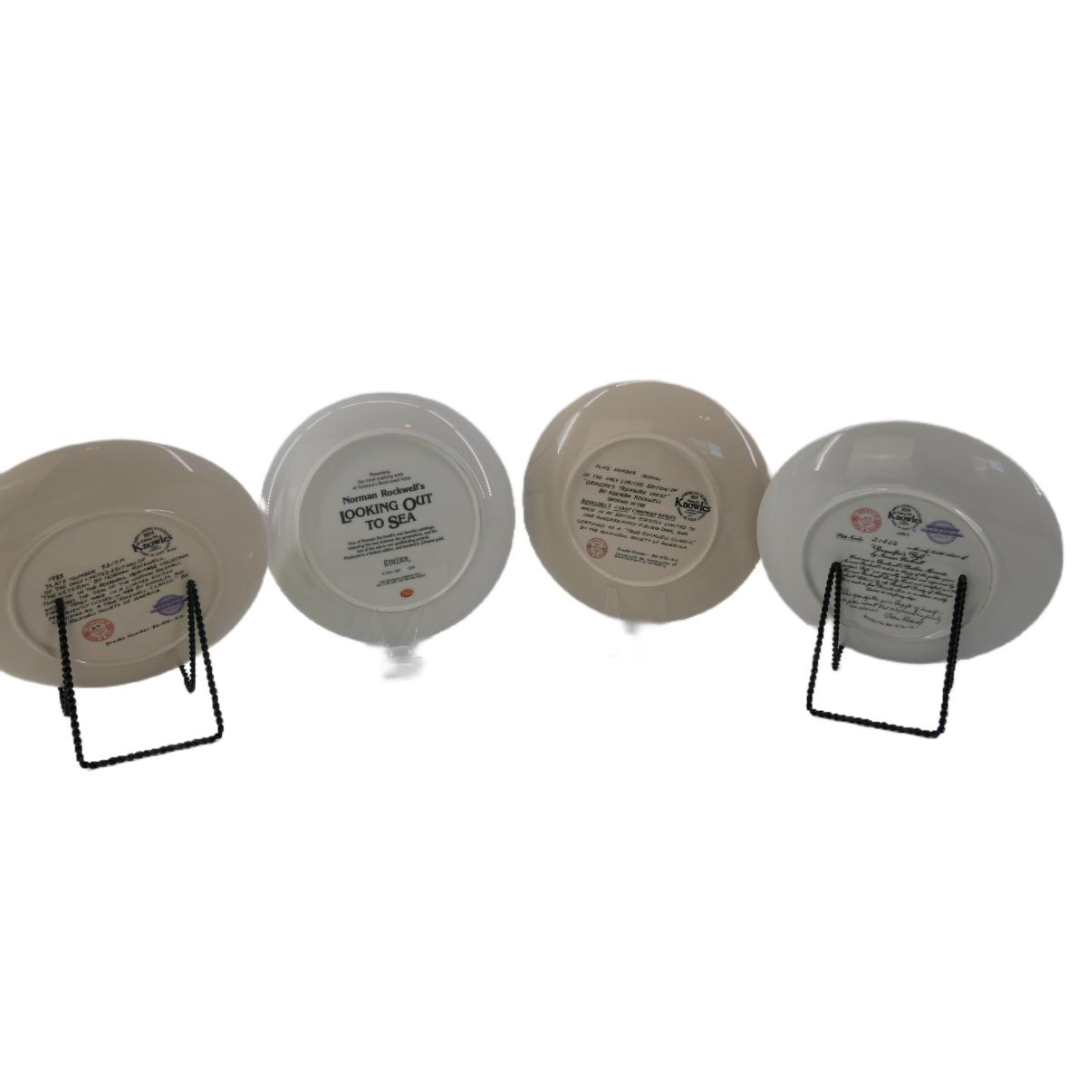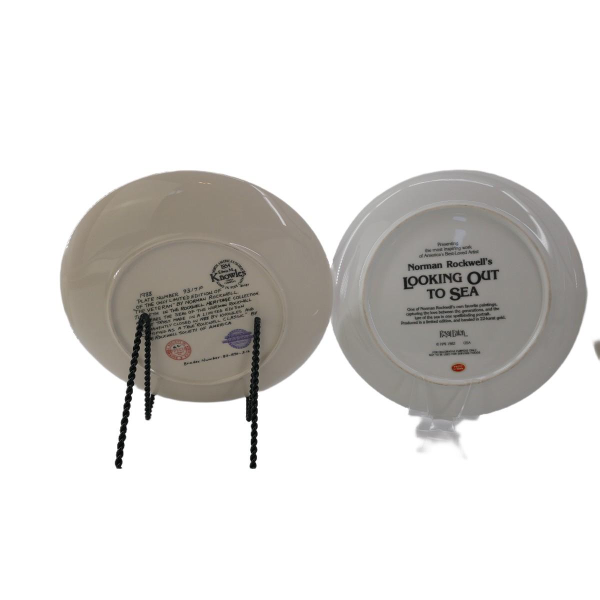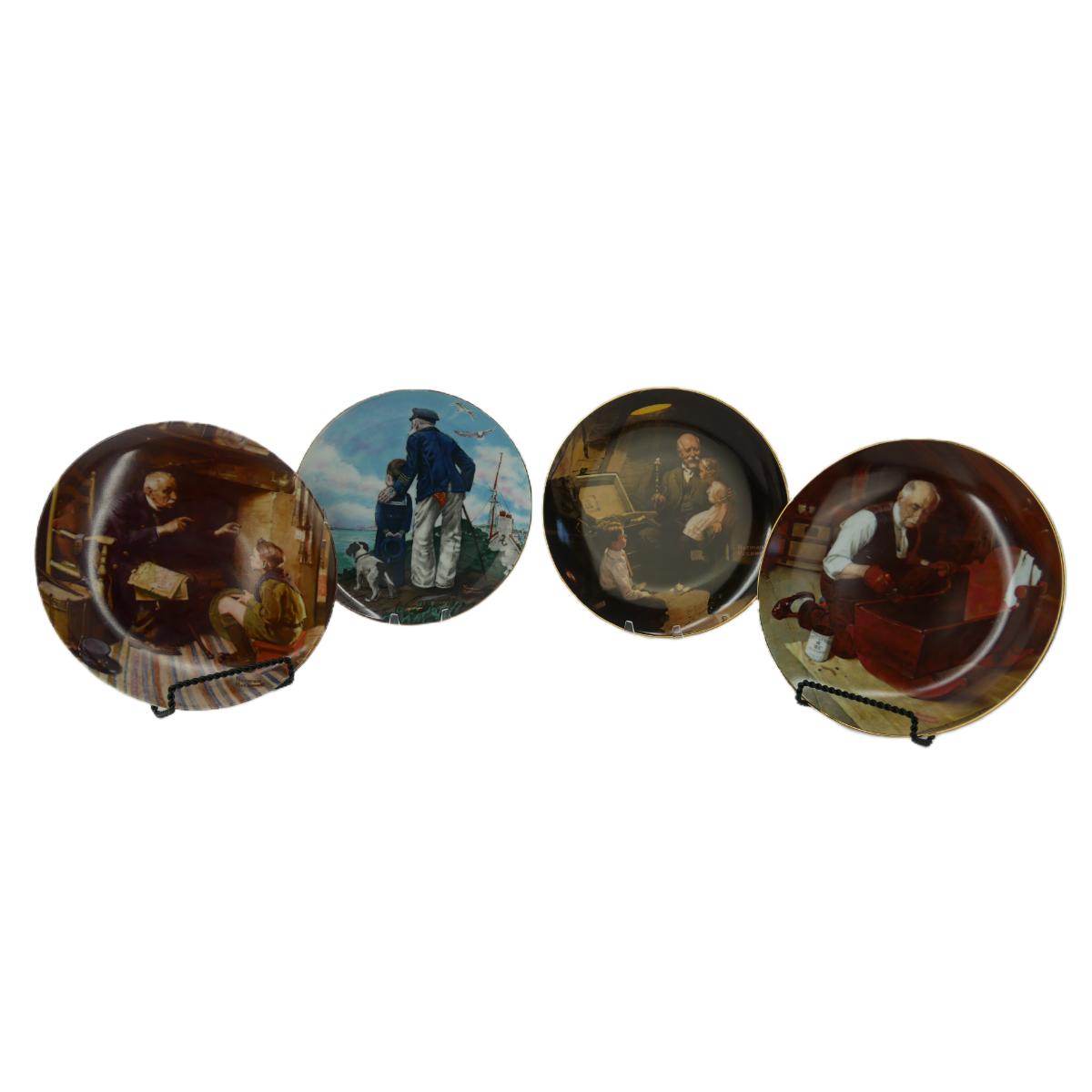 Four vintage Norman Rockwell collectors plates. Limited edition Hetitage Collection 1988 "The Veteran" #9317F. Limited edition 1982 "Looking Out to Sea", banded in 22-karat gold - Royal Eaton, made in Japan. 1983 "Grandpa's Treasure Chest" in Light Campaign Series # 18234M. Limited edition 1987 "Grandpa's Gift" #2126G. All in excellent condition and measure 8-8.5" in diameter. Stands not included. Lot weighs 3 lb 5 oz. (C104)