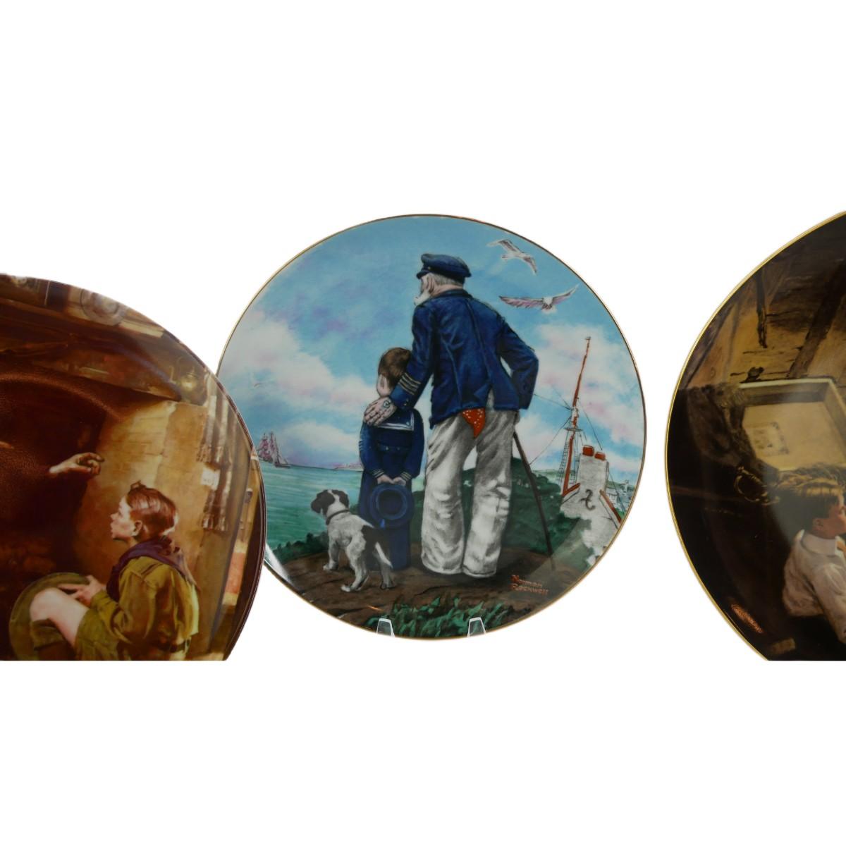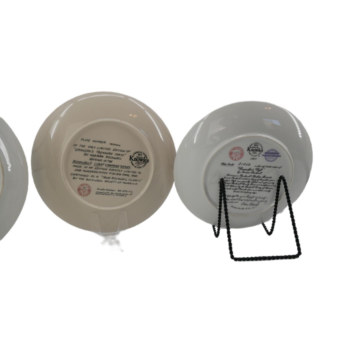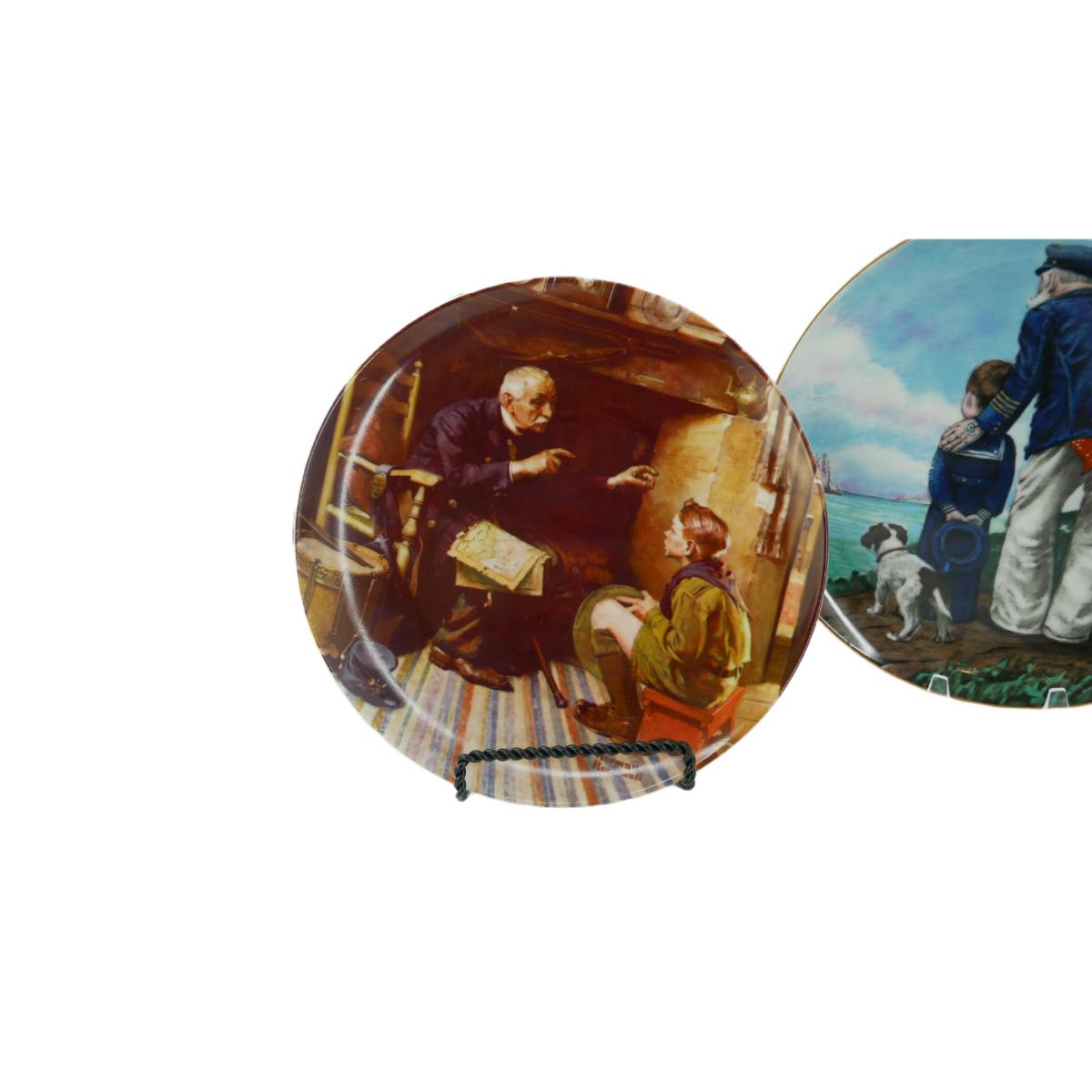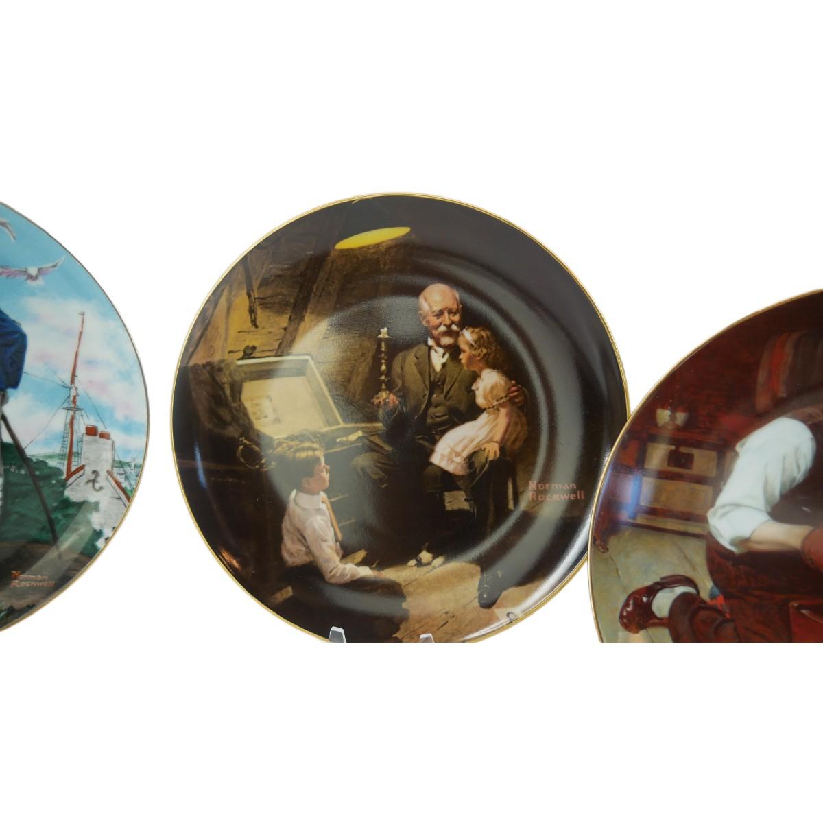Four vintage Norman Rockwell collectors plates. Limited edition Hetitage Collection 1988 "The Veteran" #9317F. Limited edition 1982 "Looking Out to Sea", banded in 22-karat gold - Royal Eaton, made in Japan. 1983 "Grandpa's Treasure Chest" in Light Campaign Series # 18234M. Limited edition 1987 "Grandpa's Gift" #2126G. All in excellent condition and measure 8-8.5" in diameter. Stands not included. Lot weighs 3 lb 5 oz. (C104)