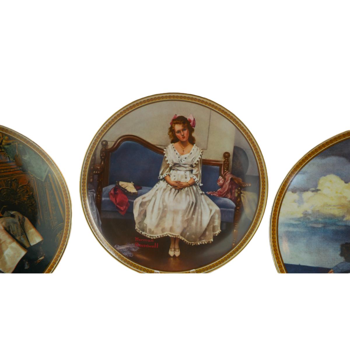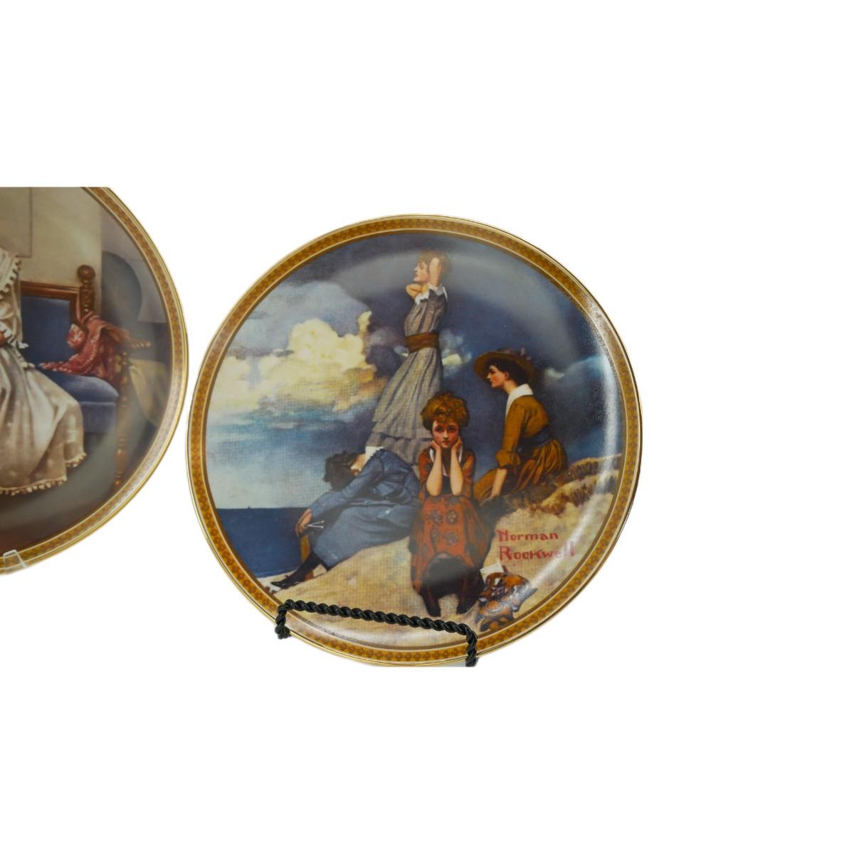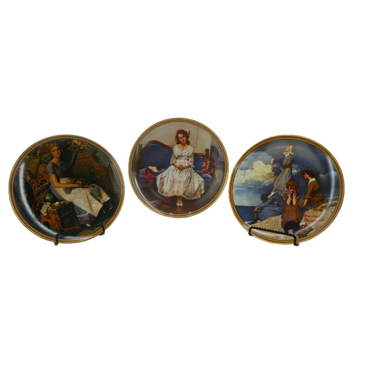 Three vintage Norman Rockwell collectors plates. Limited edition "Dreaming in the Attic" in Rediscovered Women Collection #1822Z. Limited edition 1983 "Waiting at the Dance" in Rediscovered Women Collection #7641O. Limited edition "Waiting on the Shore" in Rediscovered Women Collection #3917U. All in excellent condition. Stands not included. Each measures approximately 8.5" in diameter. Lot weighs 2 lb 6 oz. (C105)
