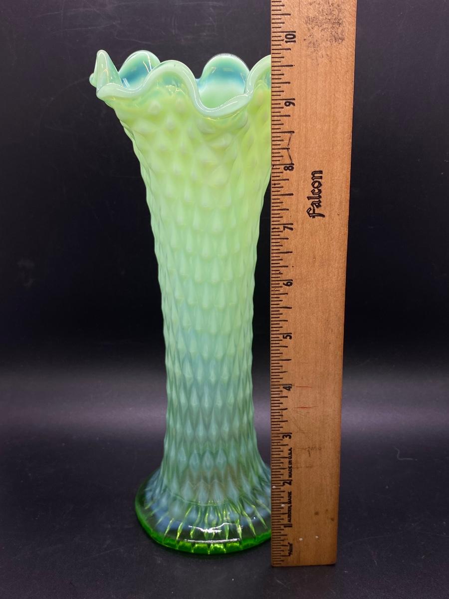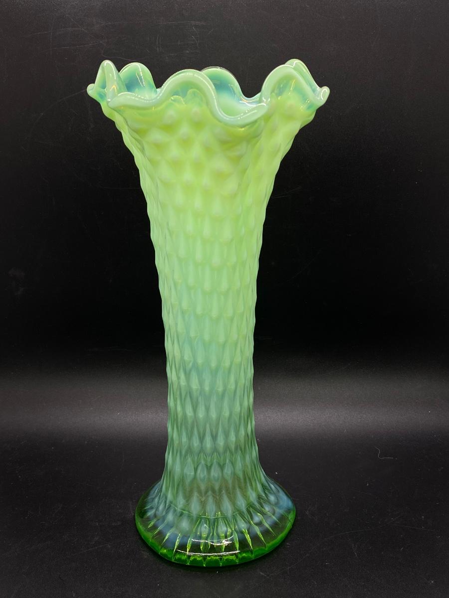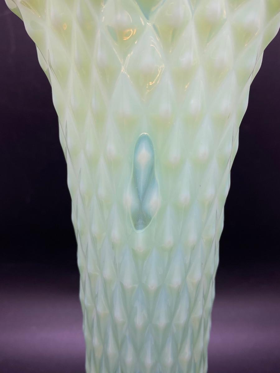 Northwood electric green opalescent swung vase. Stretched diamond pattern. Looks like vaseline glass but is not. In good condition other than the odd flaw in the opaque finish. It looks like a stretched bubble flaw in glass. About 10" size.