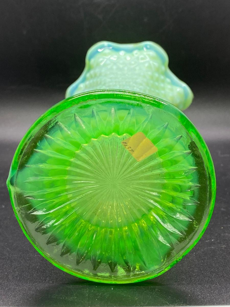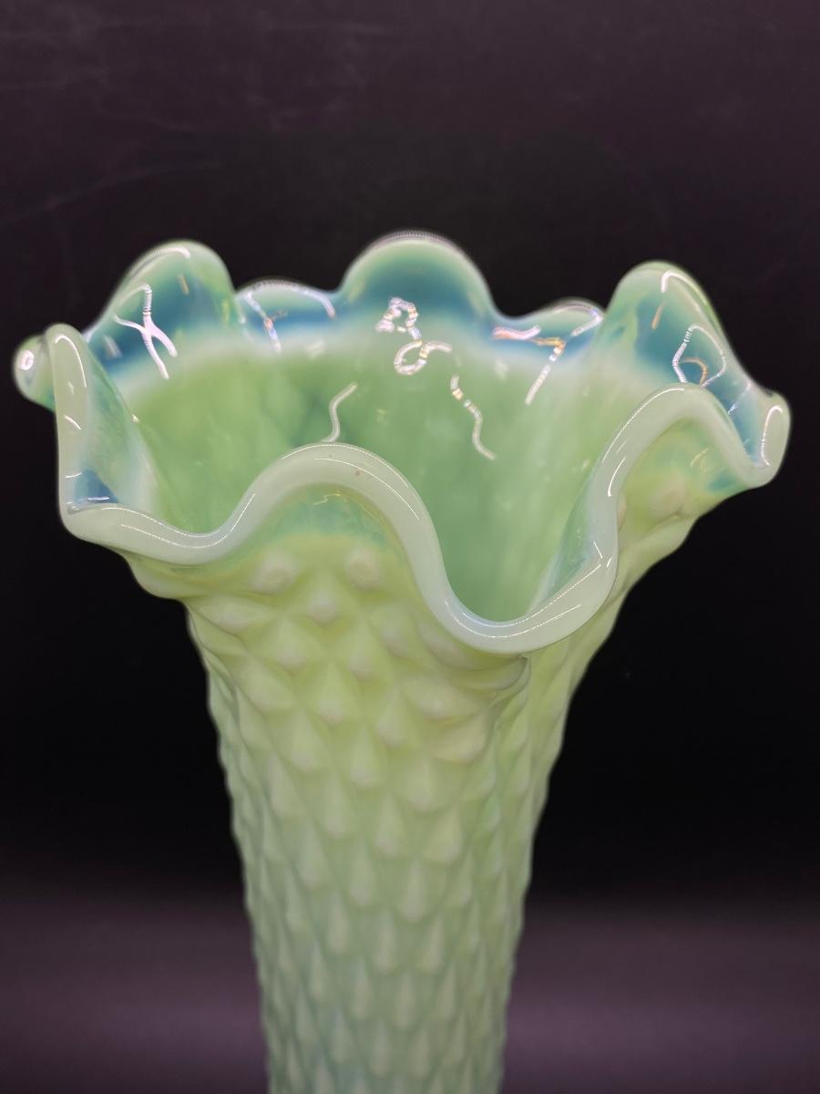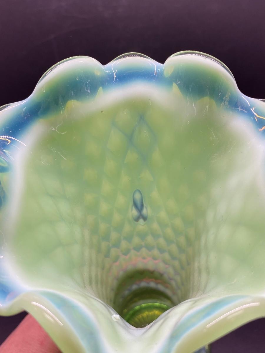 Northwood electric green opalescent swung vase. Stretched diamond pattern. Looks like vaseline glass but is not. In good condition other than the odd flaw in the opaque finish. It looks like a stretched bubble flaw in glass. About 10" size.