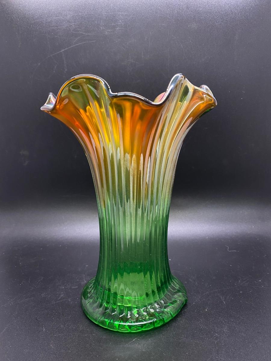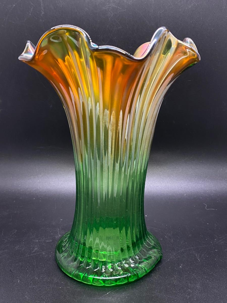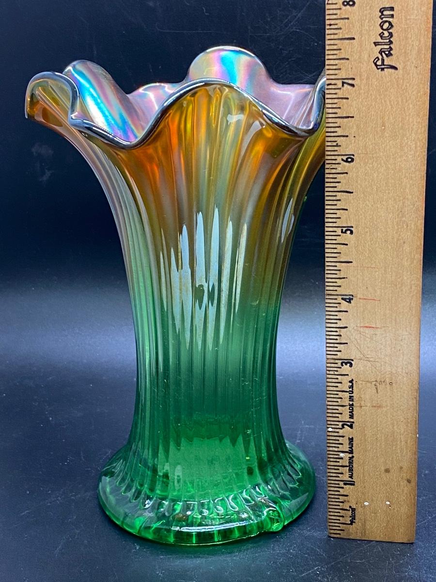 Beautiful vintage Northwood squatty vase. Amber to green ribbed carnival glass. Only 7" tall, in good condition. There is a nub flaw along the edge of the base, it's not damaged just a bump in the glass.