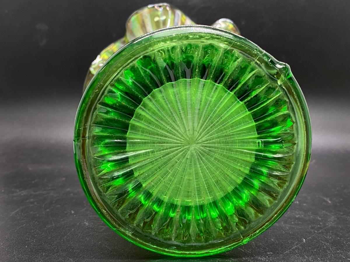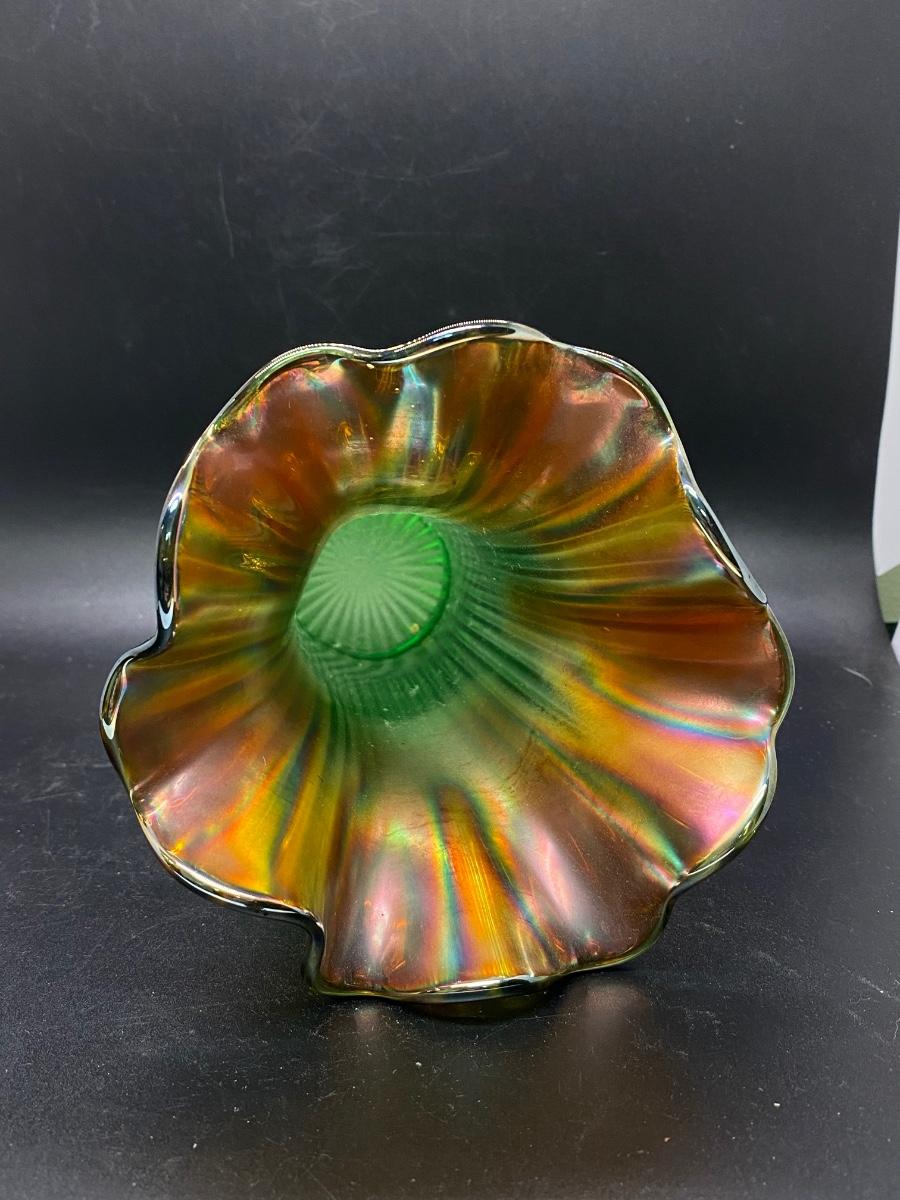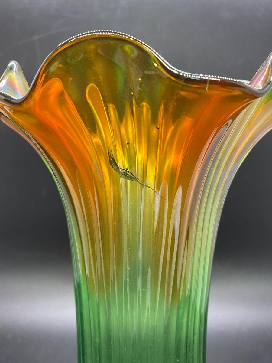 Beautiful vintage Northwood squatty vase. Amber to green ribbed carnival glass. Only 7" tall, in good condition. There is a nub flaw along the edge of the base, it's not damaged just a bump in the glass.