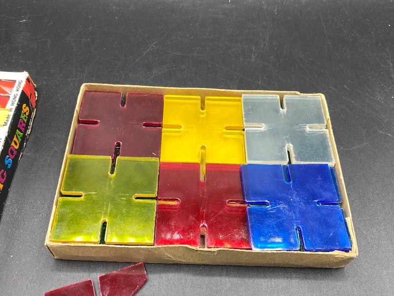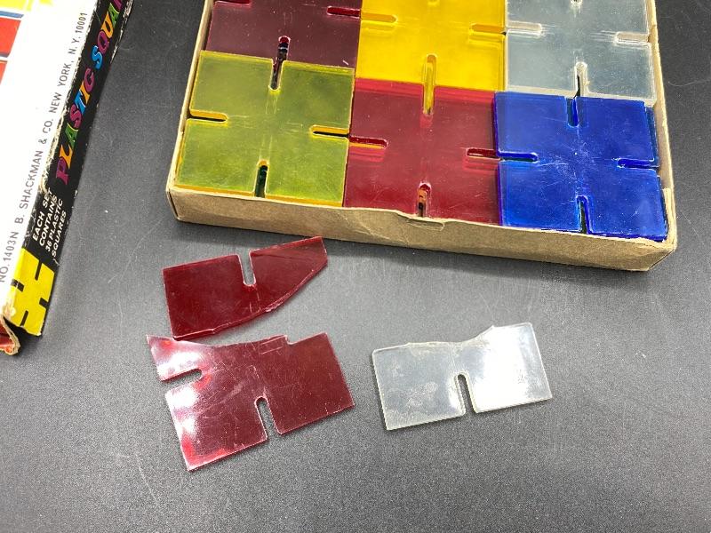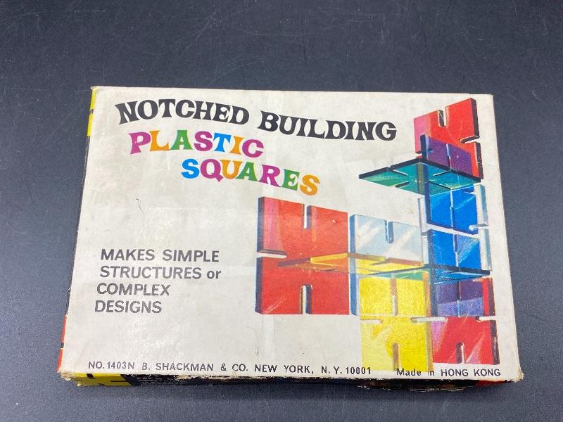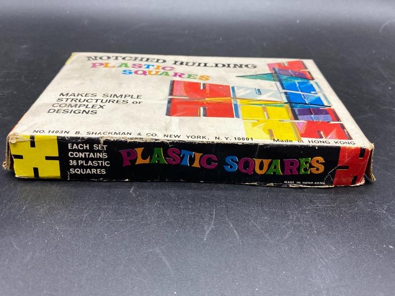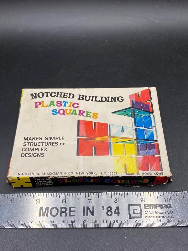 Vintage Notched Building Plastic Squares. Made in Hong Kong. Originally had 36 squares but a couple are broken and one is missing.