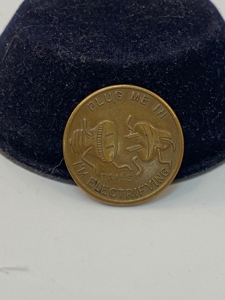 Vintage Novelty Heads Tails Coin. One side has a nut chasing bolt saying "No! Not Without a Washer" and the other side is a plug and outlet "Plug Me in I'm Electrifying".