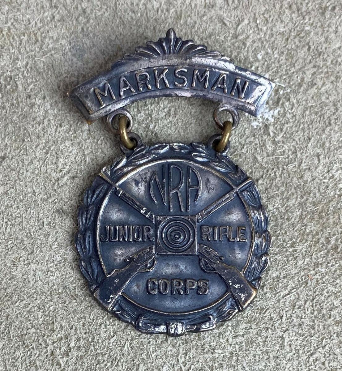 vintage Marksman medal from the National Rifle Association's Junior Rifle Corps...Exact age unknown..The NRA's interest in promoting the shooting sports among America's youth began in 1903 when NRA Secretary Albert S. Jones urged the establishment of rifle clubs..still a cornerstone of the organziation...as shown...30mm.