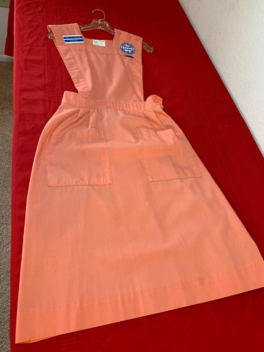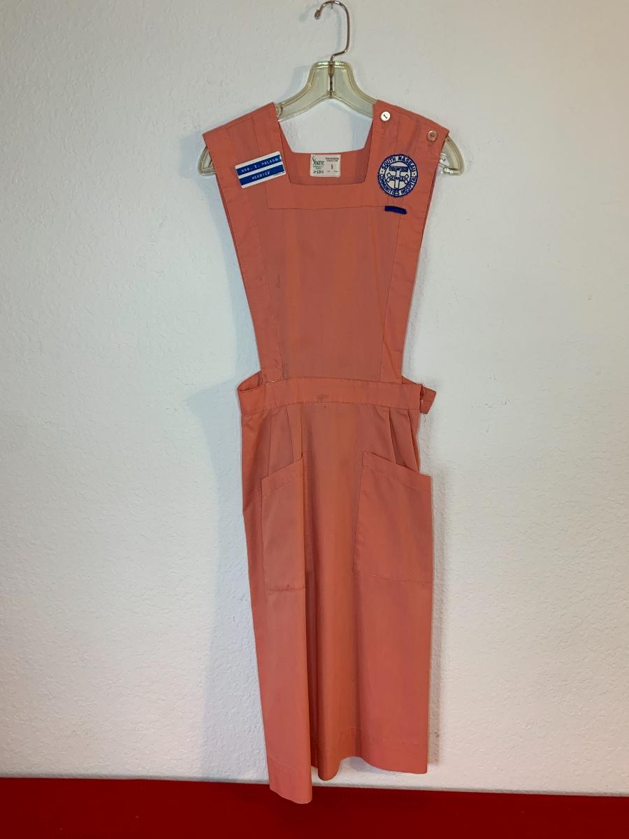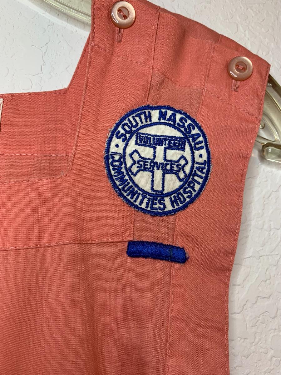Vintage Nurse uniform in a salmon color with name tag from South Nassau Volunteer Services Community Hospital. In great, original vintage condition