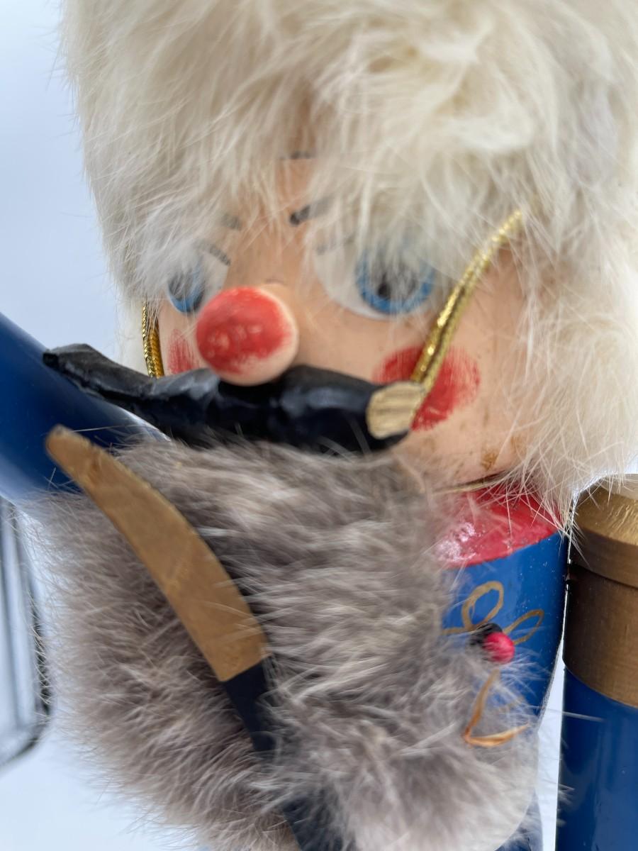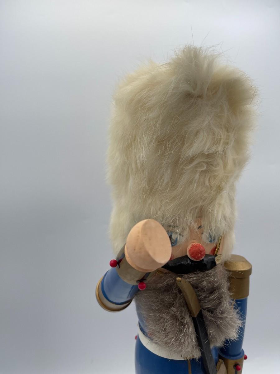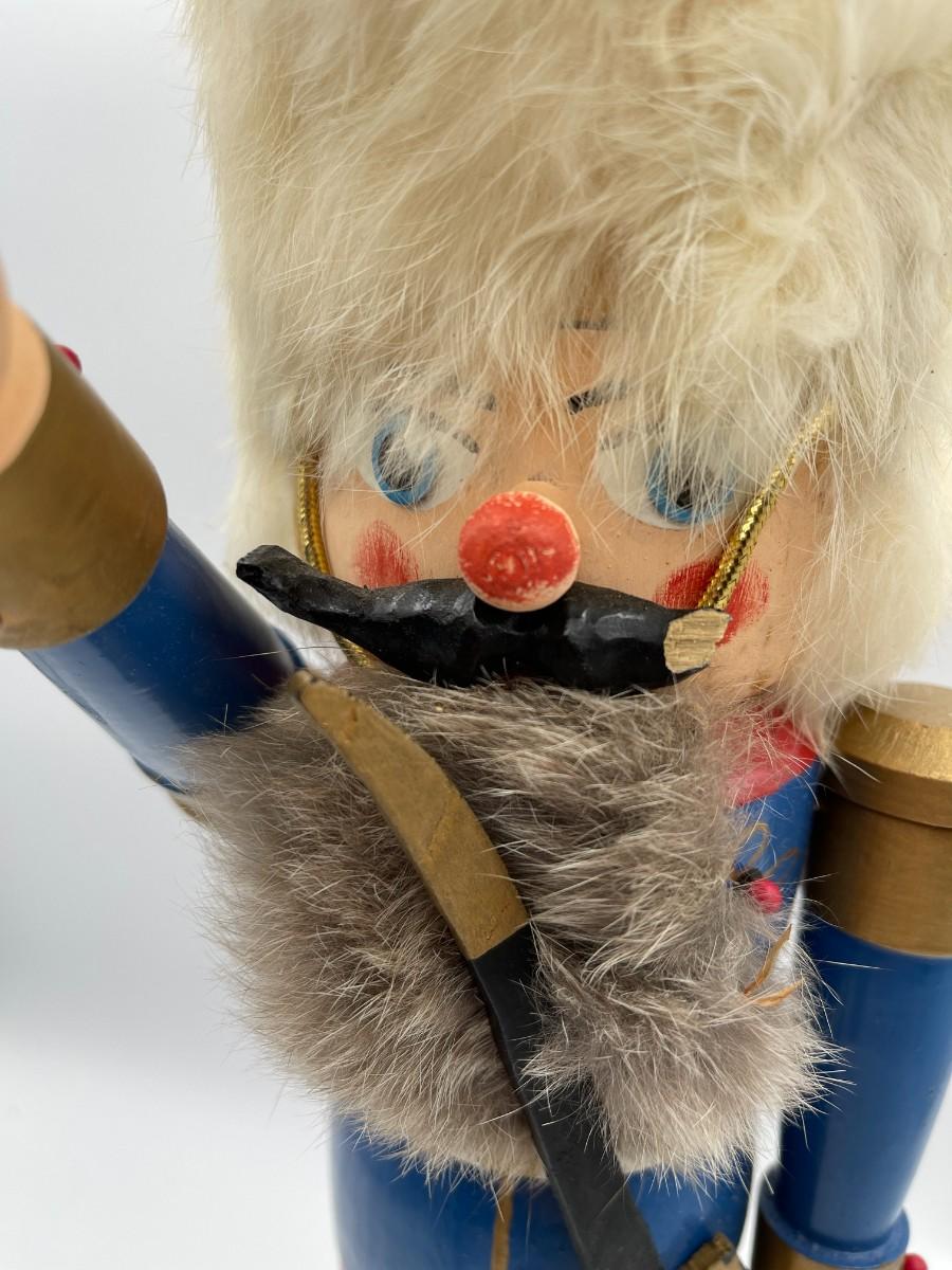 We can't find much on this artist, but clearly he was talented as we have seen others before. Charming nutcracker, in blue & red, with a furry beard, furry hat, & charming mustache. This guy has soldiered on through 41 Christmases -- so, we are selling him as is. 16.5" H # 824