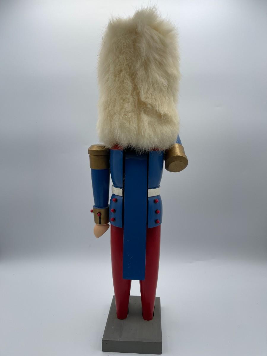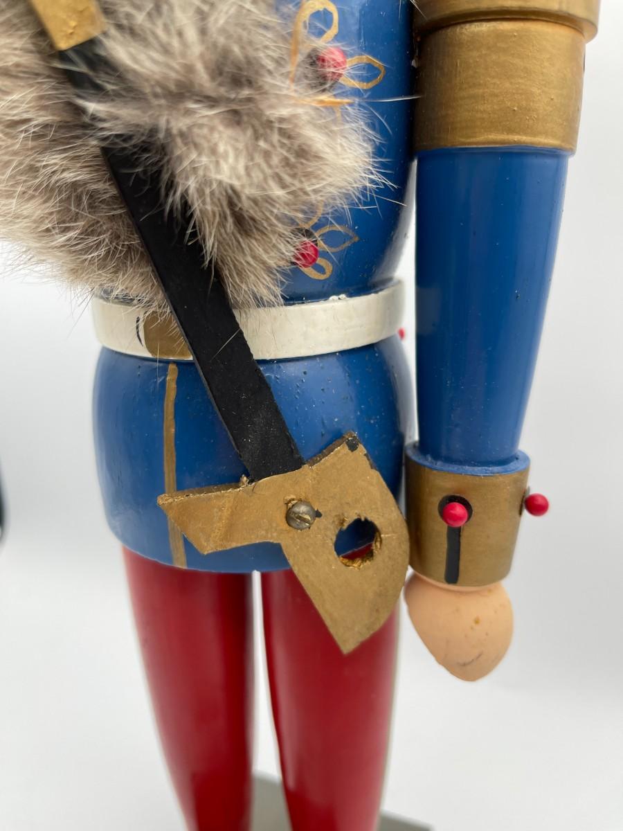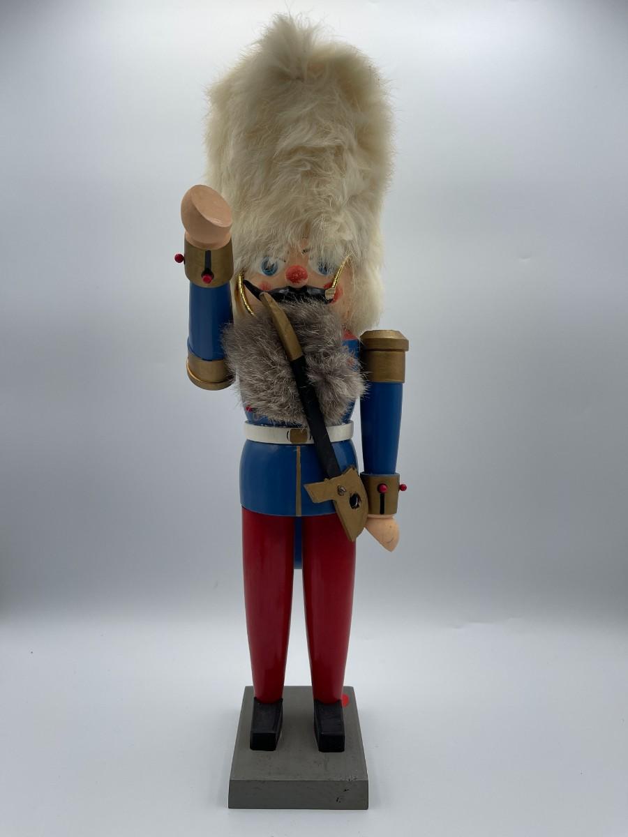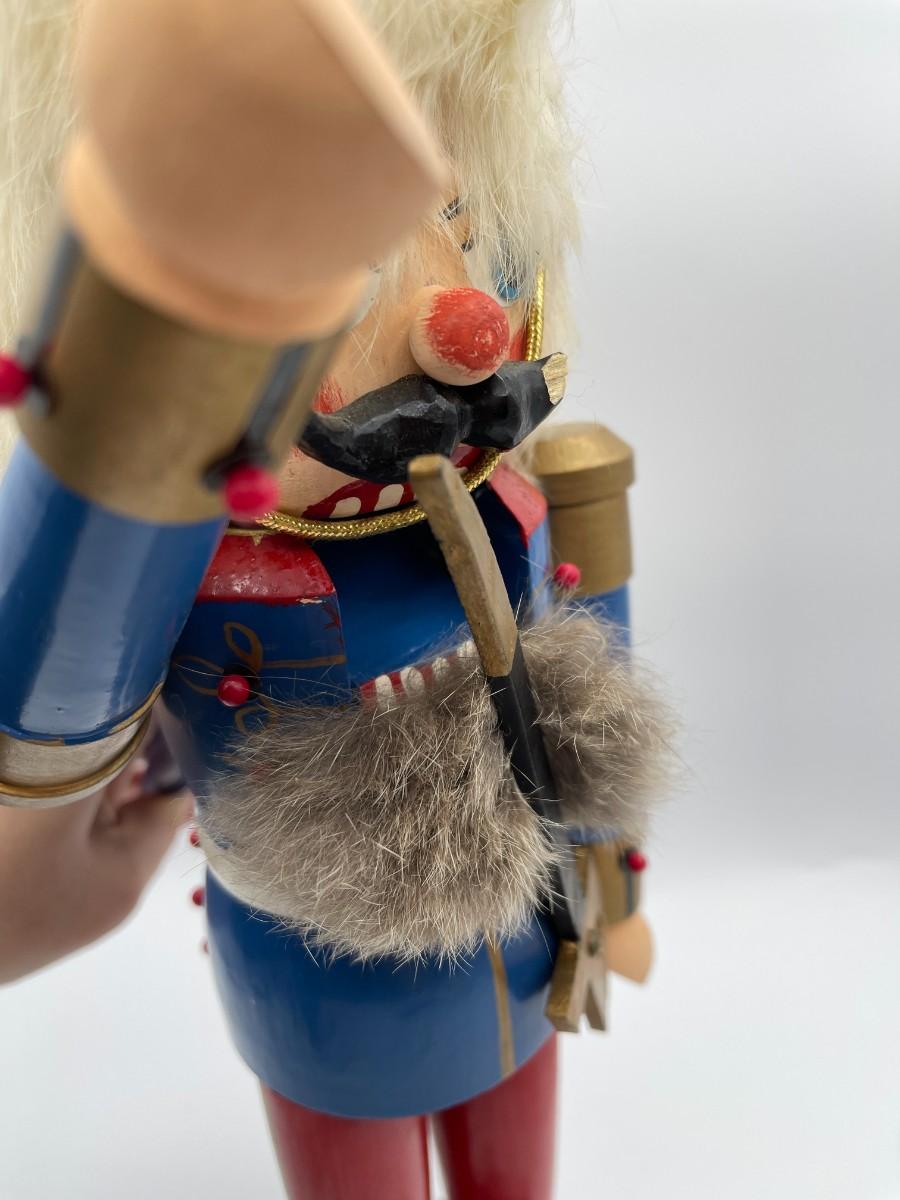 We can't find much on this artist, but clearly he was talented as we have seen others before. Charming nutcracker, in blue & red, with a furry beard, furry hat, & charming mustache. This guy has soldiered on through 41 Christmases -- so, we are selling him as is. 16.5" H # 824