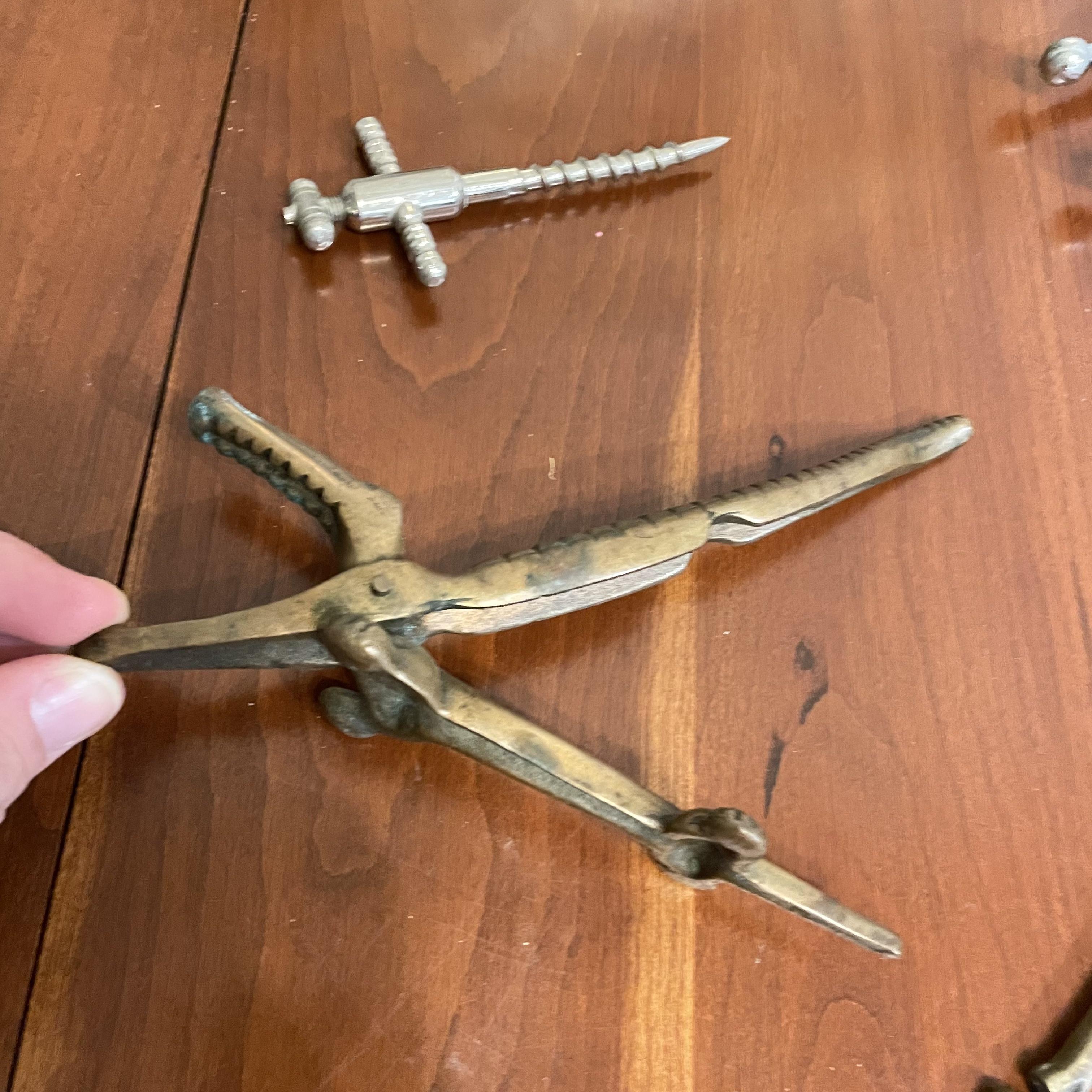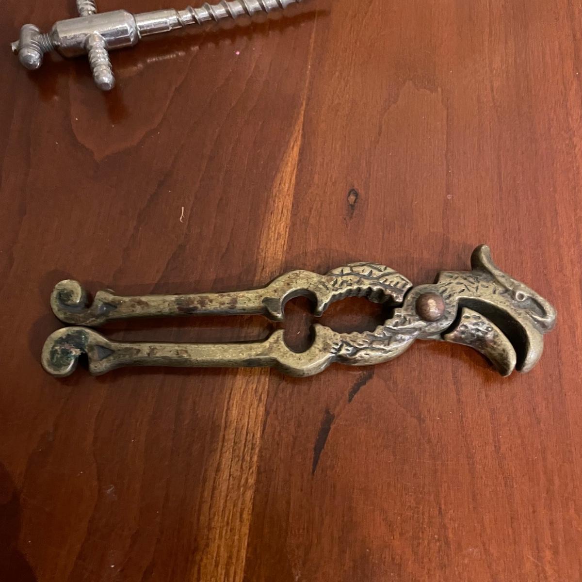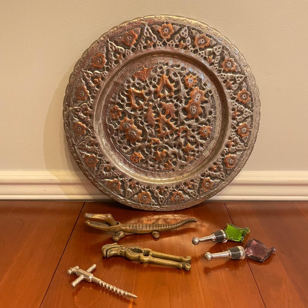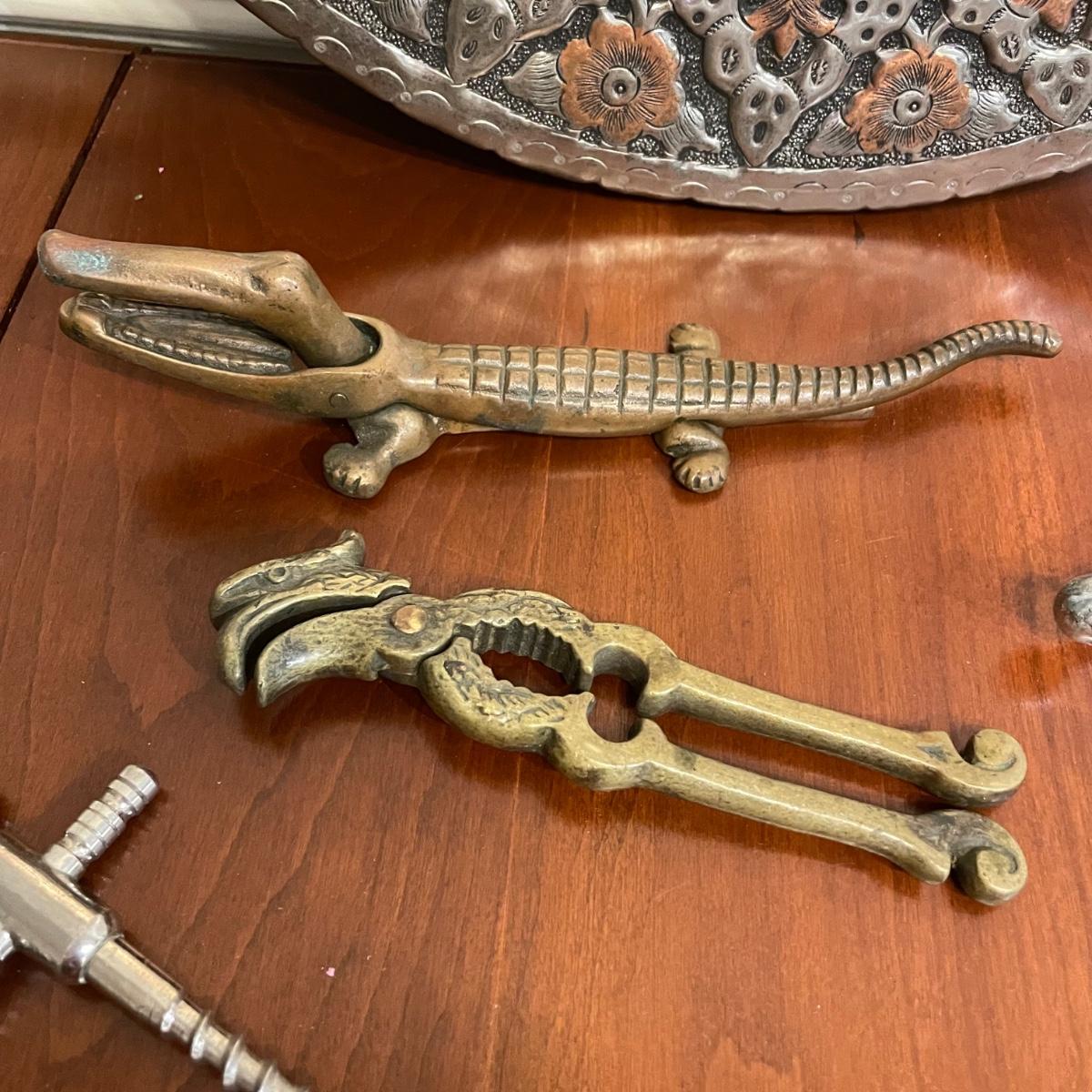 Vintage nutcrackers and bottle openers in the shapes of alligator and eagle. Two blown glass bottle stoppers with a vintage corkscrew. The tray measures 15” in diameter and appears to be copper with silver plate with hardware to hang it on a wall. See images. Shipping available.