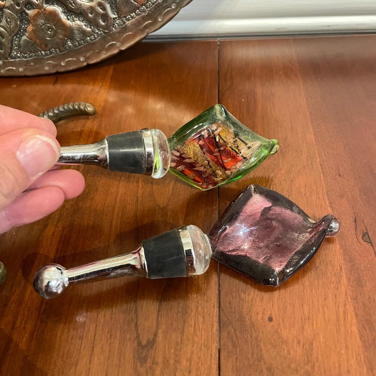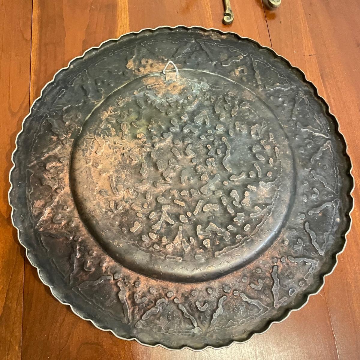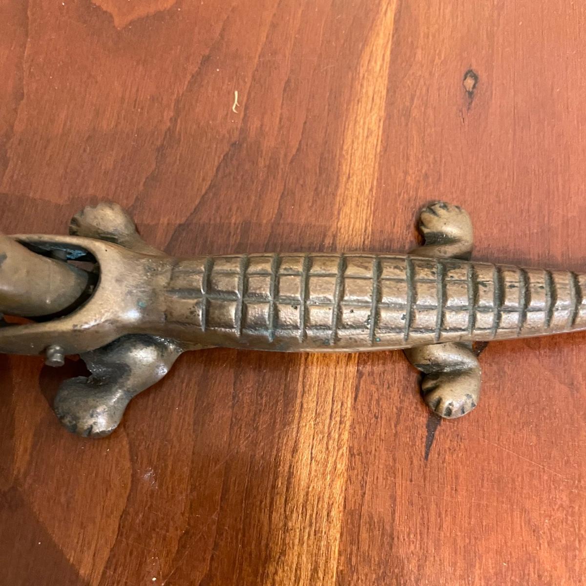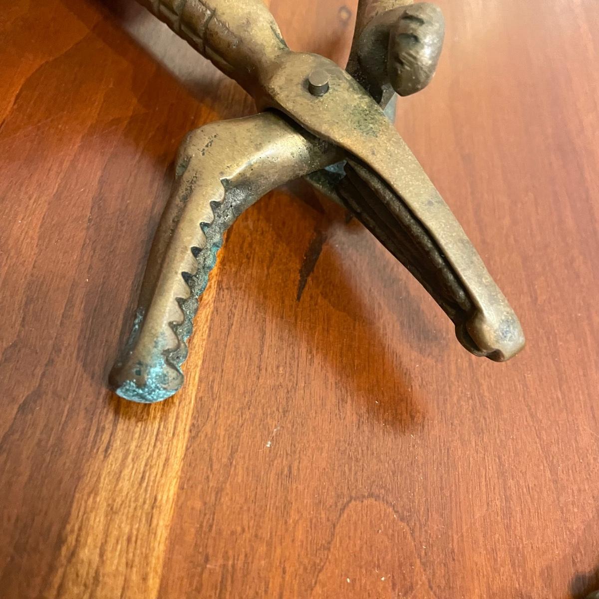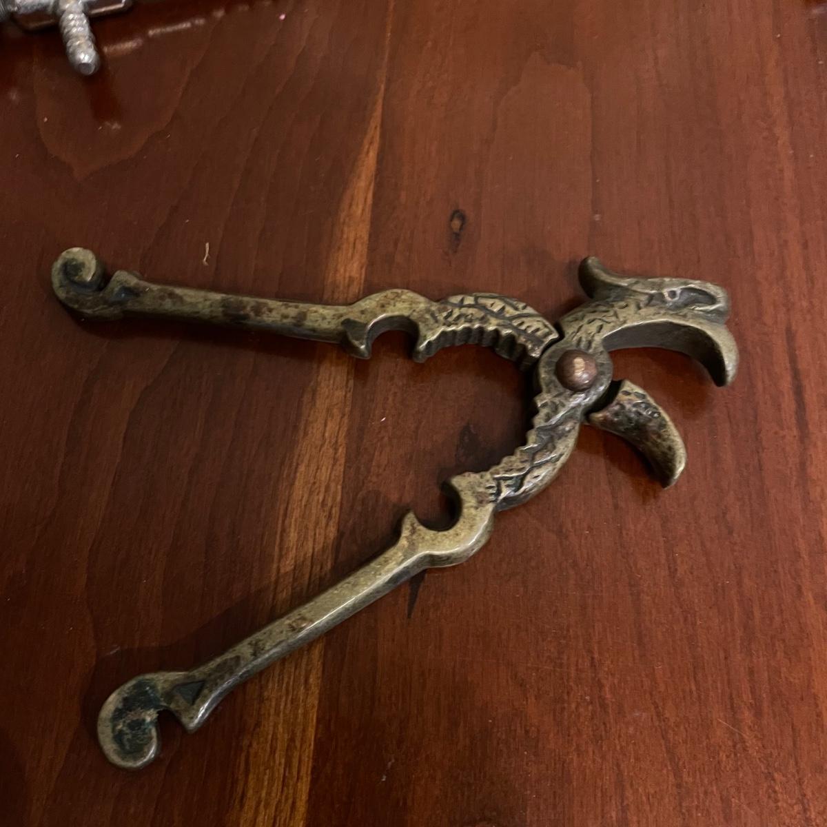 Vintage nutcrackers and bottle openers in the shapes of alligator and eagle. Two blown glass bottle stoppers with a vintage corkscrew. The tray measures 15” in diameter and appears to be copper with silver plate with hardware to hang it on a wall. See images. Shipping available.
