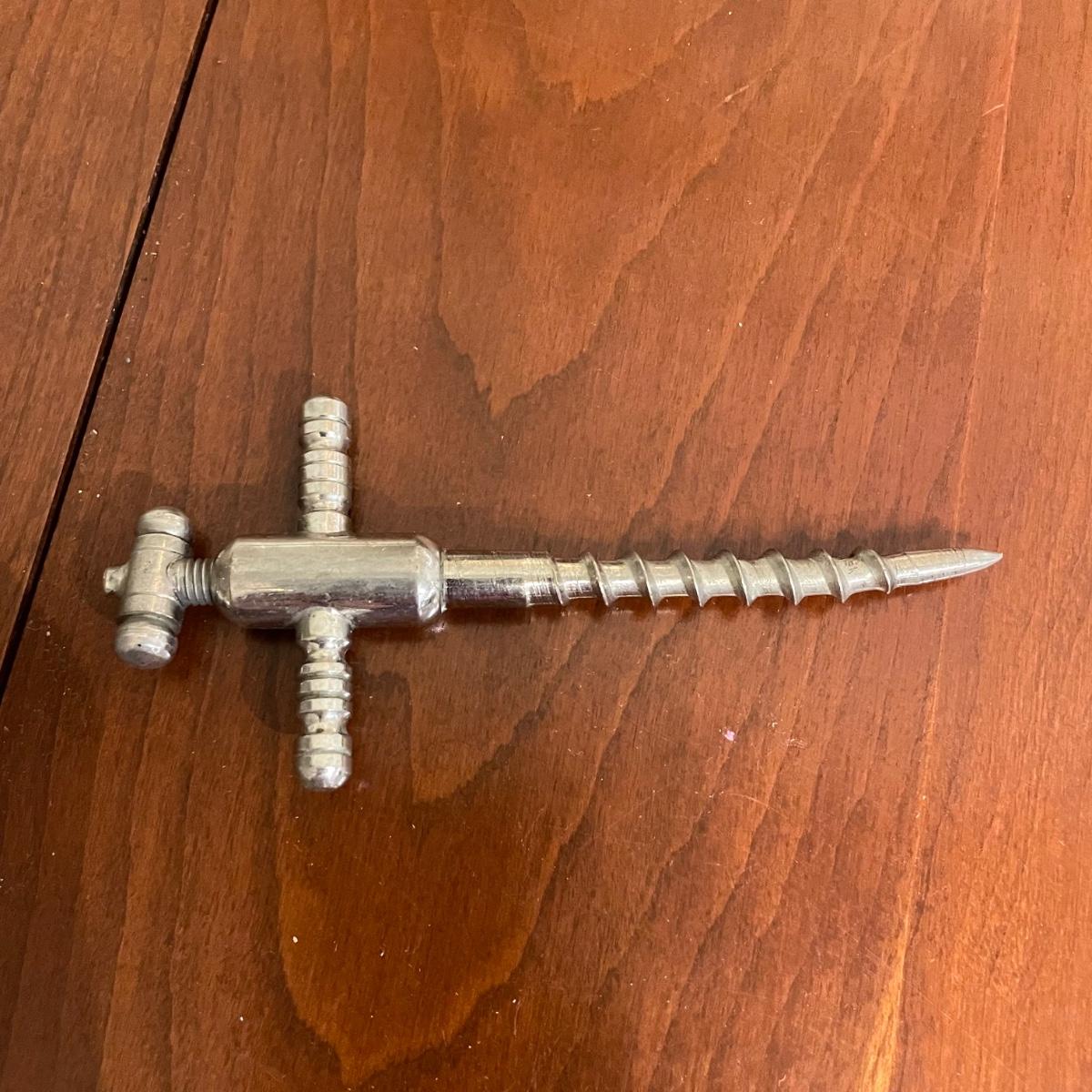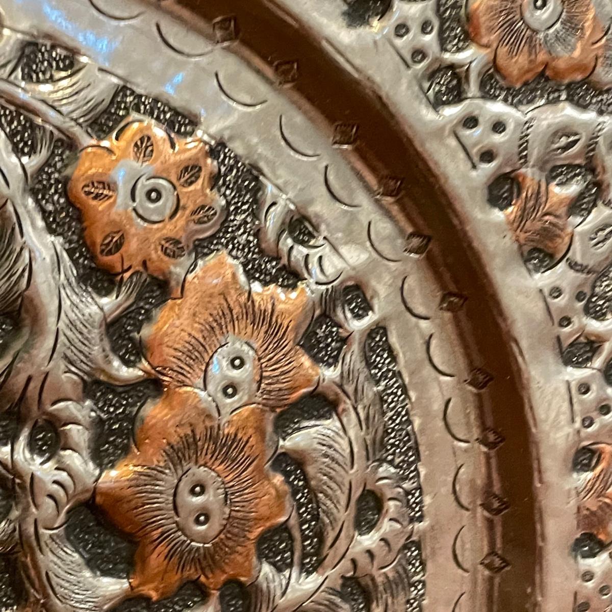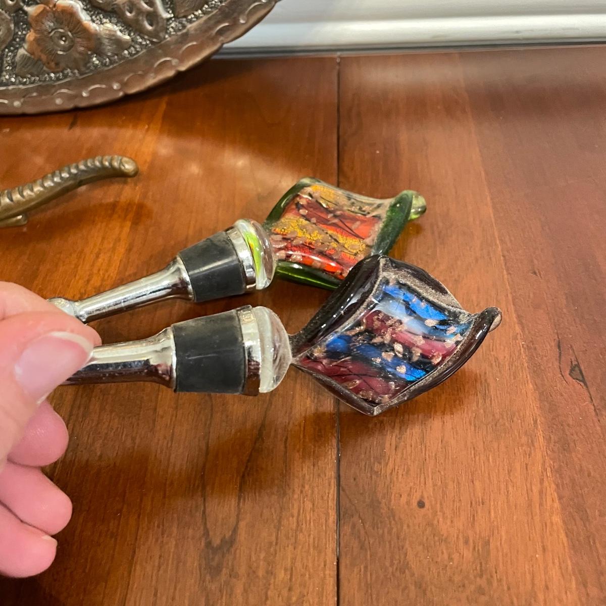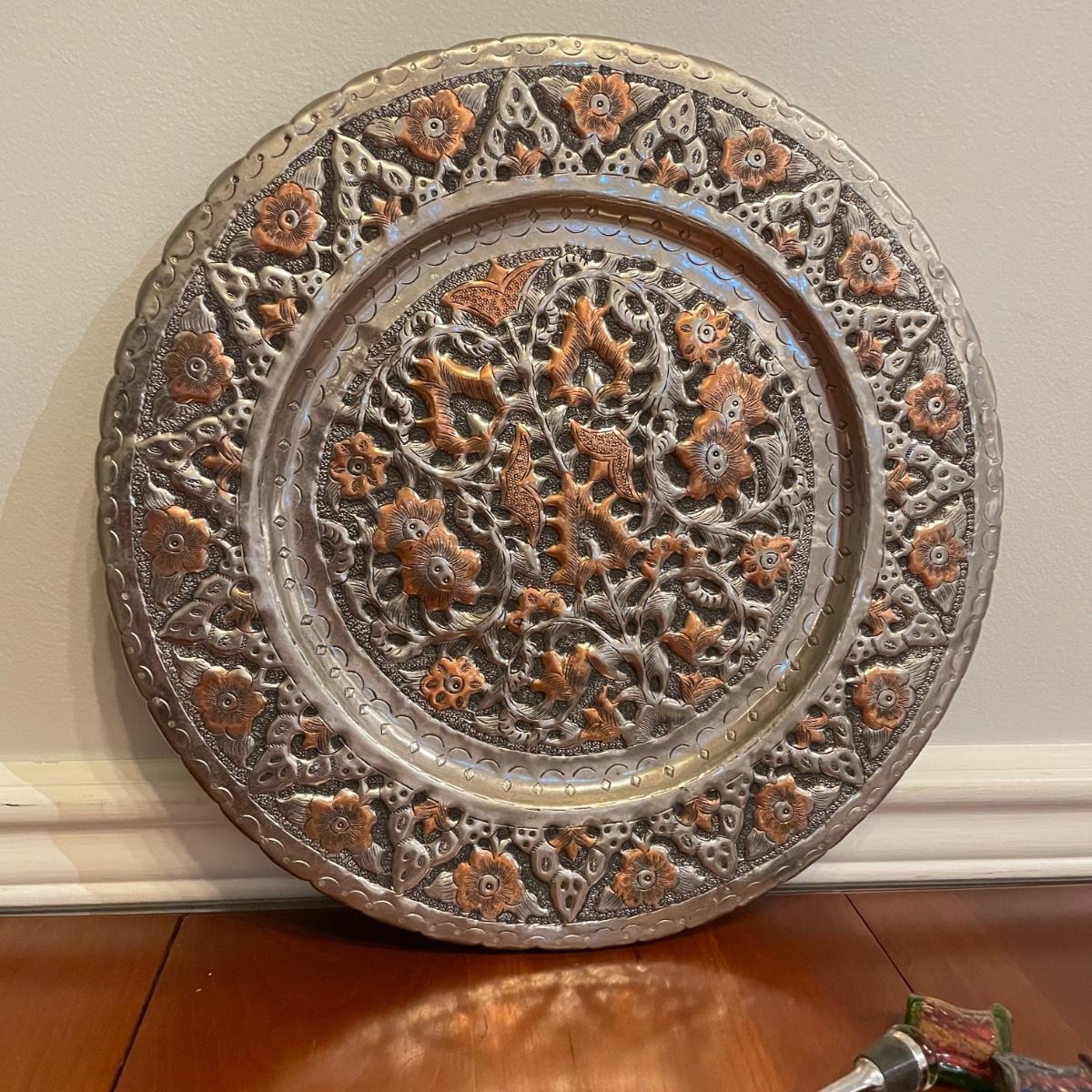 Vintage nutcrackers and bottle openers in the shapes of alligator and eagle. Two blown glass bottle stoppers with a vintage corkscrew. The tray measures 15” in diameter and appears to be copper with silver plate with hardware to hang it on a wall. See images. Shipping available.