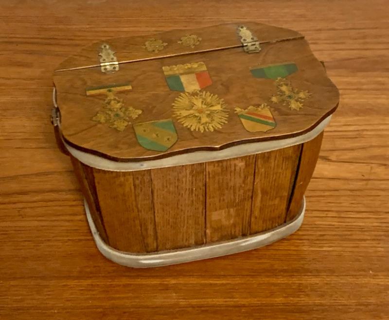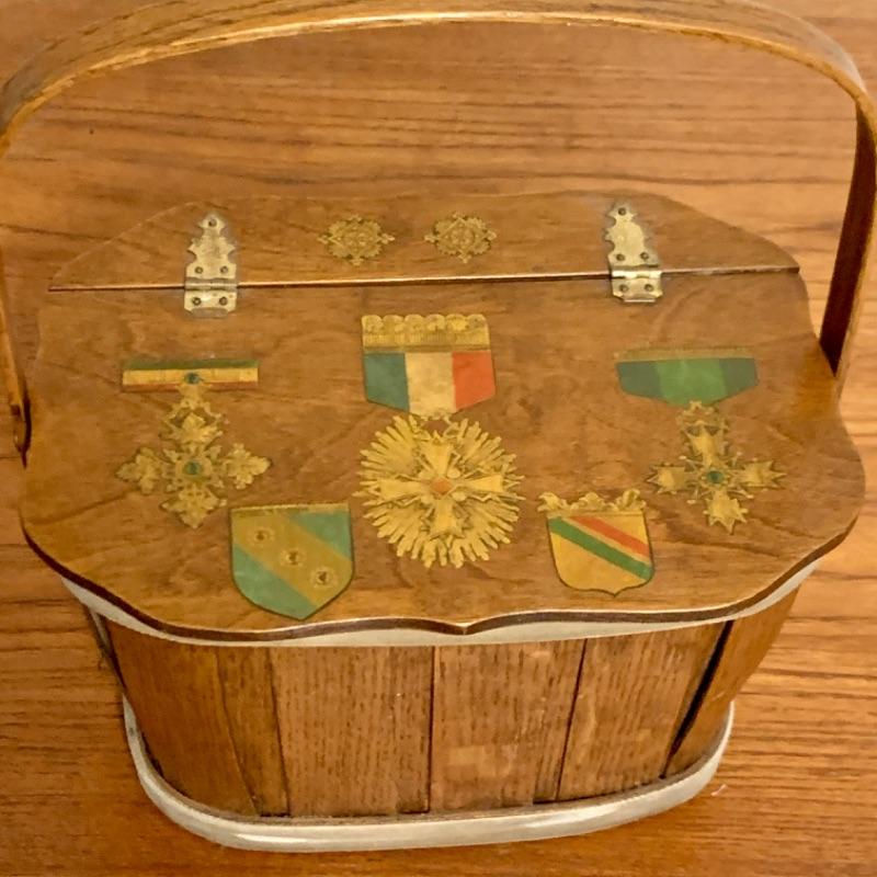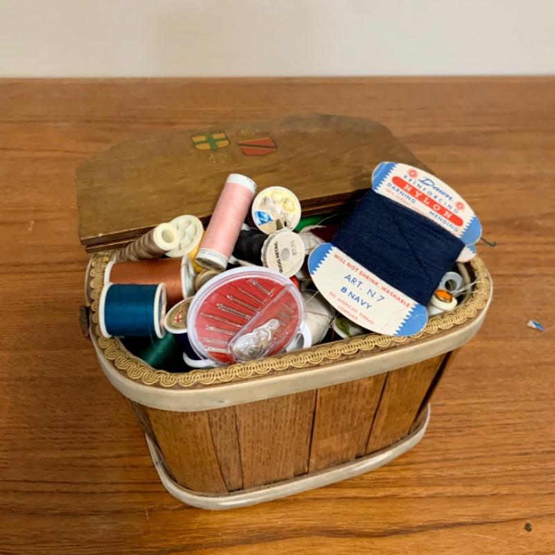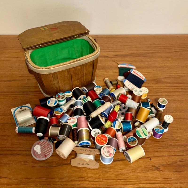 Variety lot of vintage thread and vintage lined oak basket, marked 1969. Measures 9 1/2' x 7" x 6 1/4".
