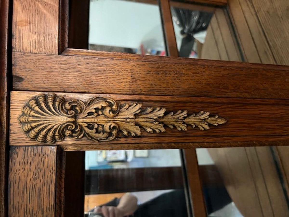 Includes key. Mirrors are intact, but glass has been removed. Age related wear. Measurement: 59"H x 37"W x 16.5"D.
