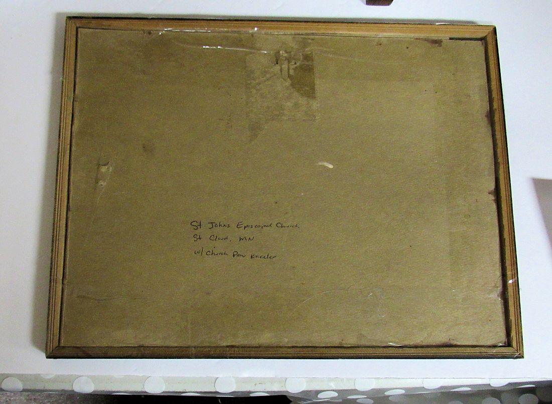 Good condition. The kneeler and picture are from the St, John's Episcopal Church in St. Cloud, Minnesota, which burned down and only a few items were saved from the church. This being two of them.