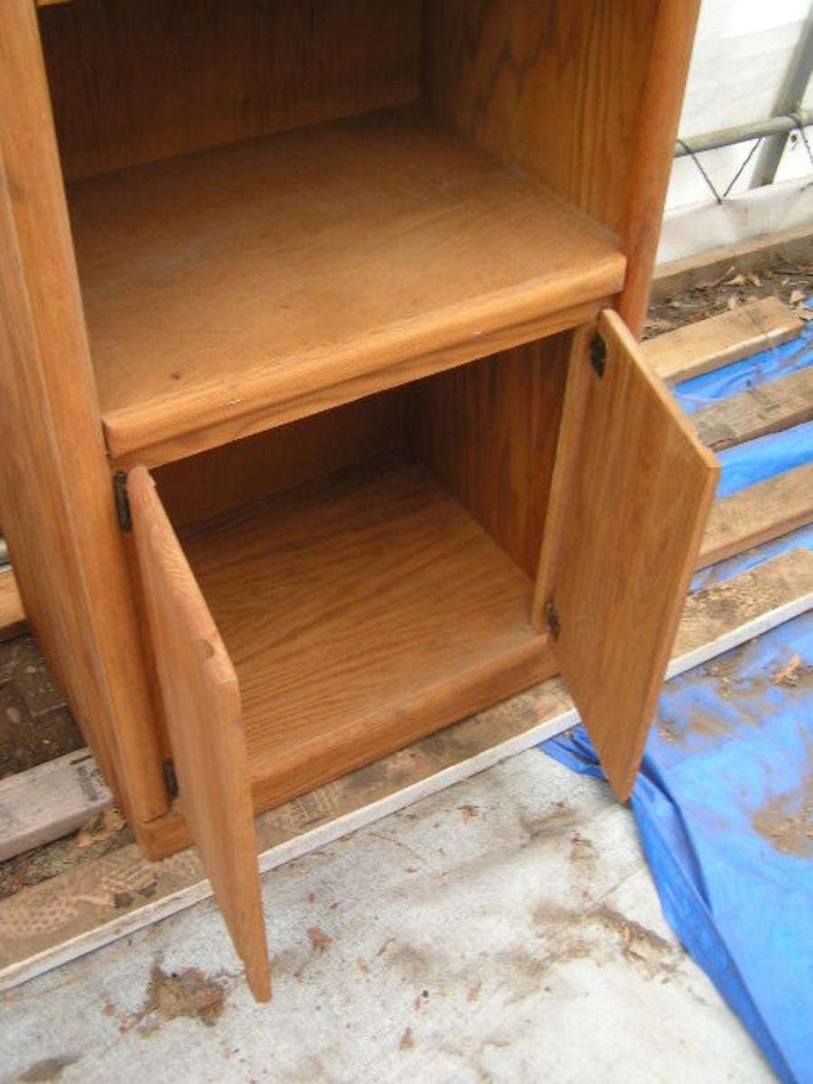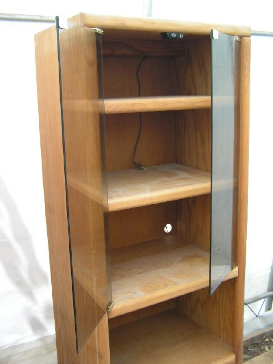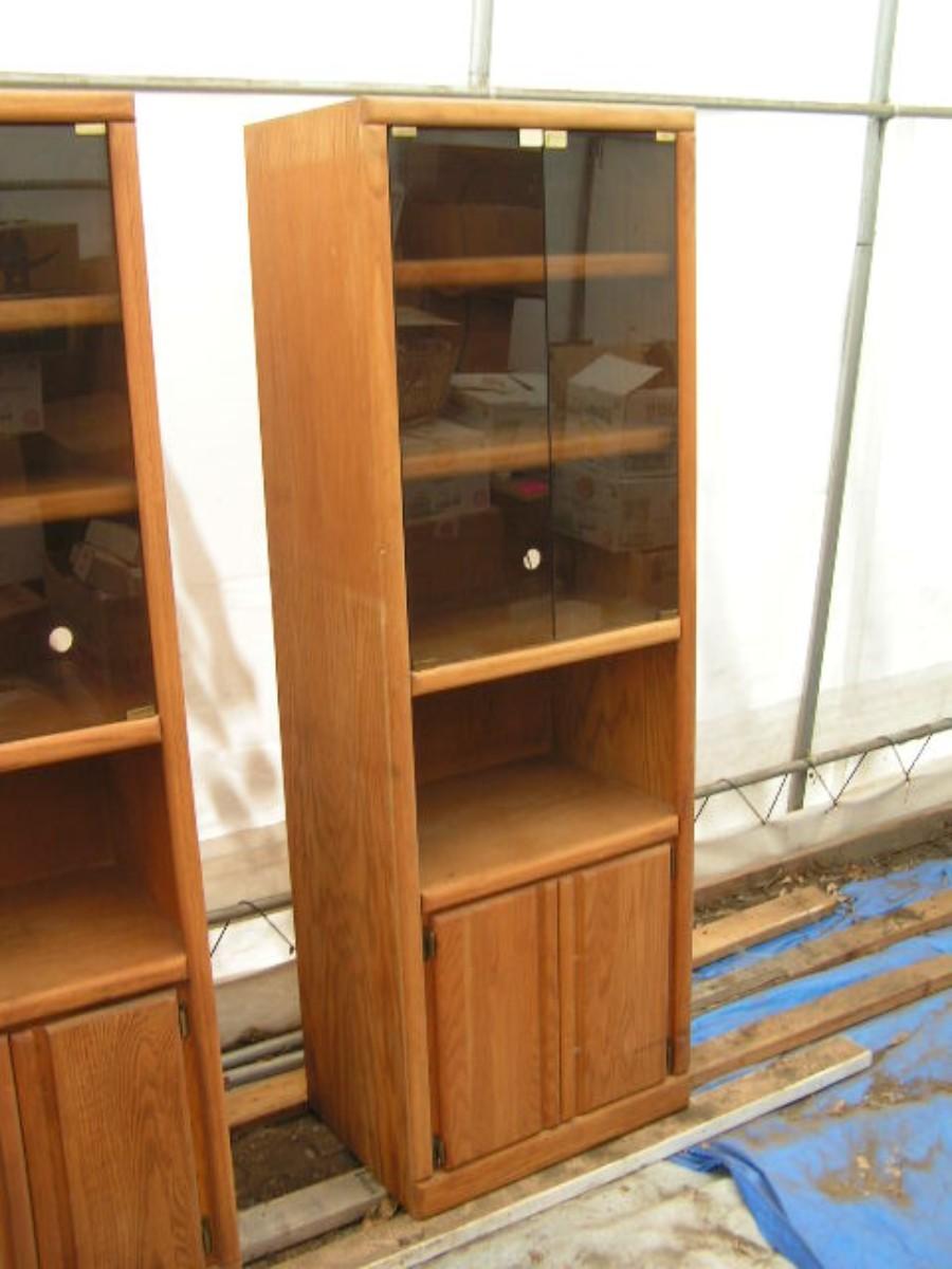 More furniture like this elsewhere in this sale. Vintage oak credenza bookcase (#1 of the pair) Has solid oak fascia & doors, real oak veneer premium plywood panels & shelves, adjustable shelves, tinted glass doors, ball casters, light inside top. (NO particle board) About 73-1/2 tall x 17"deep x 24" wide. This matches items 14 & 16.