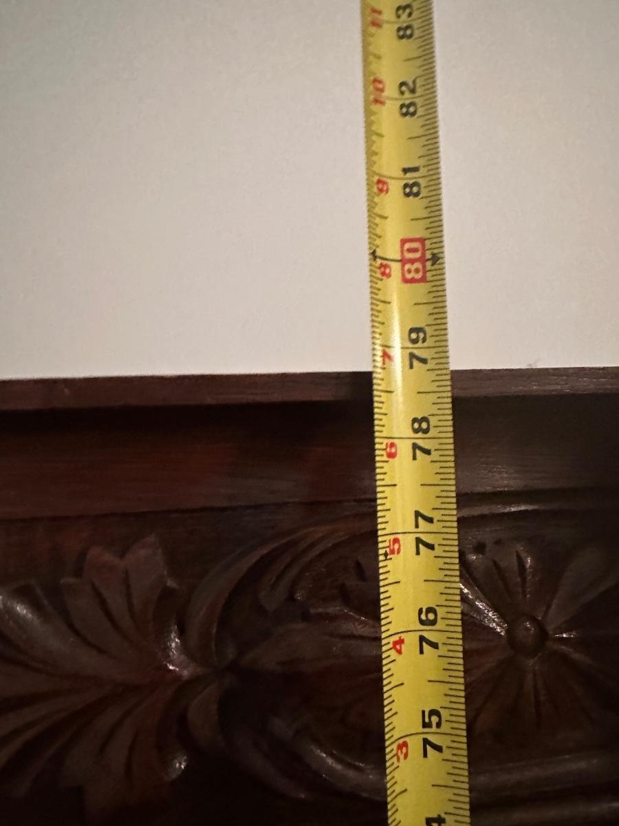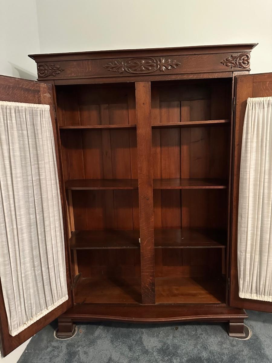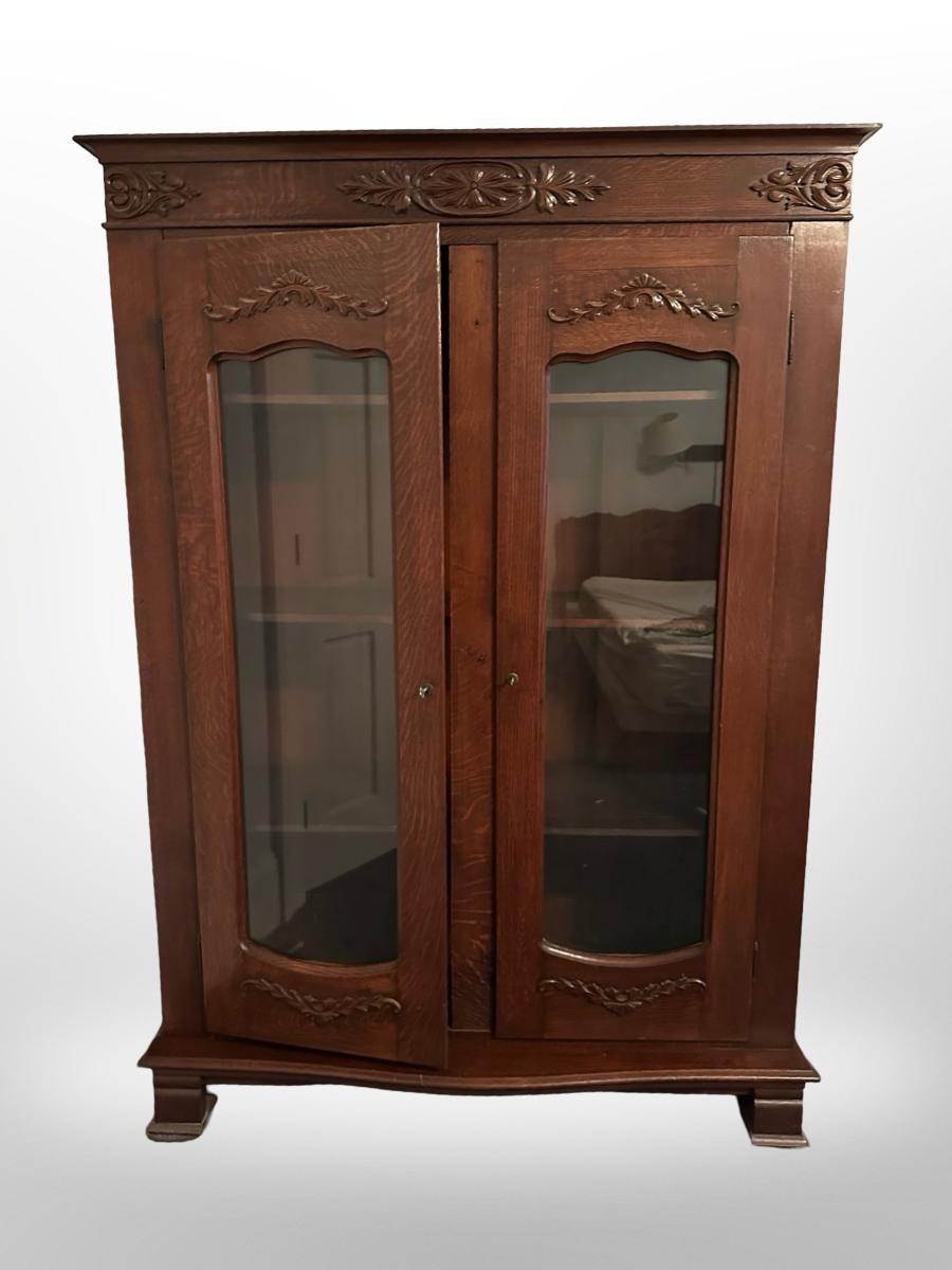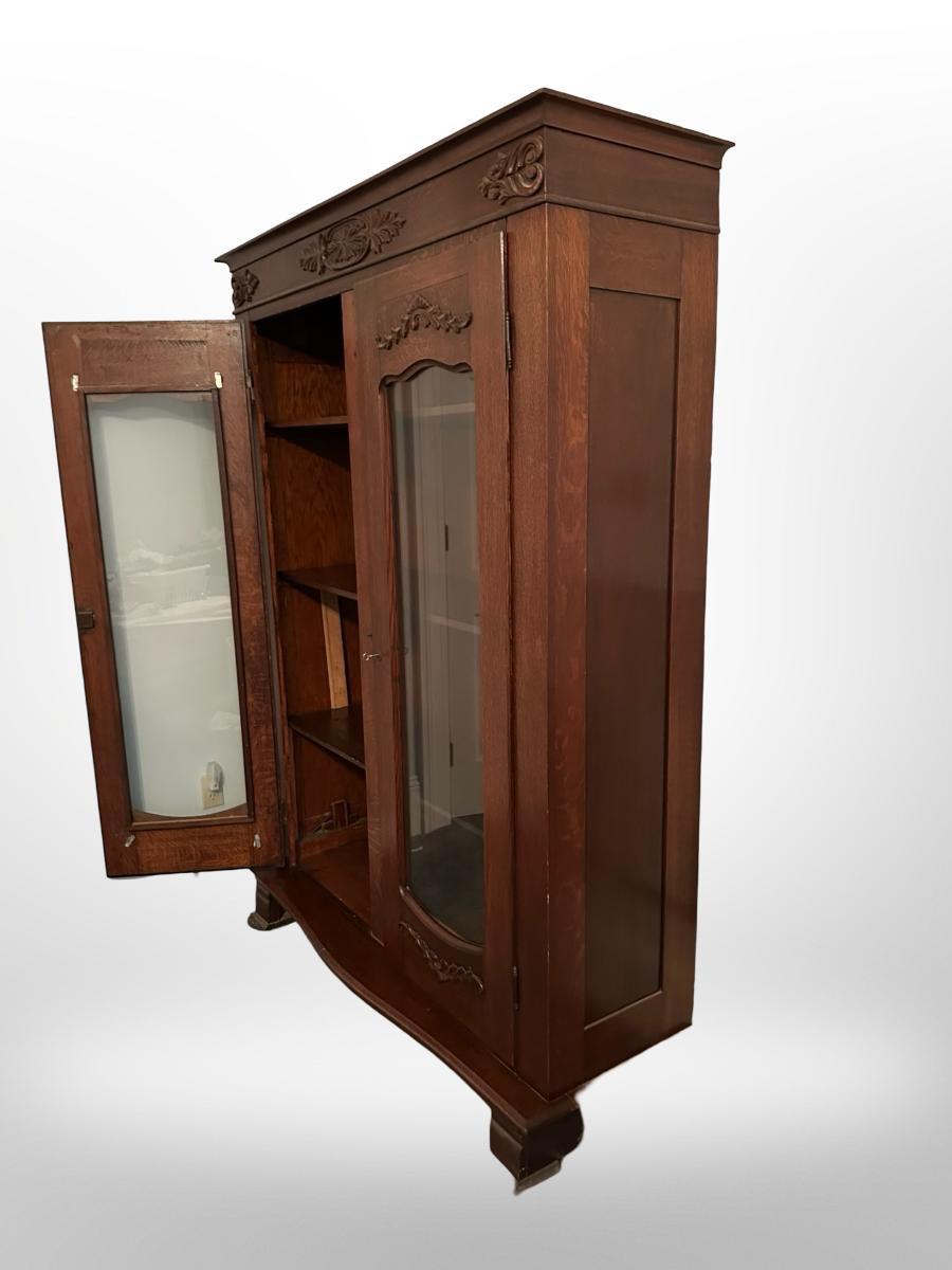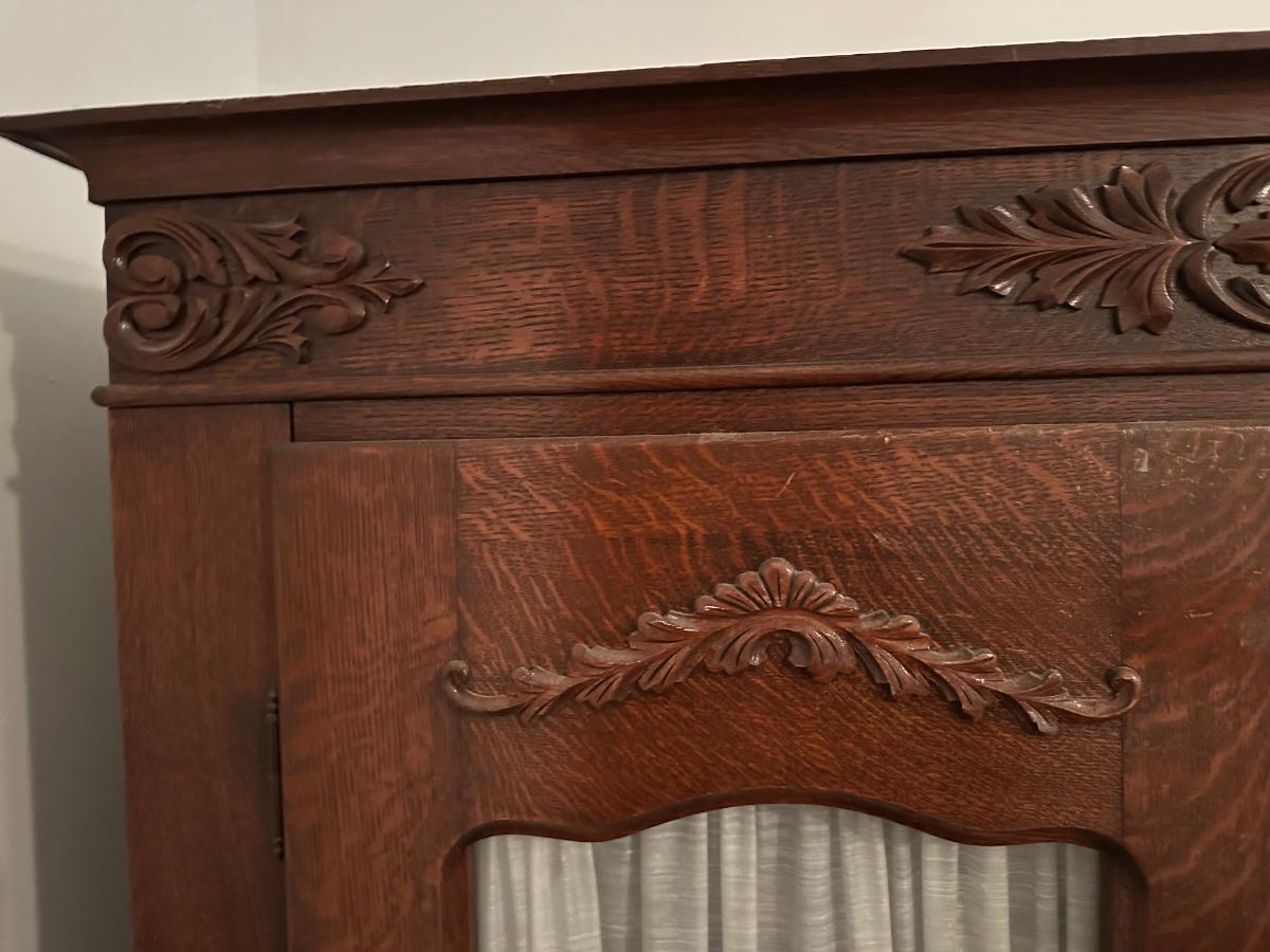 Vintage Oak Display Cabinet with Carved Details & Glass Doors
