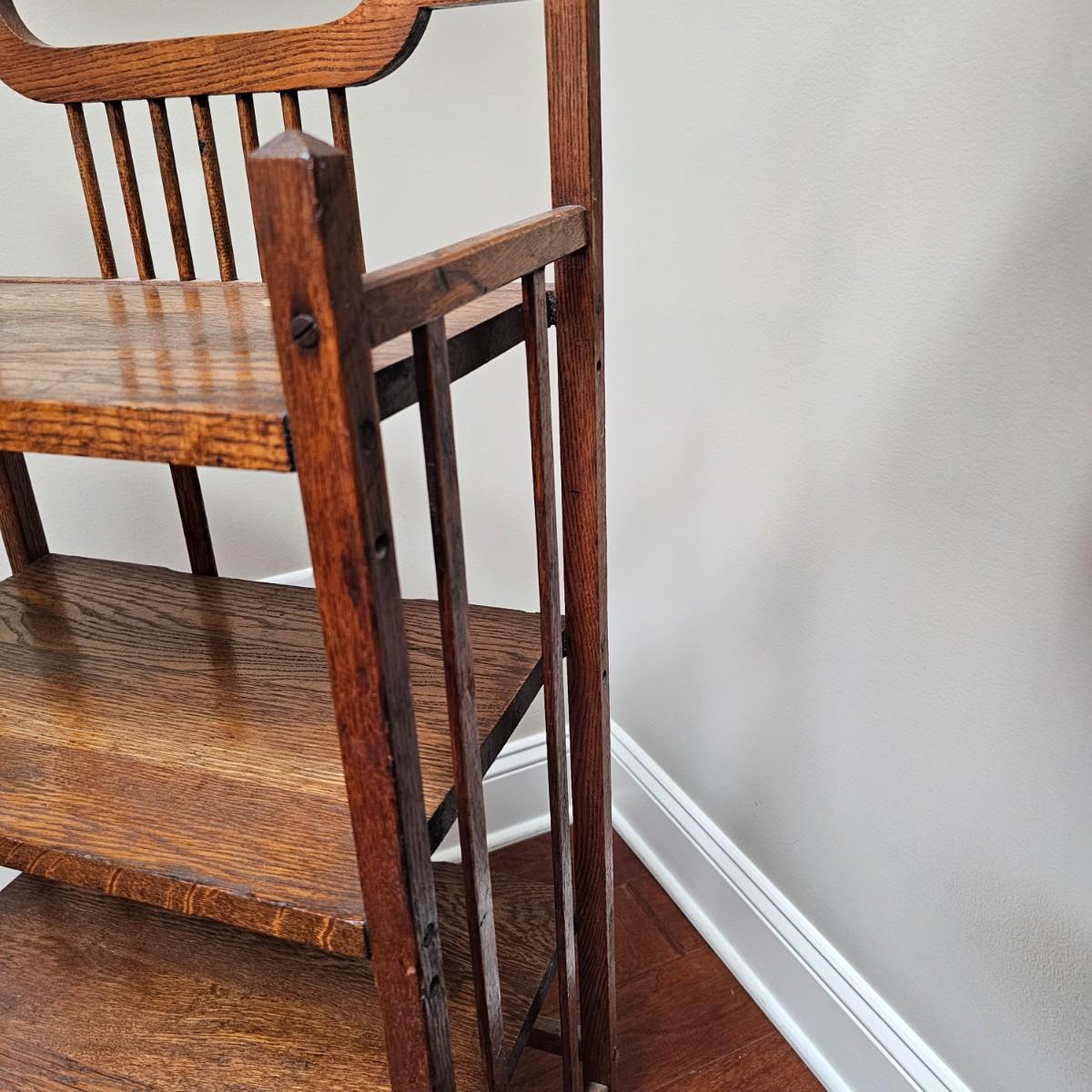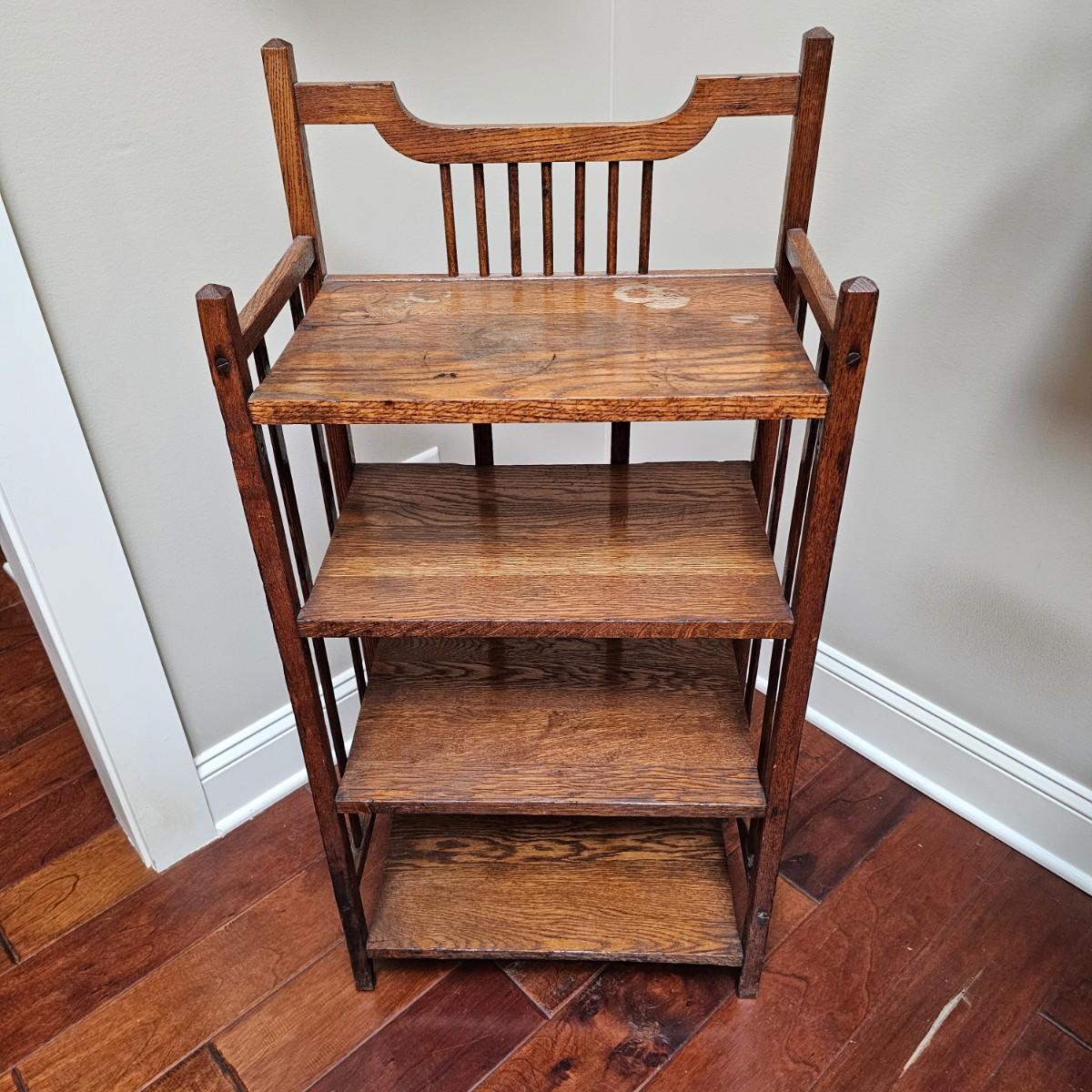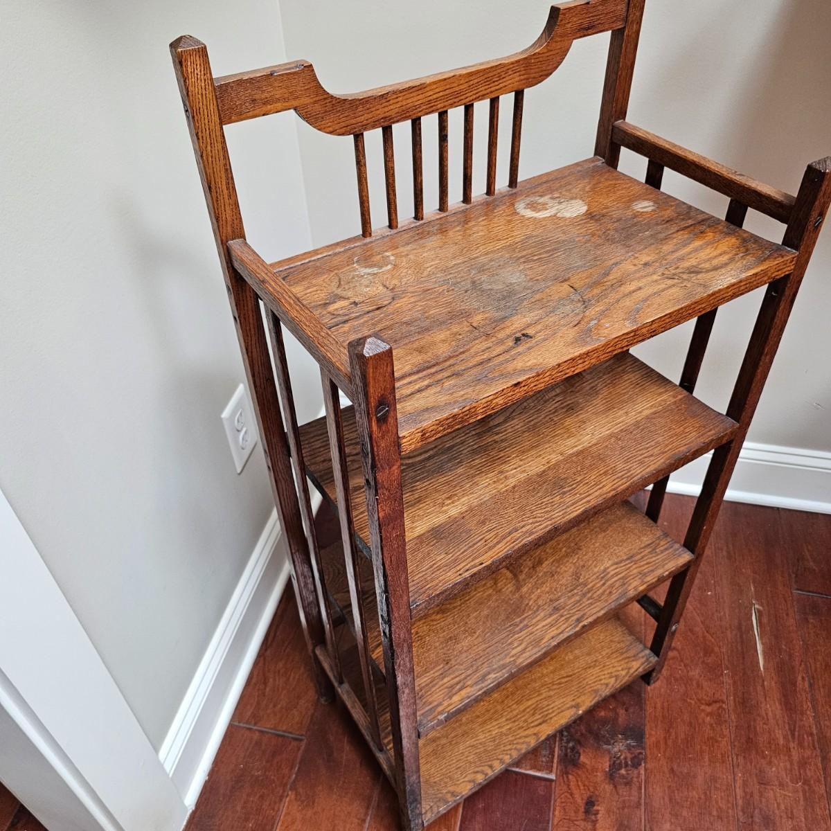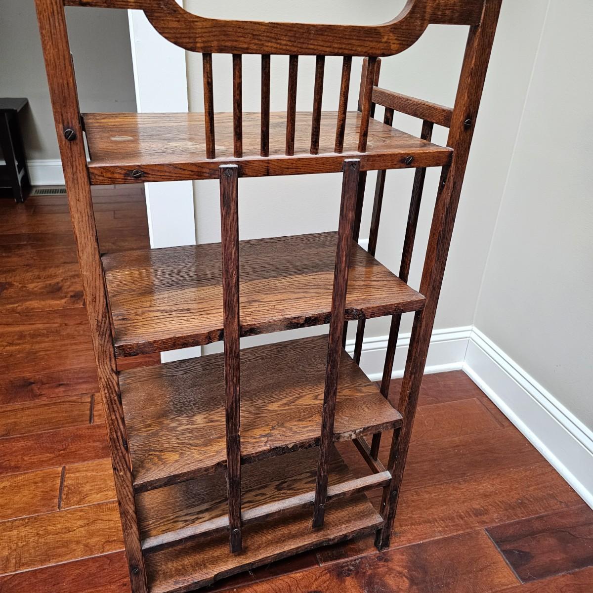 Vintage, possibly hand-made, shelf stand with four shelves. Carved tops on main supports. Shelves have some water stains and wear top and bottom. Measures 19" x 11" x 39"H. See photos for details. Local pickup only.