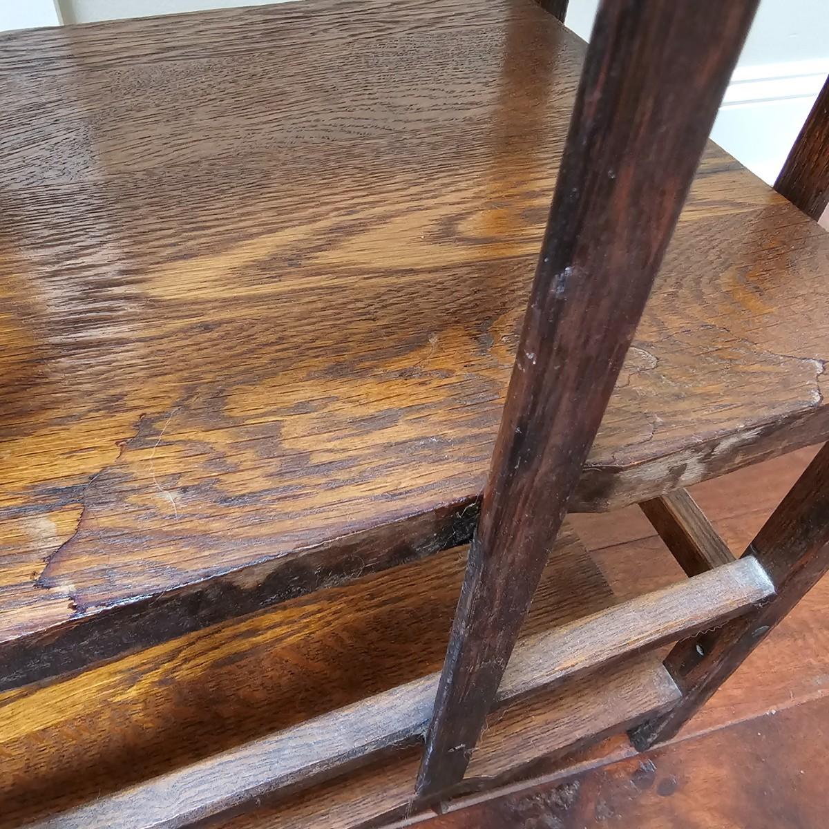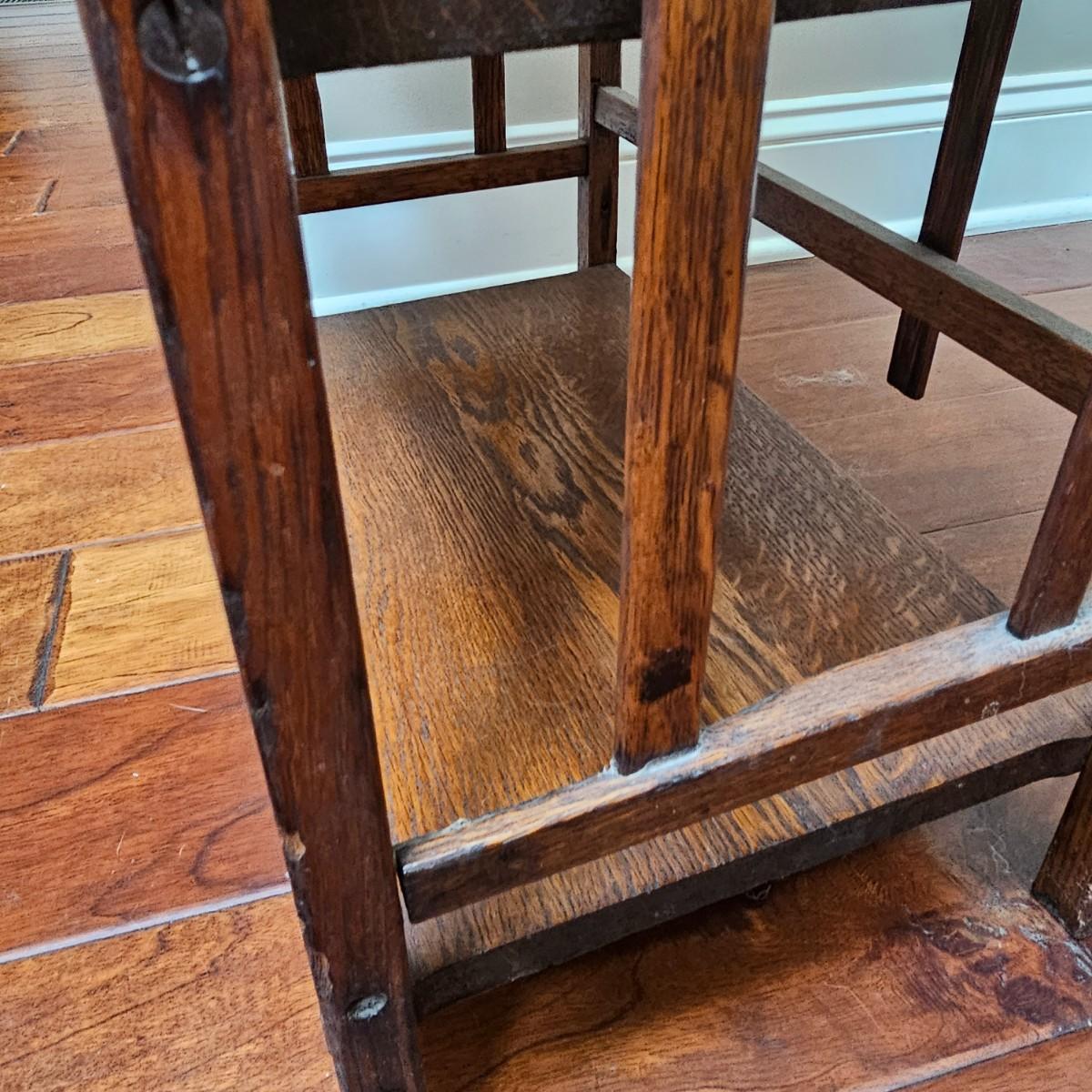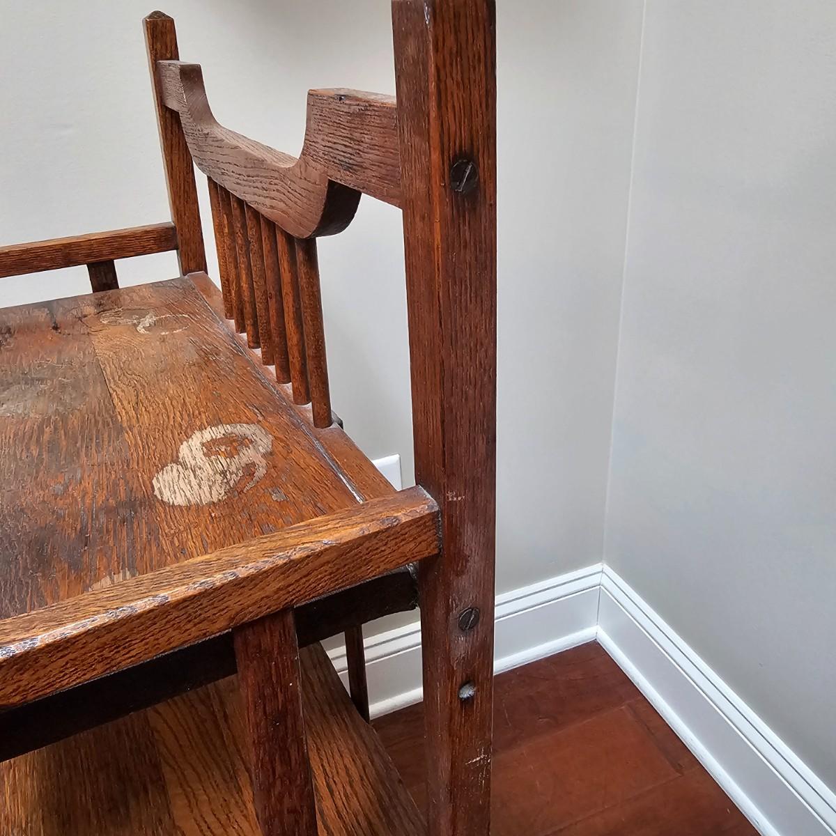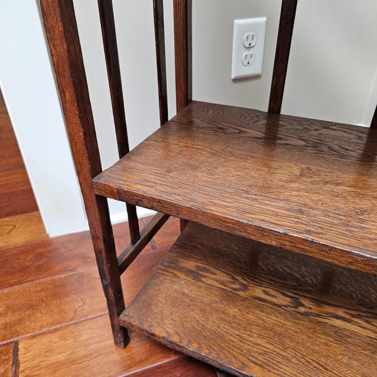 Vintage, possibly hand-made, shelf stand with four shelves. Carved tops on main supports. Shelves have some water stains and wear top and bottom. Measures 19" x 11" x 39"H. See photos for details. Local pickup only.