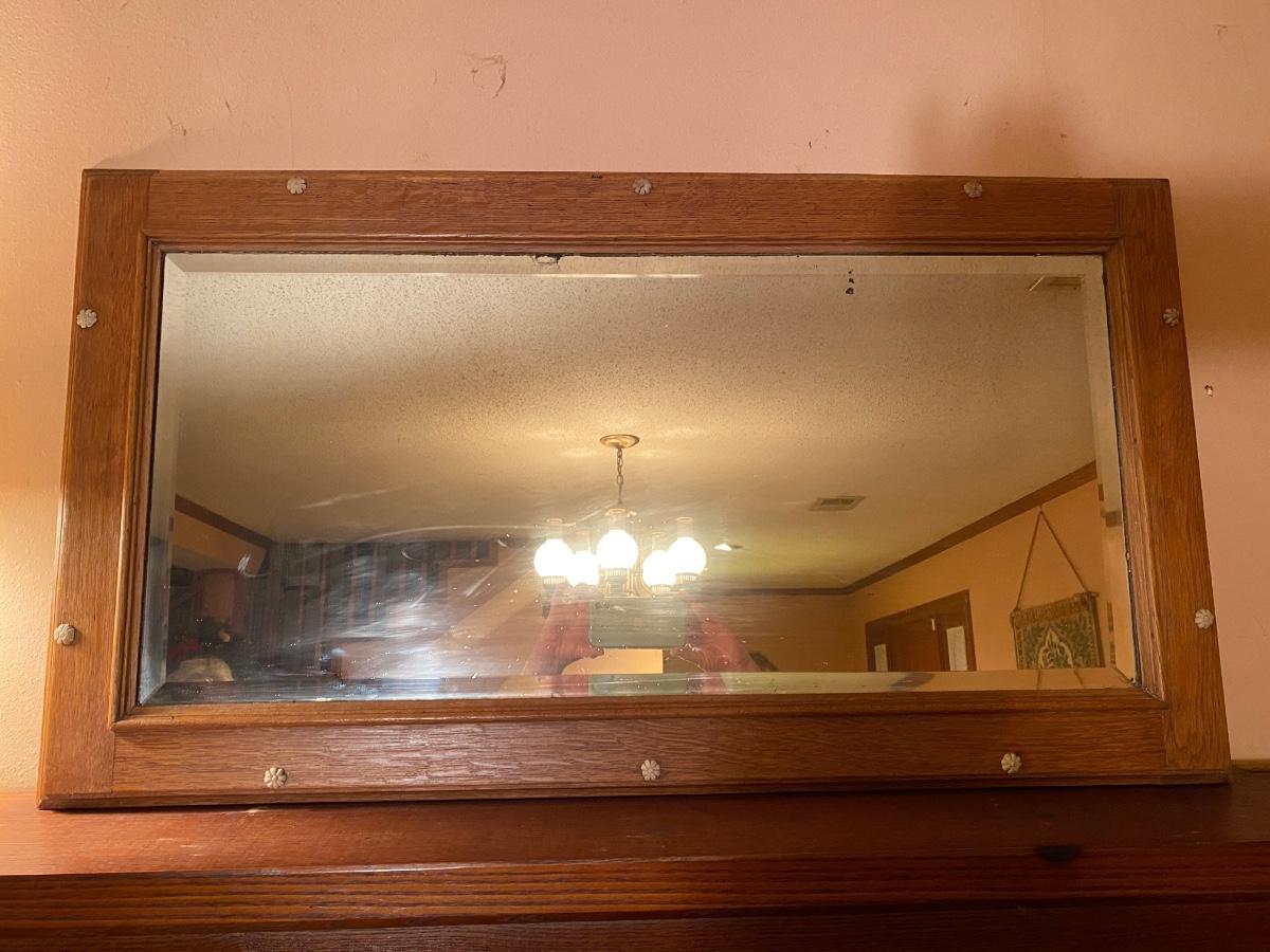 Vintage oak framed beveled mirror Approx 36w x 19-1/2h. Very good condition