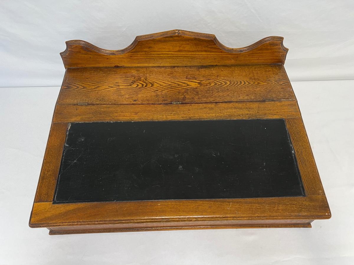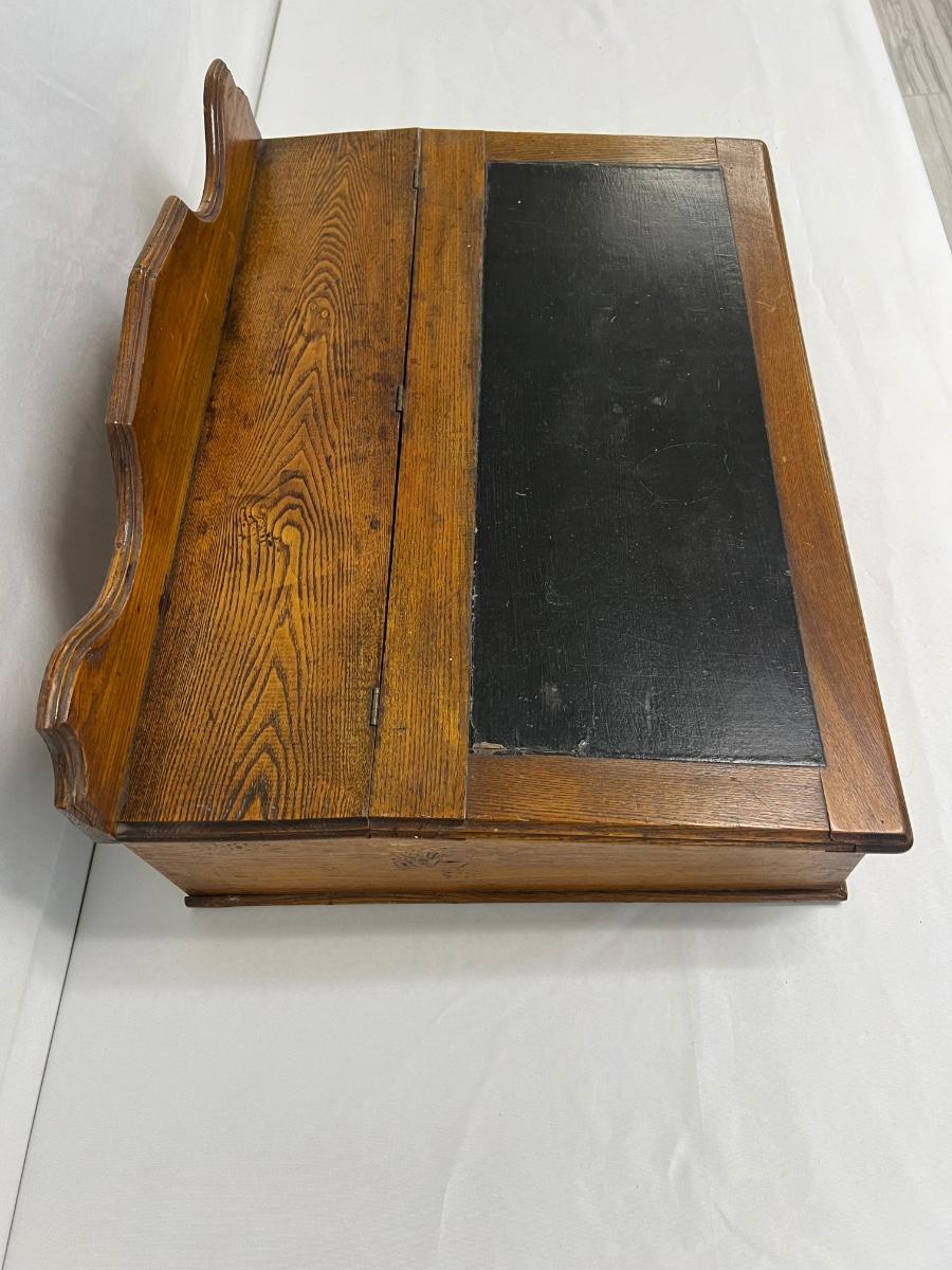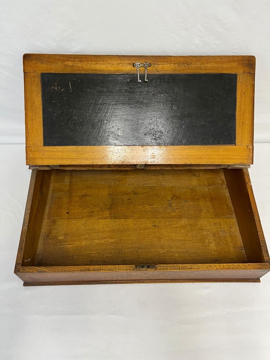 Slant top. Includes two keys. Age related wear. Measurement: 26.5" x 19" x 11.5". [LV]