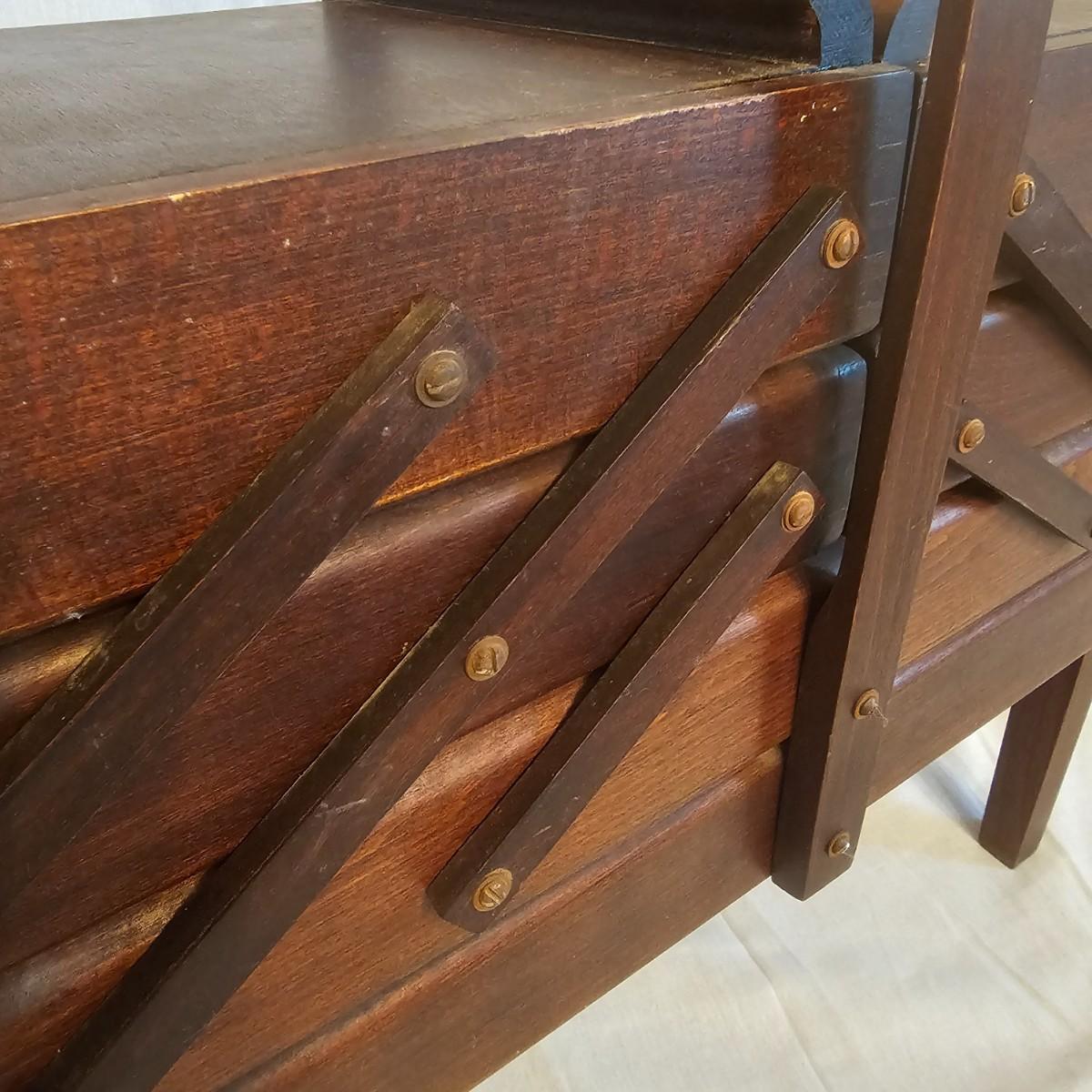 Stately vintage oak sewing caddy with fold out sides and carry handle. Piece has taper legs, lift handles to open and dovetail corners all around. Measures 20.5"W x 12"D x 22"H closed, and 66"W fully open. Contains thread spools, scissors and miscellaneous sewing sundries. Some marks on sides and legs. See photos for details. Shipping available.