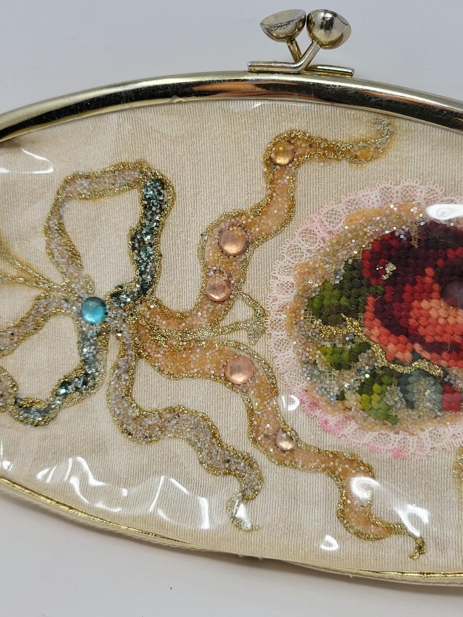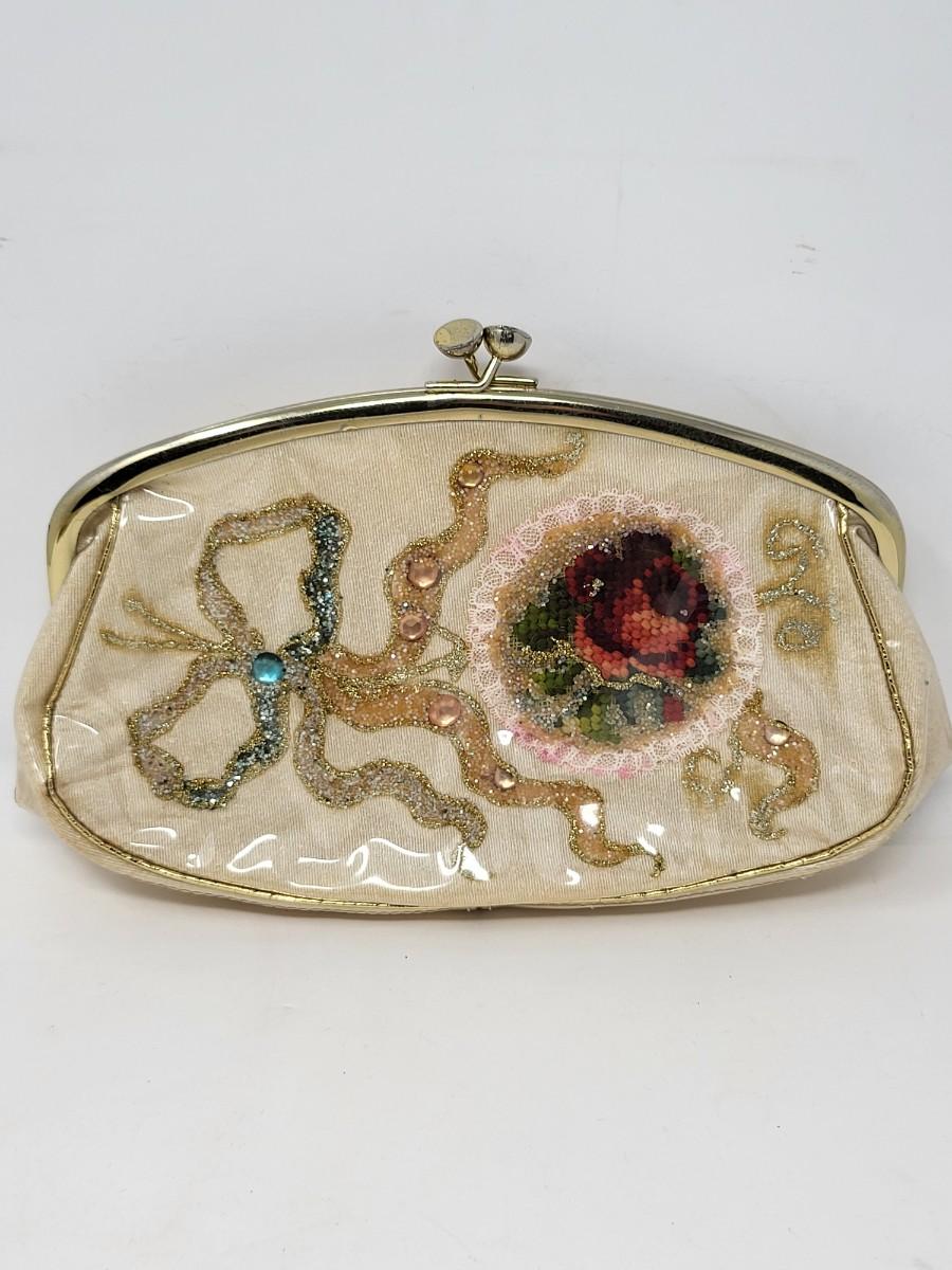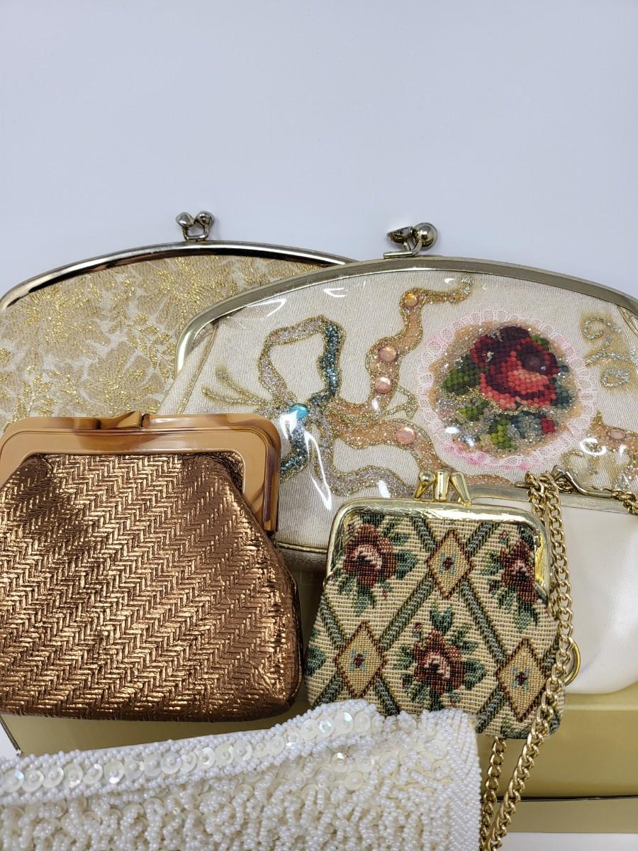 2. Clear vinyl coated, petit point & glitter with kiss clasp, clutch purse. 3. Small bronze weaved and lucite frame accessories/coin purse.