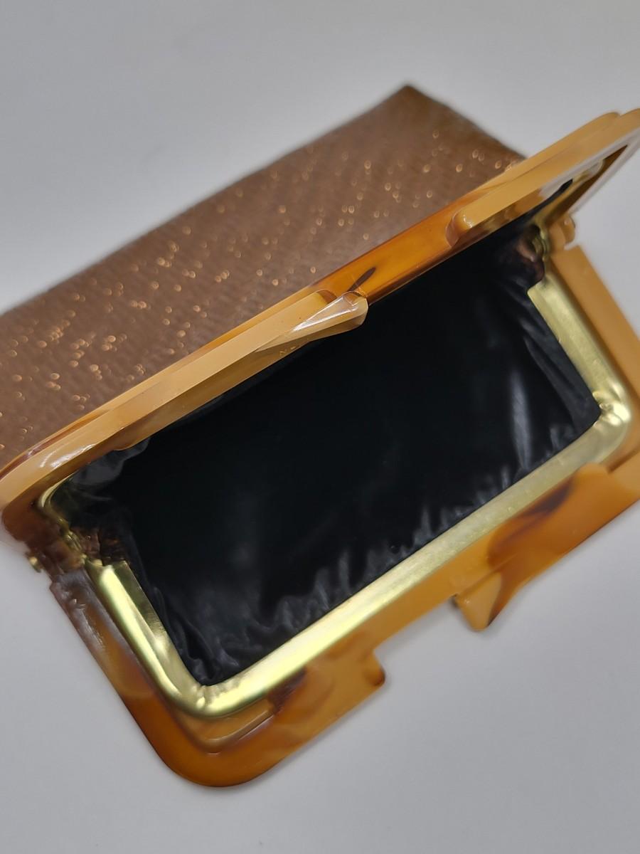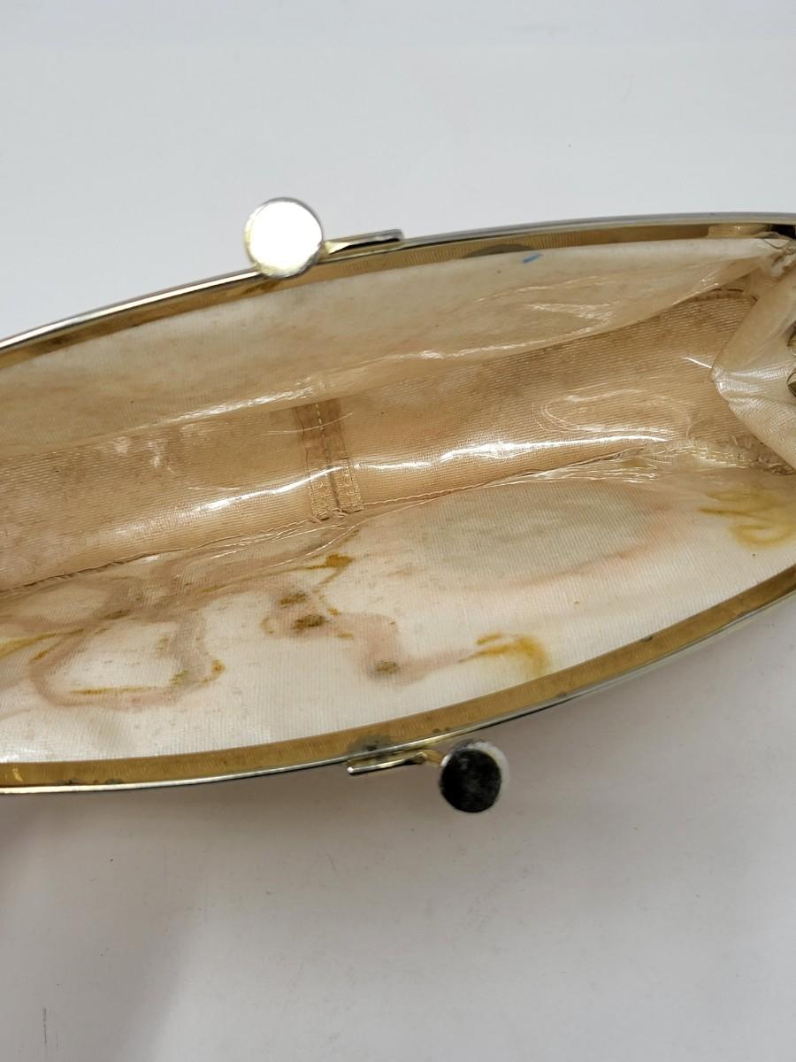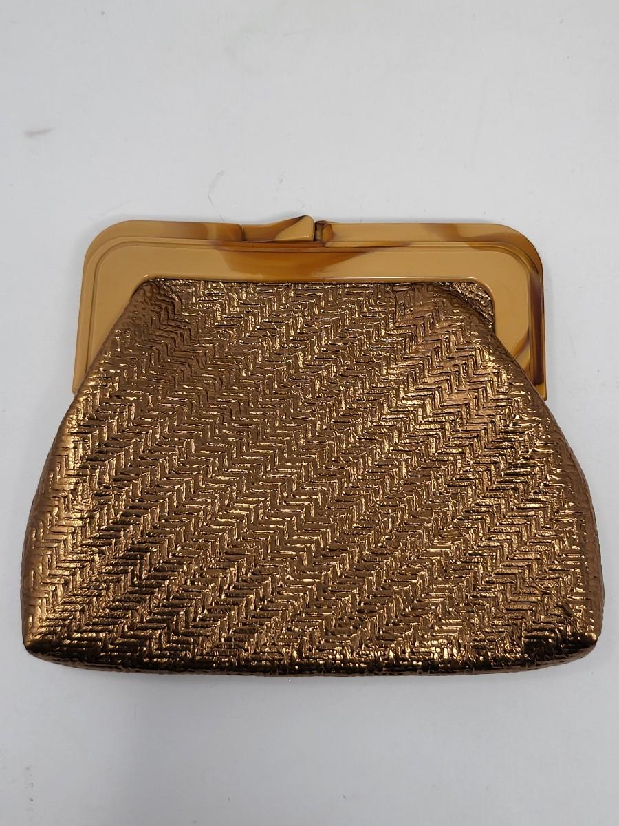 2. Clear vinyl coated, petit point & glitter with kiss clasp, clutch purse. 3. Small bronze weaved and lucite frame accessories/coin purse.