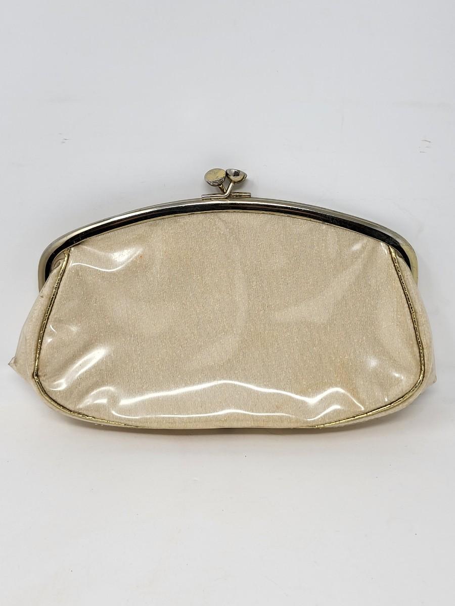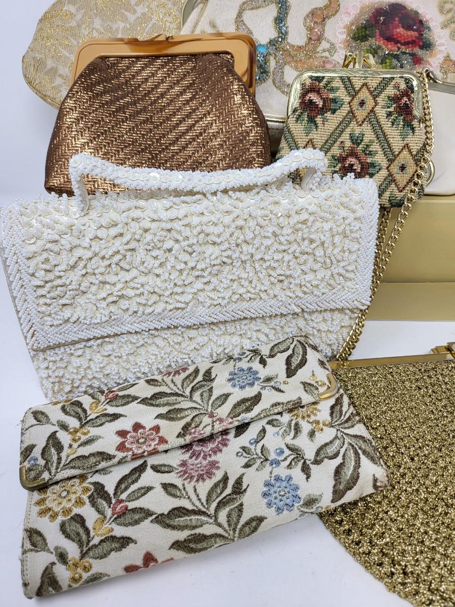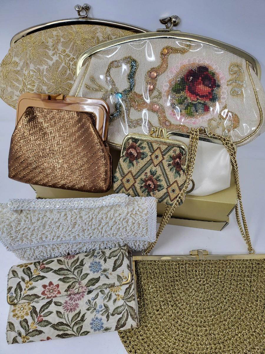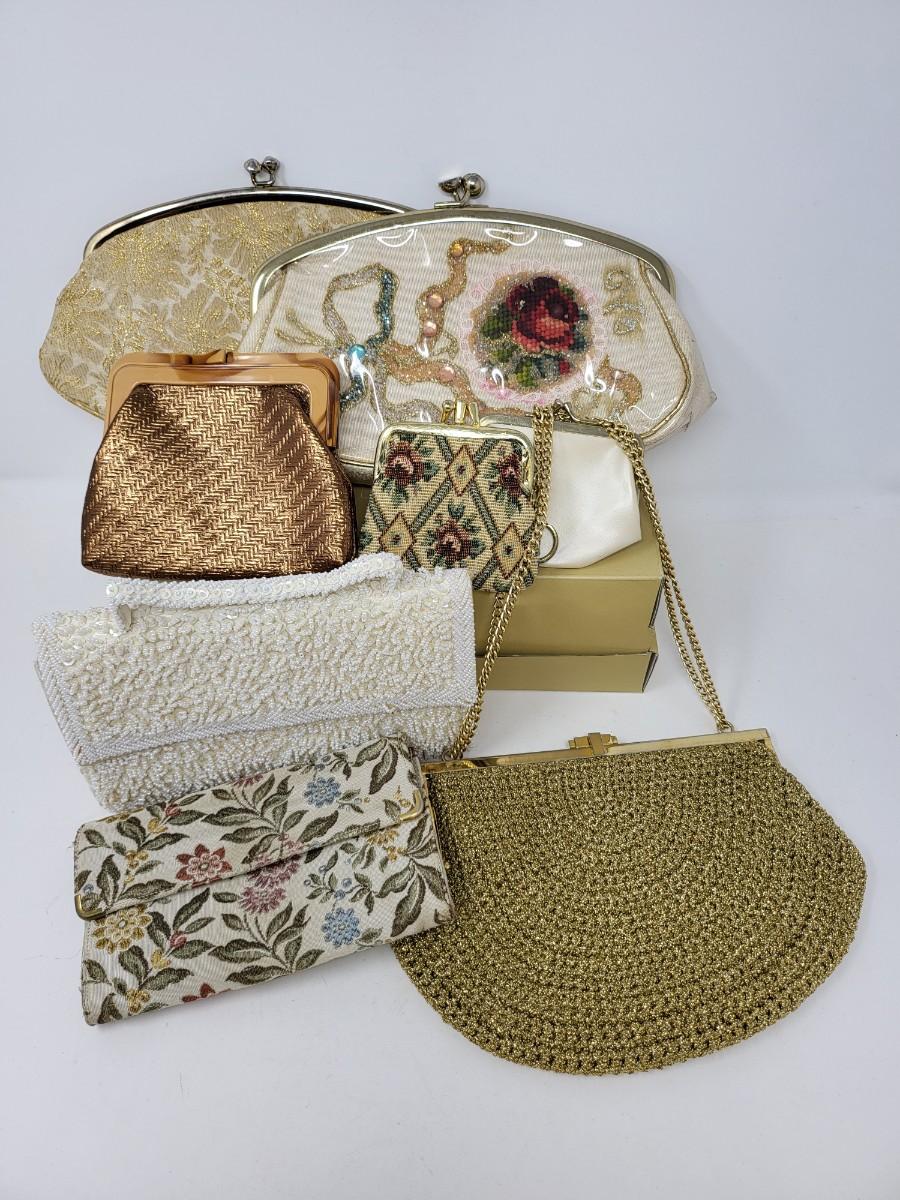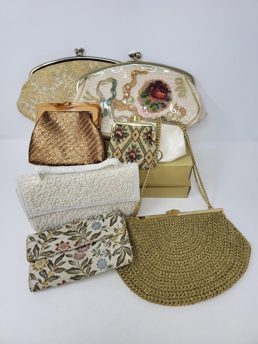 (8) pieces total. Gold, beige and ivory colored variety of vintage clutch, evening or occasional bags and two 3" coin purses.