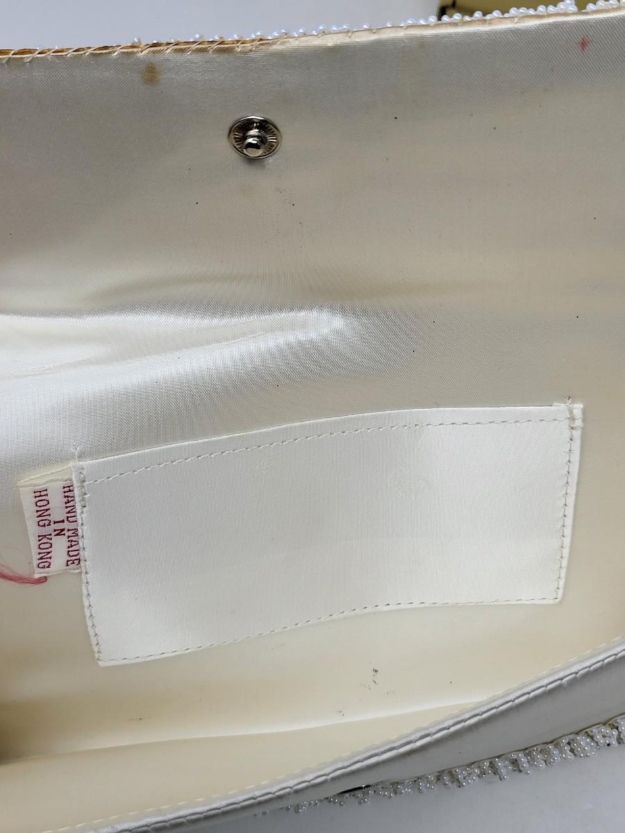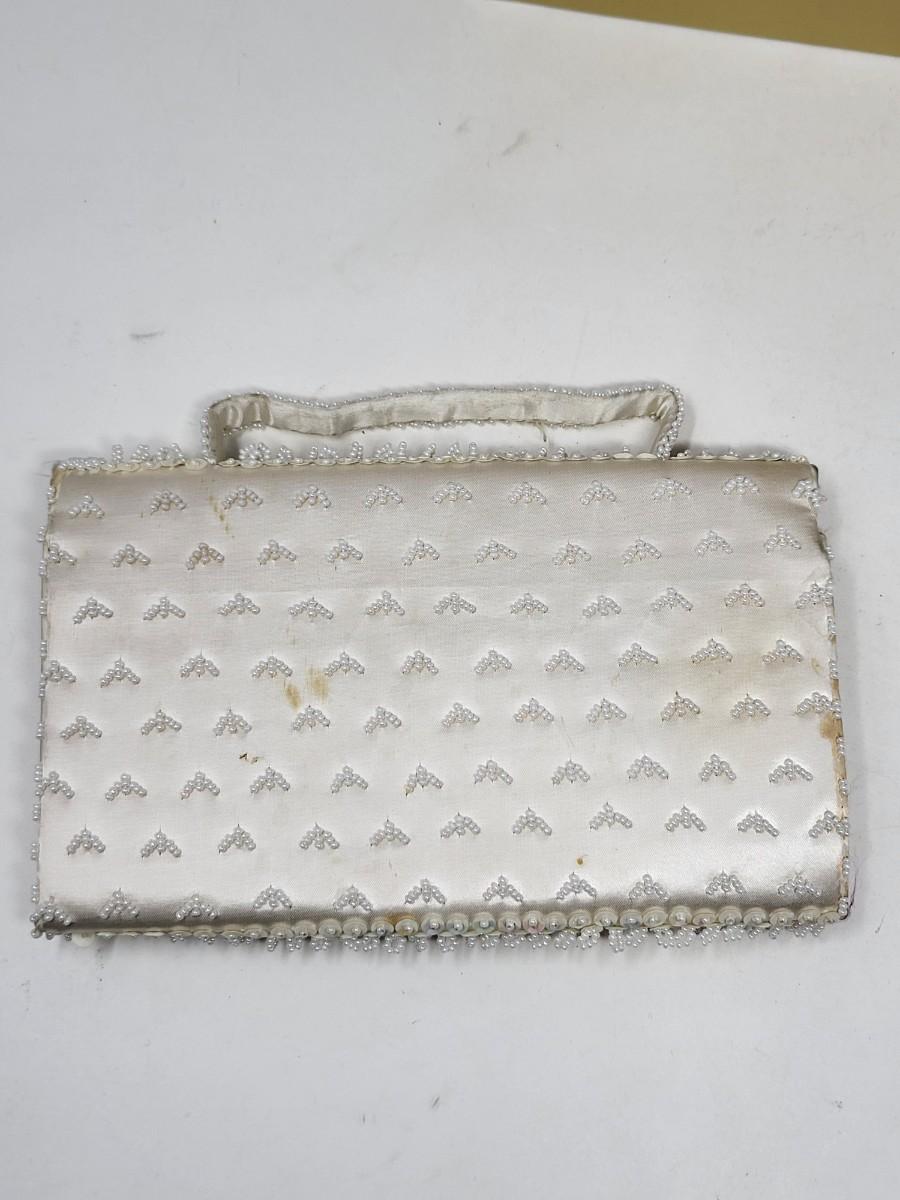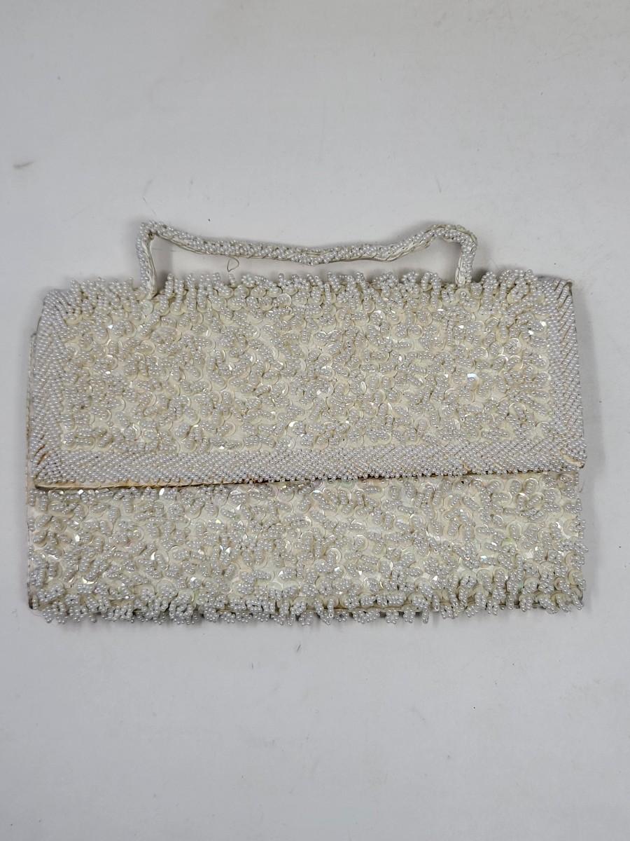 5. Ivory colored, glass seed bead purse with handle, Hong Kong.