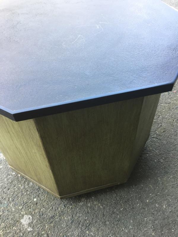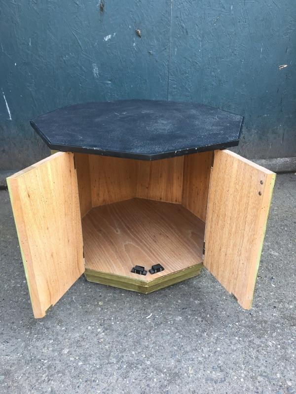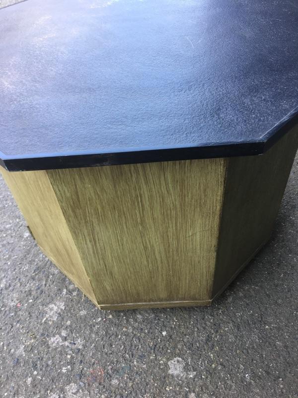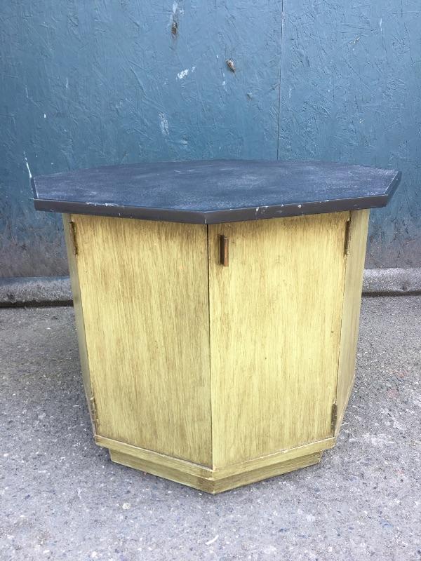 Cool circa 1980's side table! It has a unique painted green finish and a black solid stone top. Great storage!