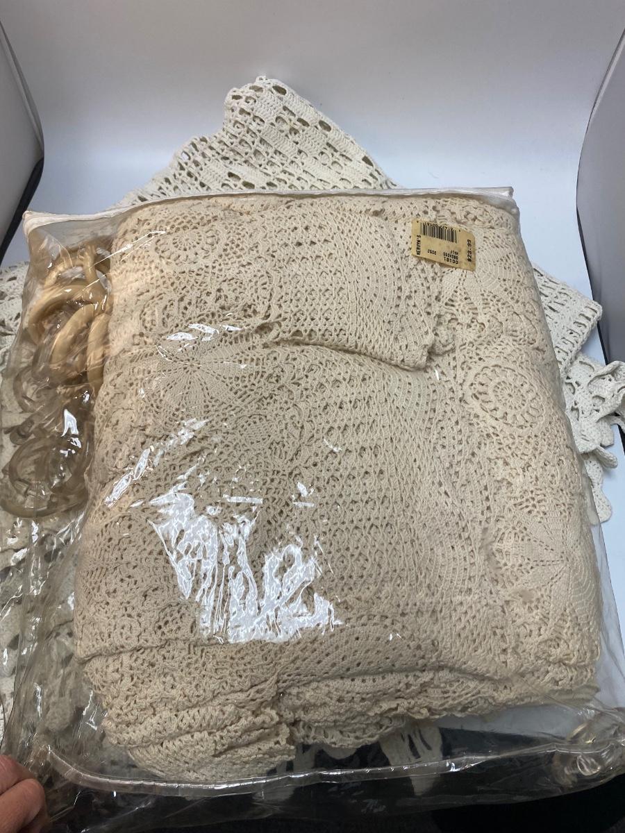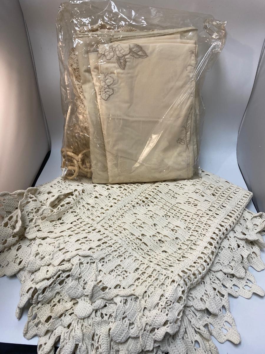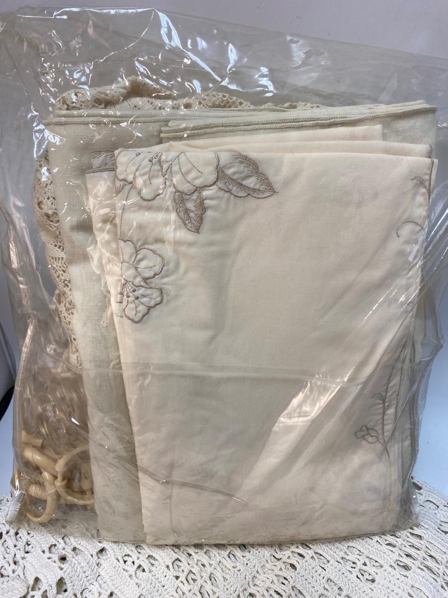 Vintage Off White Linen Lot - Table Clothes. Shower curtain rings are in the bag but none of these are shower curtains. Good vintage condition, may have spots.