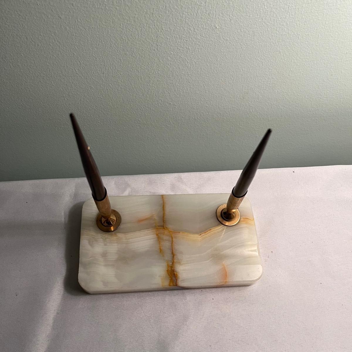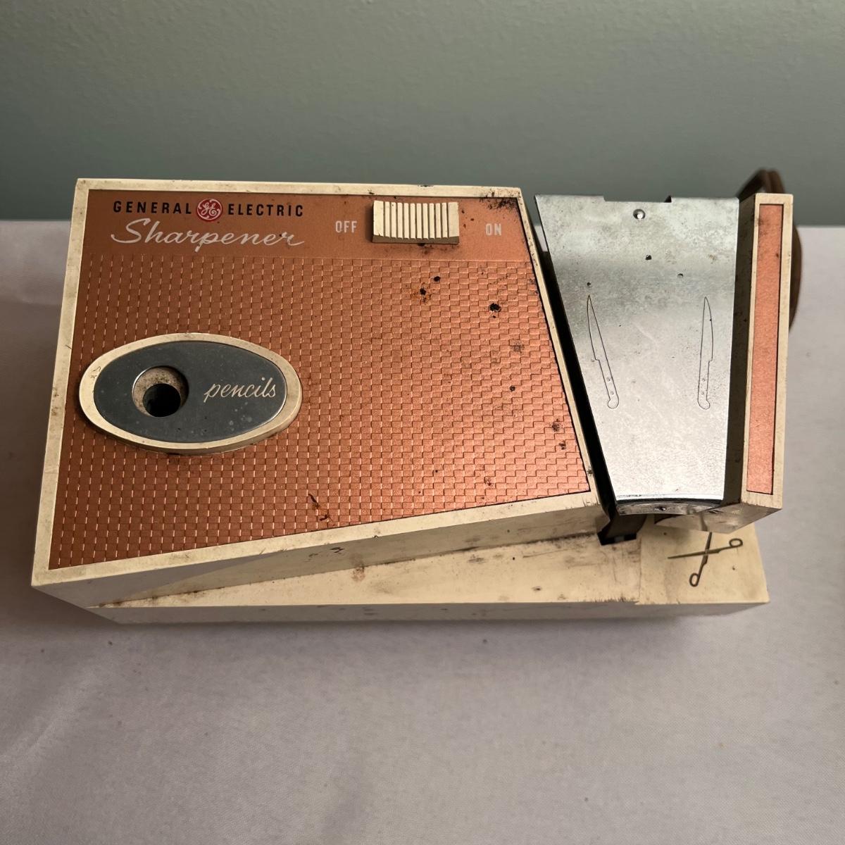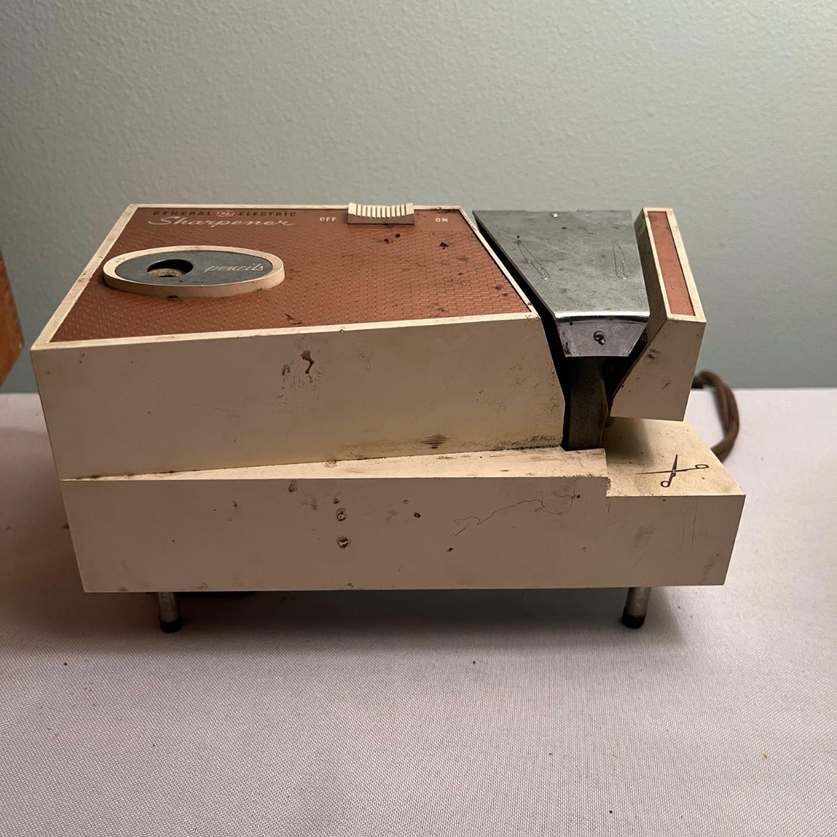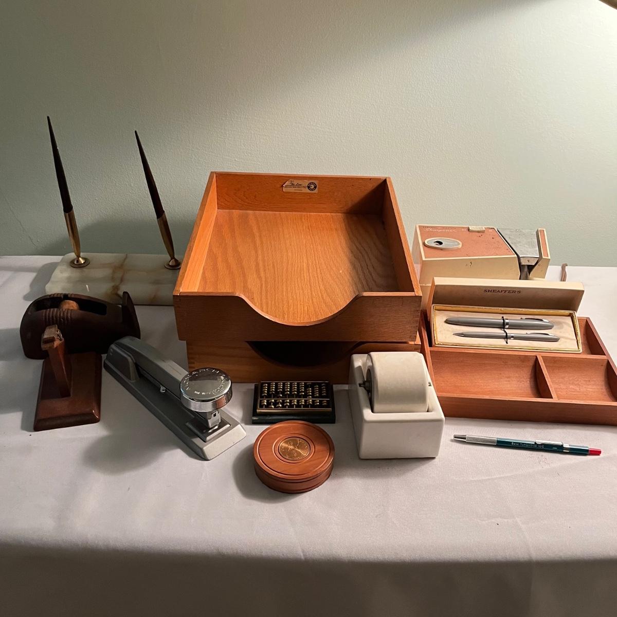 Lot includes two wooden paper trays, Schaefer fountain pens with stone base, metal tape dispenser, Monarch stapler, Shaefer pen and pencil set, General Electric pencil & knife sharpener, stone based abacus, wooden paperweight and more. Pencil sharpener powered on when tested.