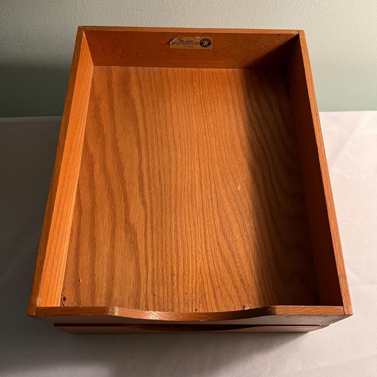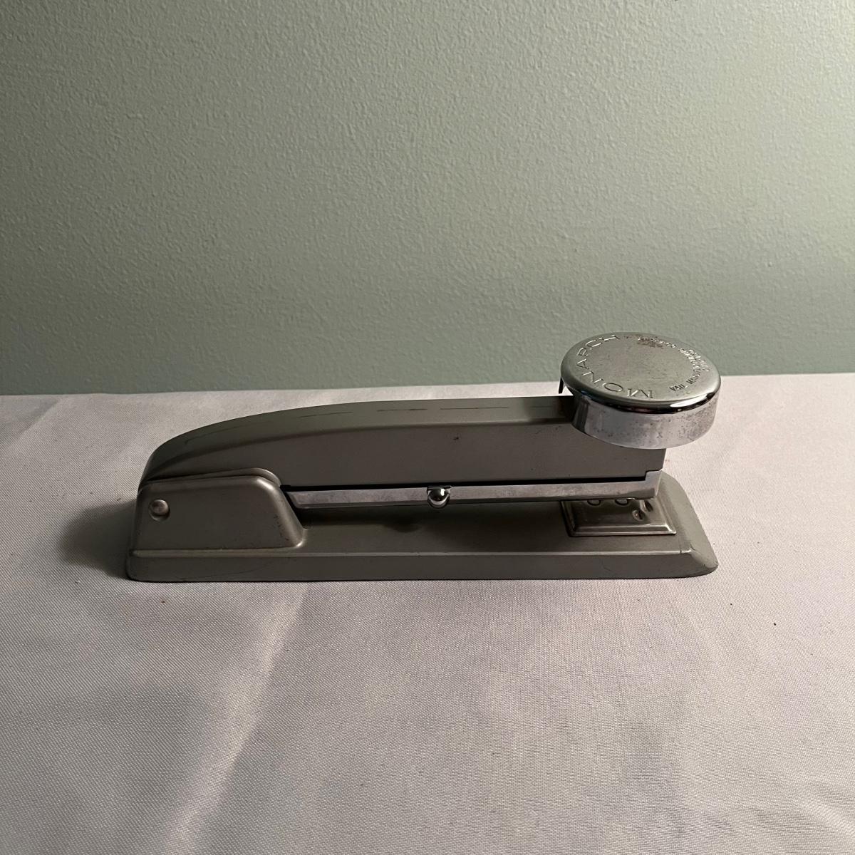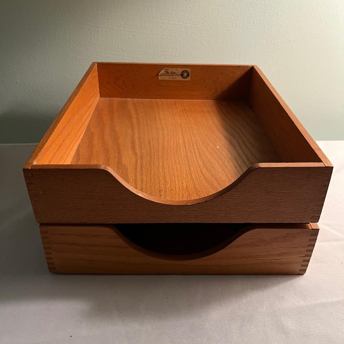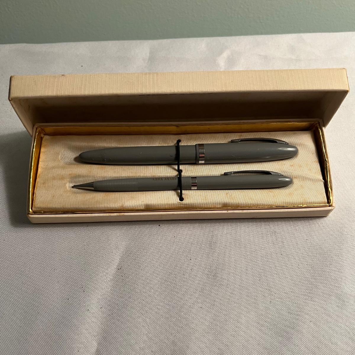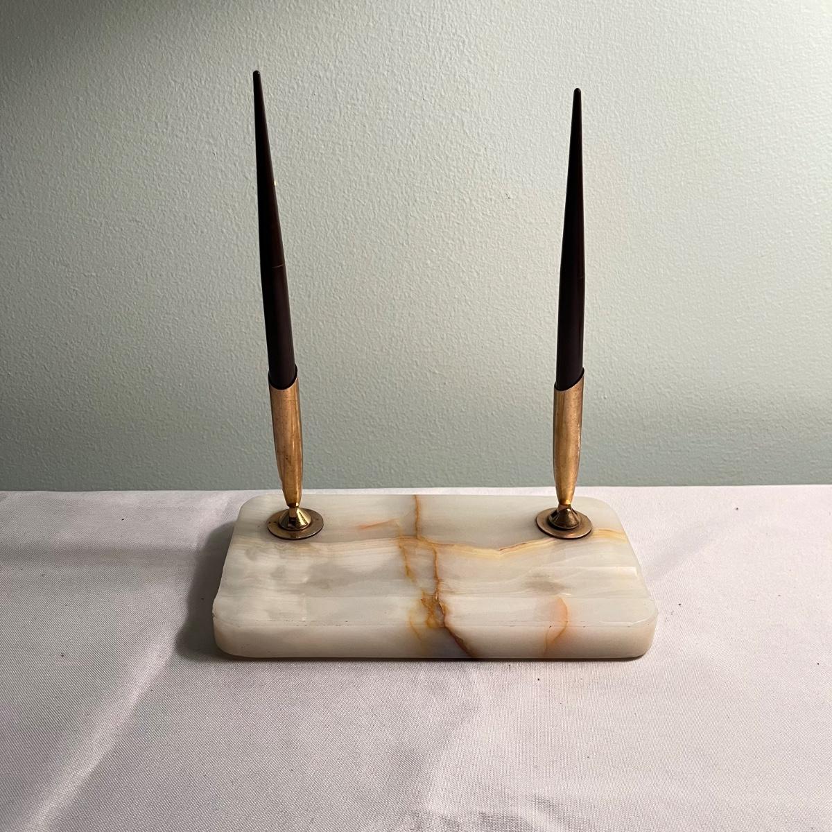 Lot includes two wooden paper trays, Schaefer fountain pens with stone base, metal tape dispenser, Monarch stapler, Shaefer pen and pencil set, General Electric pencil & knife sharpener, stone based abacus, wooden paperweight and more. Pencil sharpener powered on when tested.