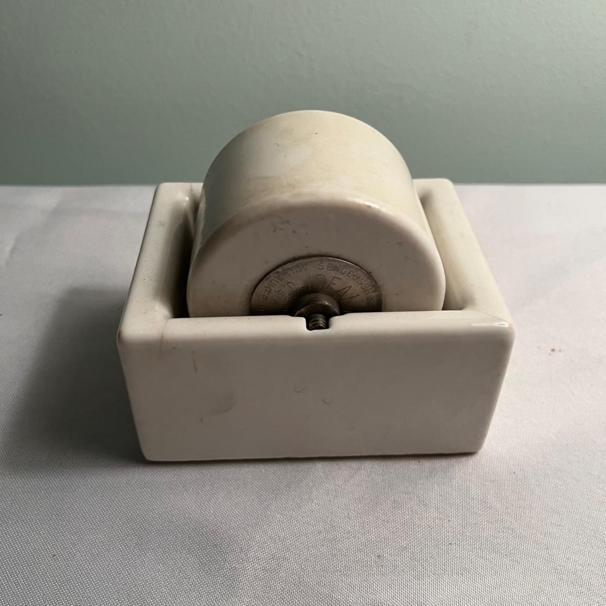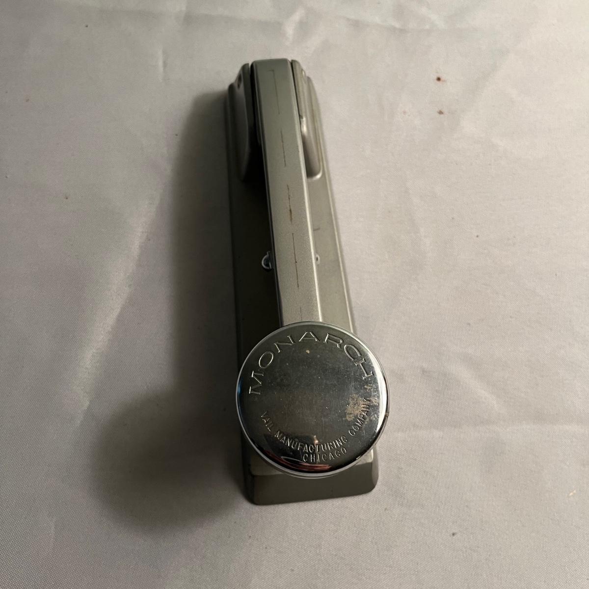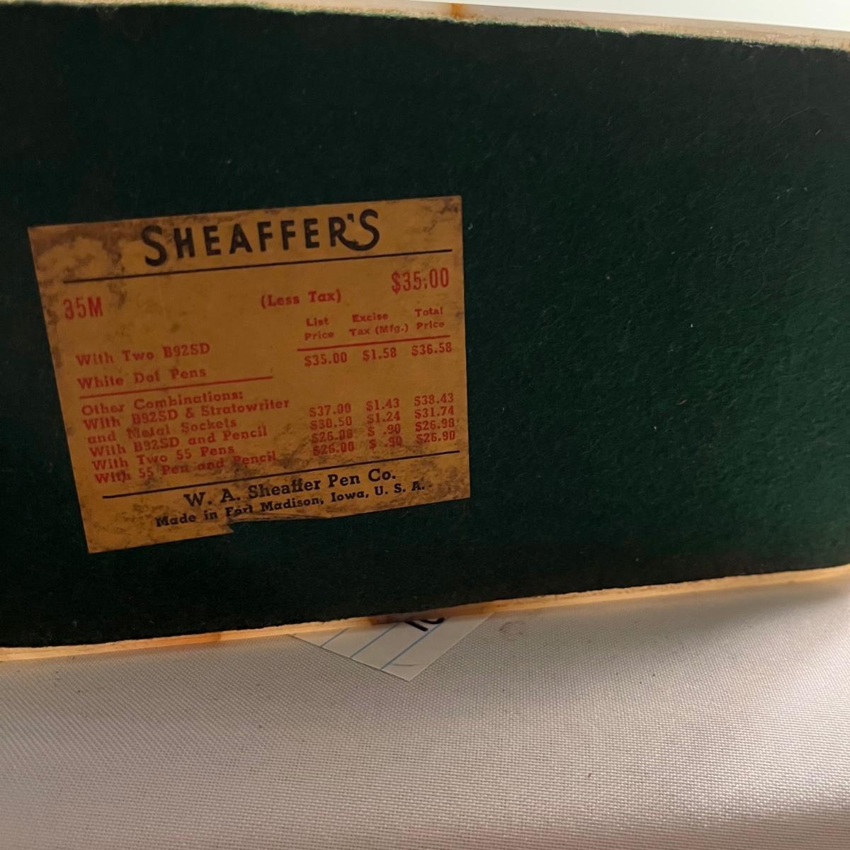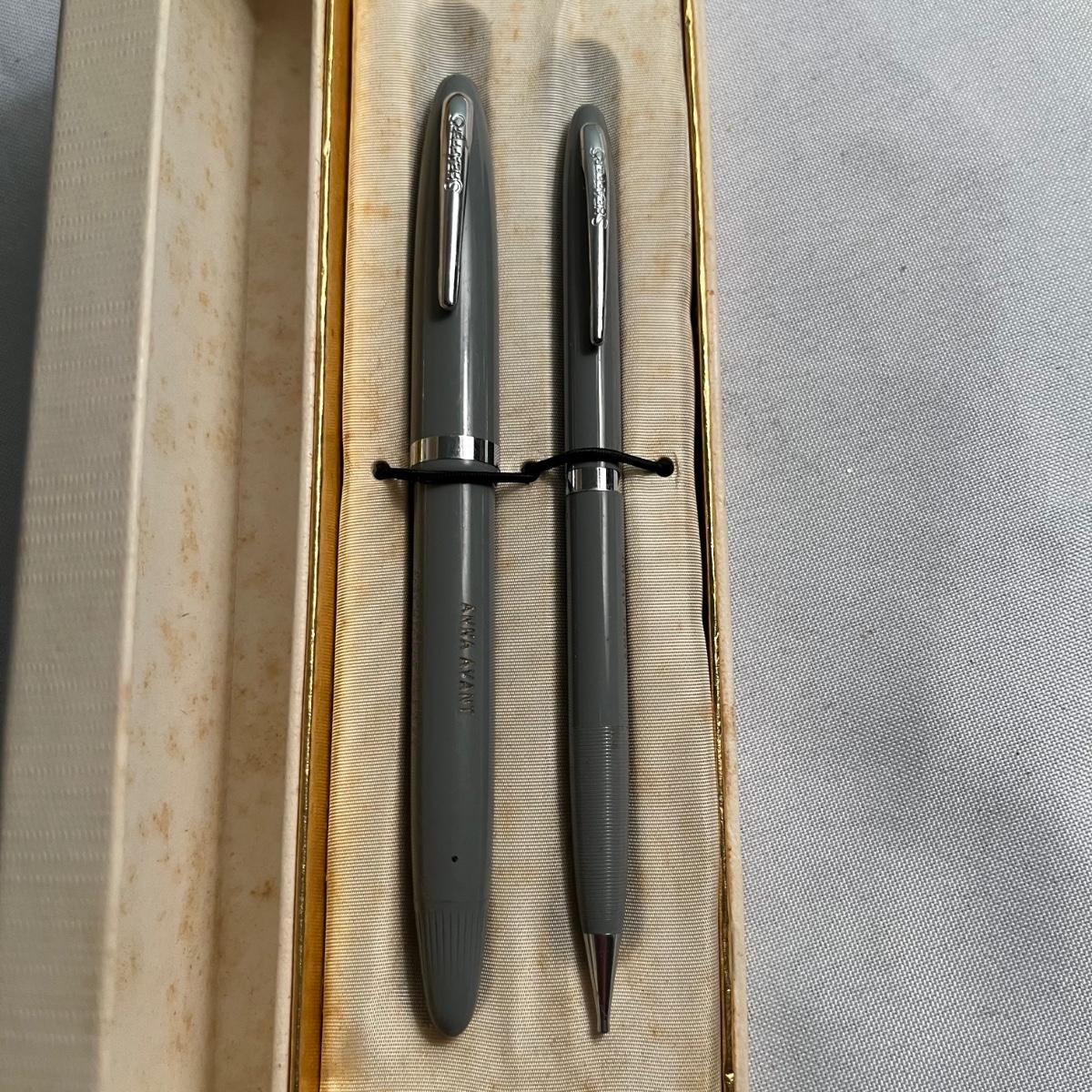 Lot includes two wooden paper trays, Schaefer fountain pens with stone base, metal tape dispenser, Monarch stapler, Shaefer pen and pencil set, General Electric pencil & knife sharpener, stone based abacus, wooden paperweight and more. Pencil sharpener powered on when tested.