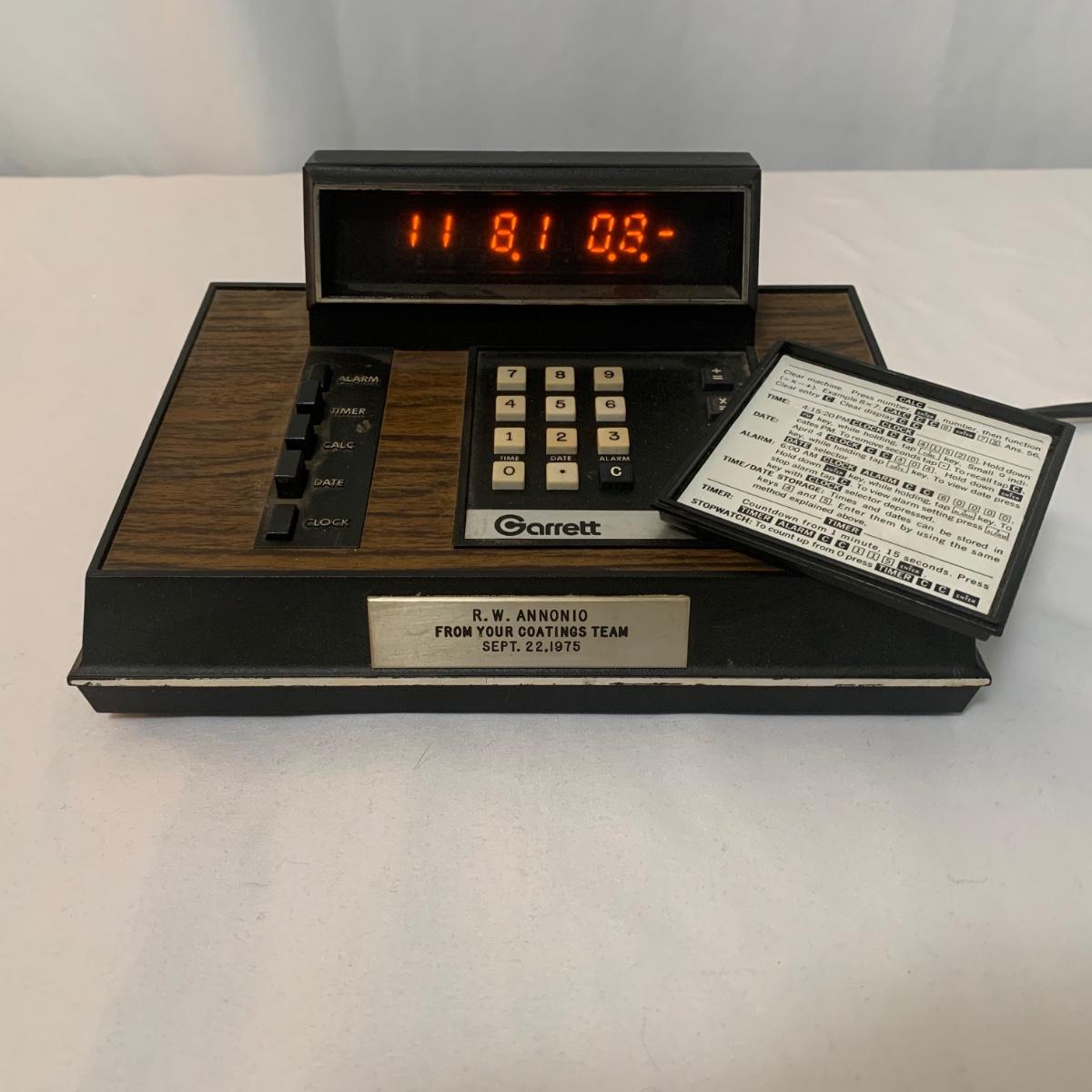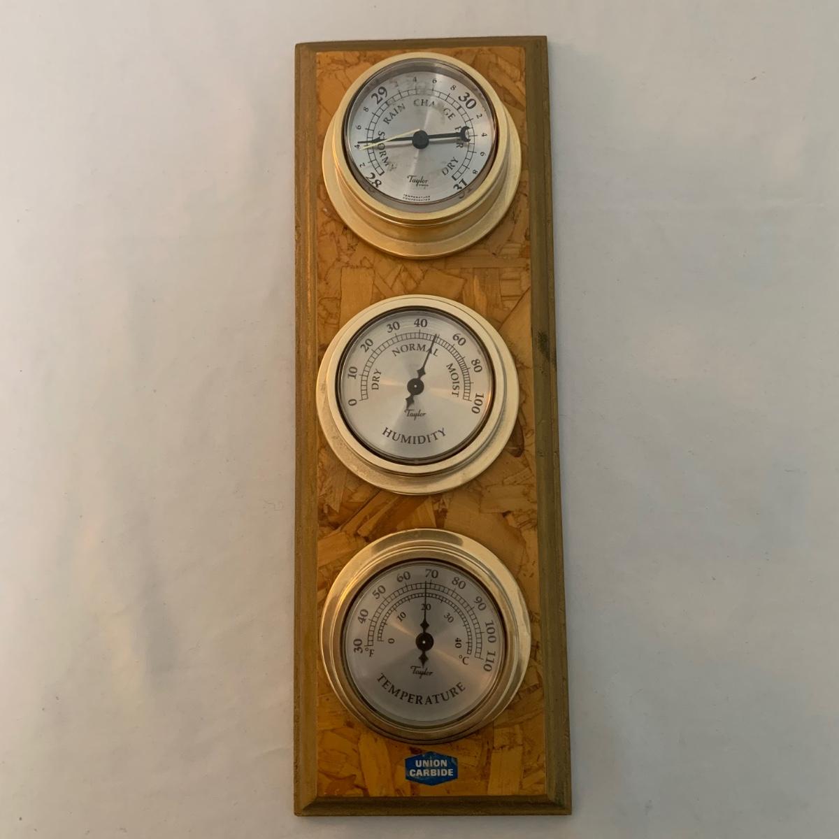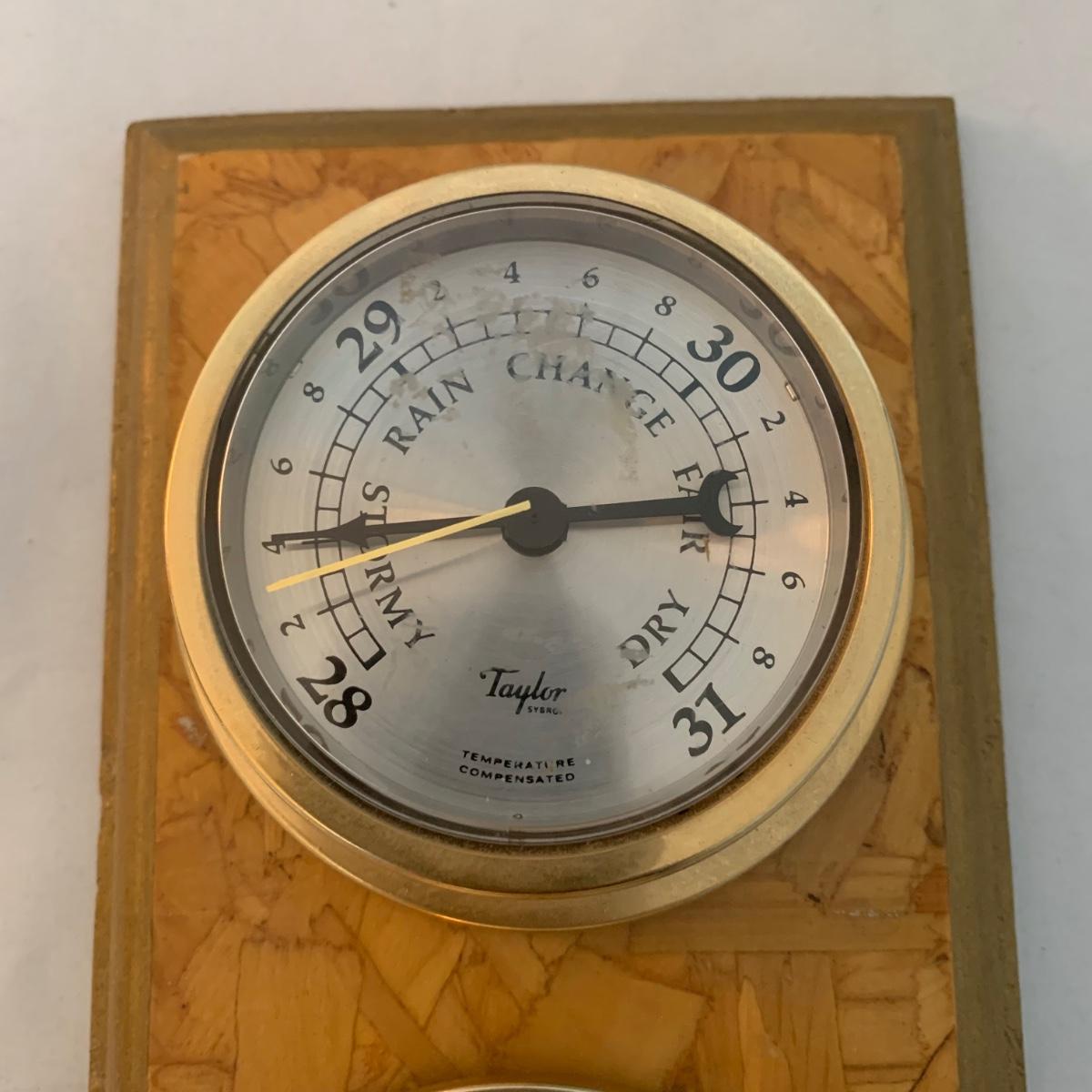 Vintage Office gift lot includes, Cross Brazilian Green Onyx Desk set with pen holder and 1/20 10 karat gold filled pencil and refillable ball point pen. Taylor Sybron Analog Weather Station with hydrometer, barometer, and thermometer. Also includes Garret Electronic Calculator, model ITM2.