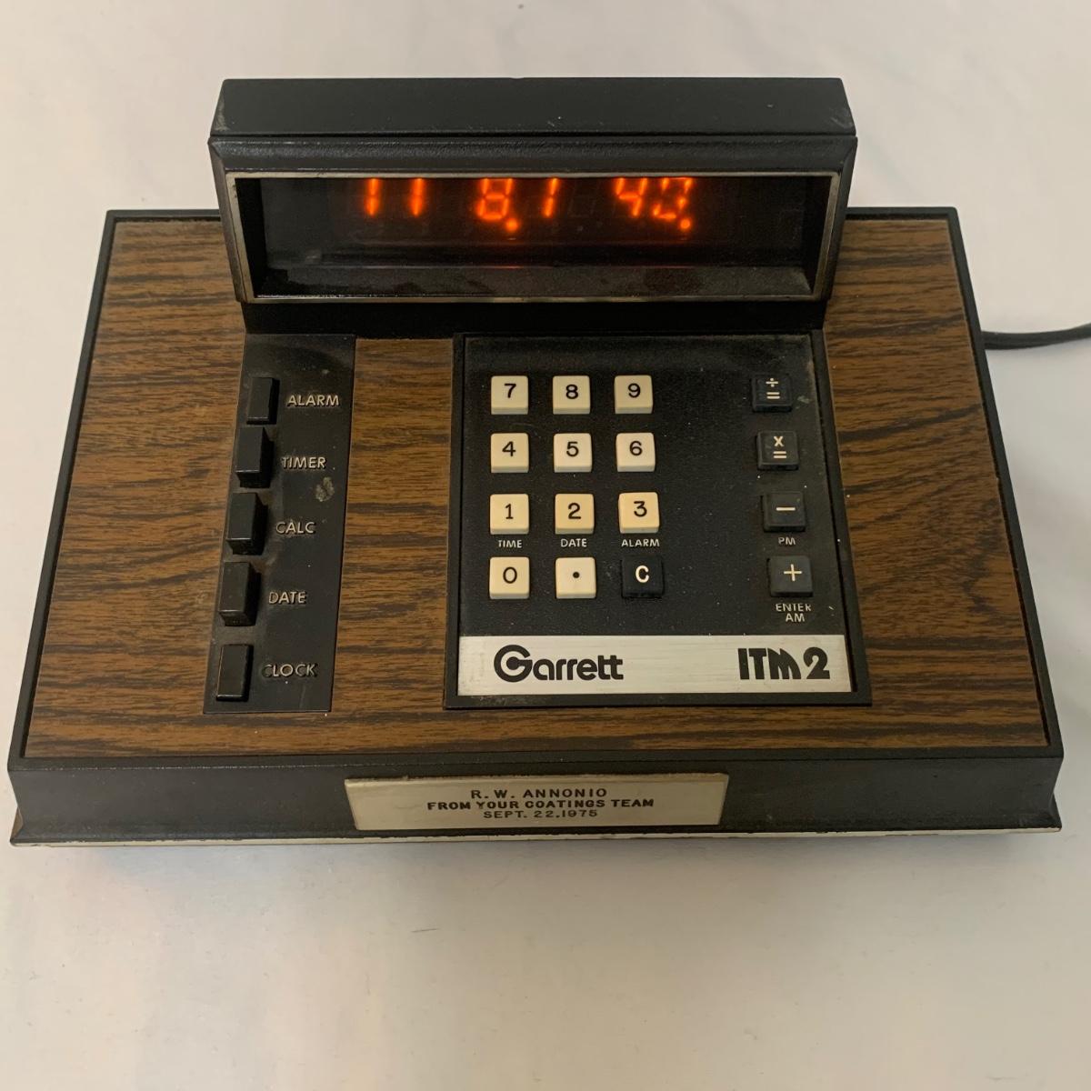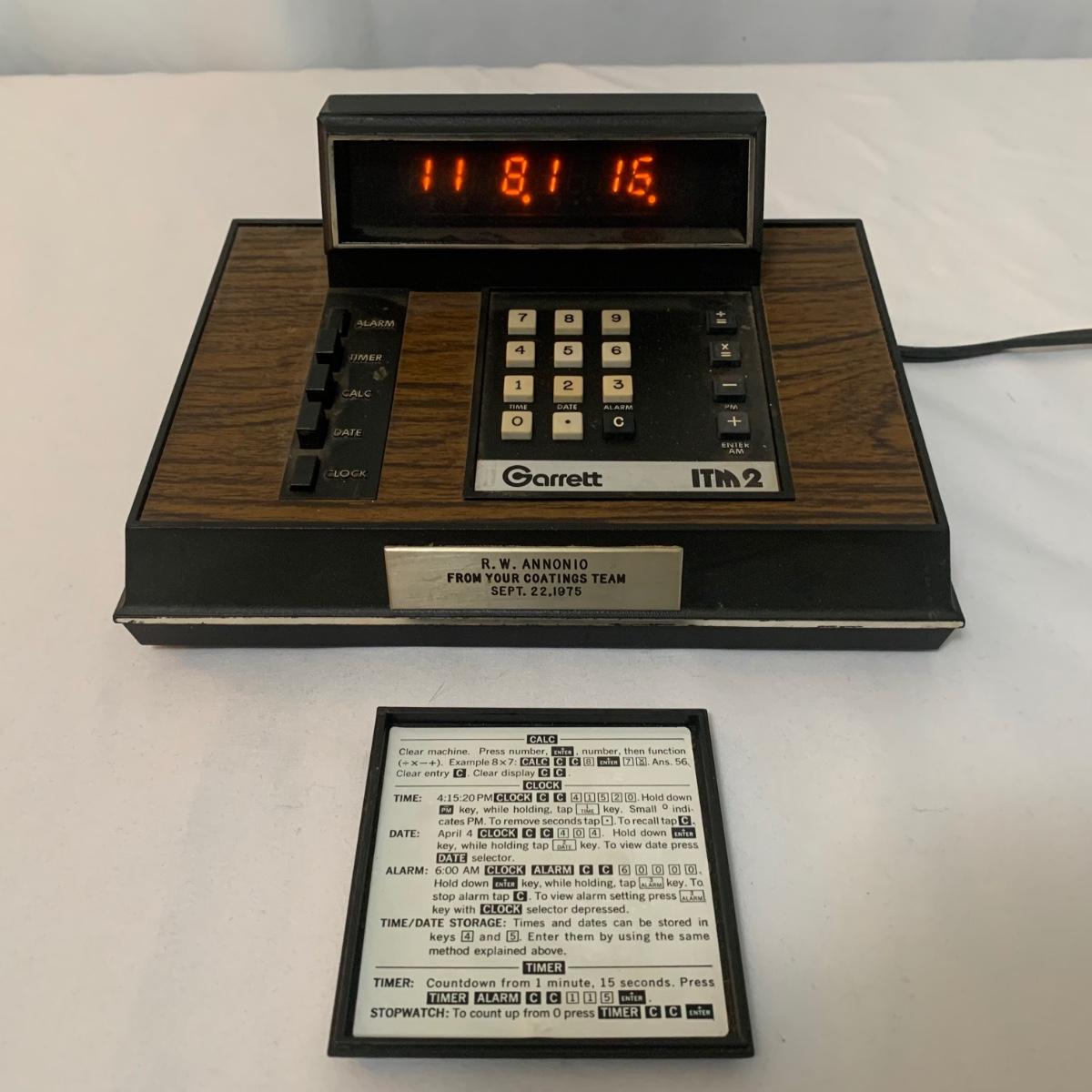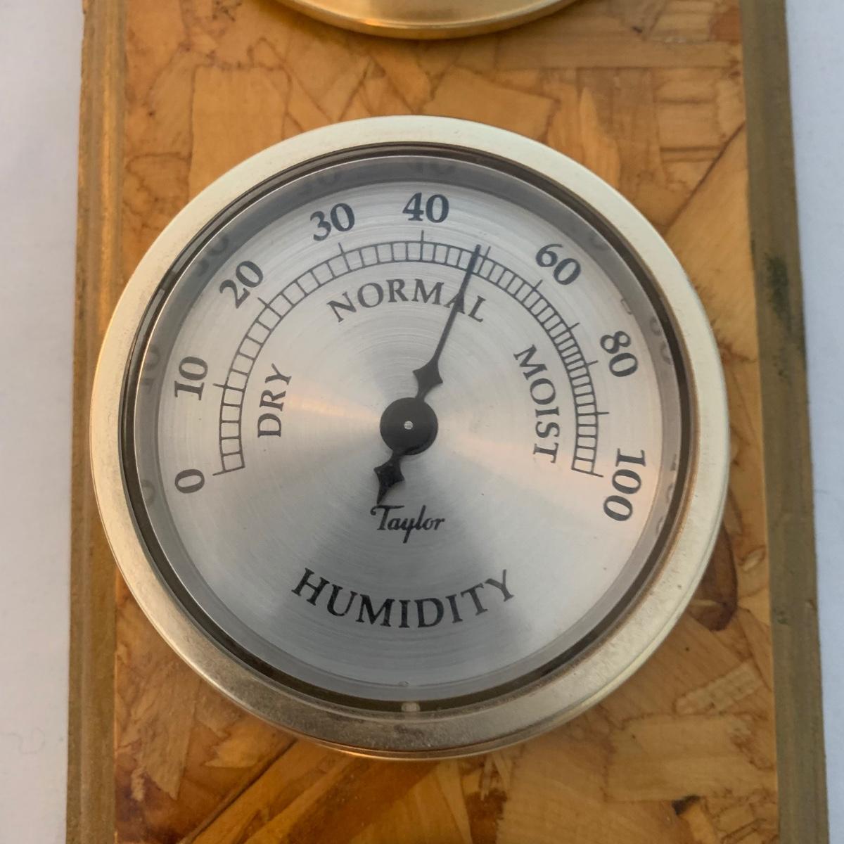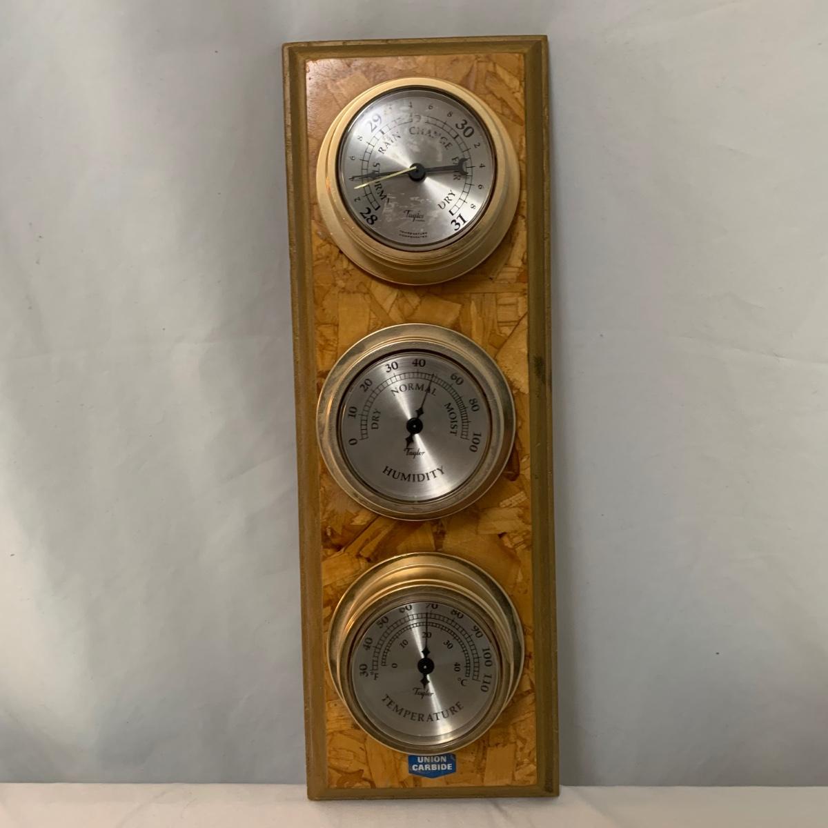 Vintage Office gift lot includes, Cross Brazilian Green Onyx Desk set with pen holder and 1/20 10 karat gold filled pencil and refillable ball point pen. Taylor Sybron Analog Weather Station with hydrometer, barometer, and thermometer. Also includes Garret Electronic Calculator, model ITM2.