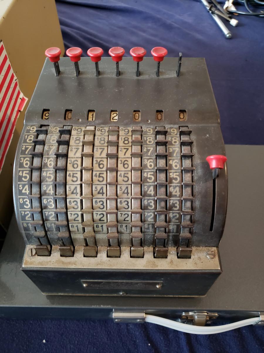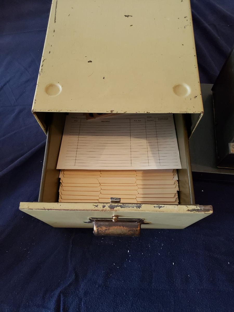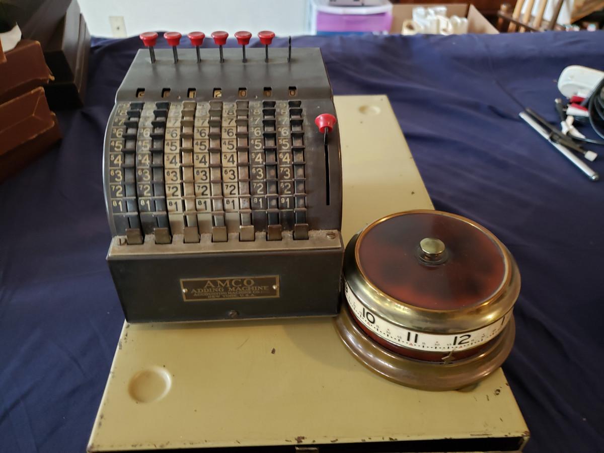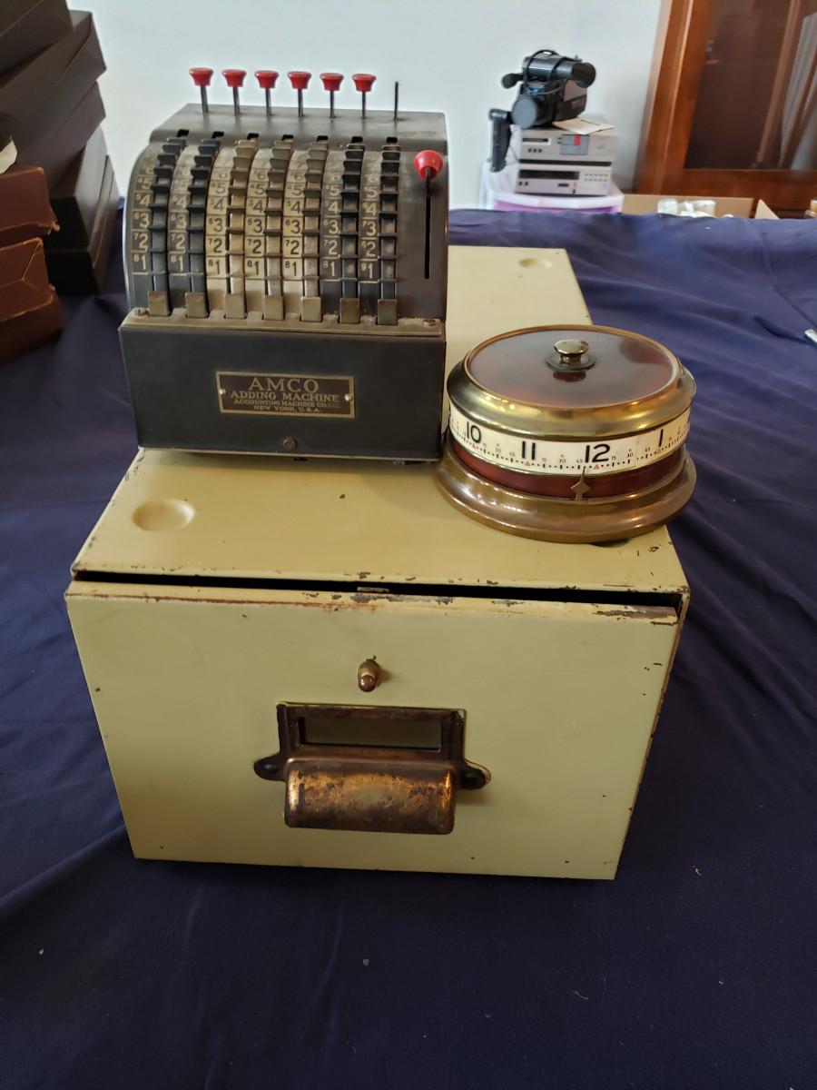 Includes an accounting machine, a file cabinet, and a winding desk clock. Take a look at the clock as it's a little different than what you are used to seeing. See pictures for more details.