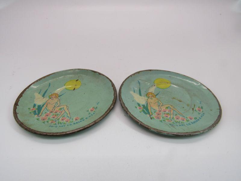 This listing is for two (2) Vintage Ohio Art Co. Bryan, Ohio USA, TIN LITHO 4 1/4" TOY FAIRY PLATES featuring a Fairy, Moon and a tranquil garden setting. Please check out the photos to judge condition based on normal use.