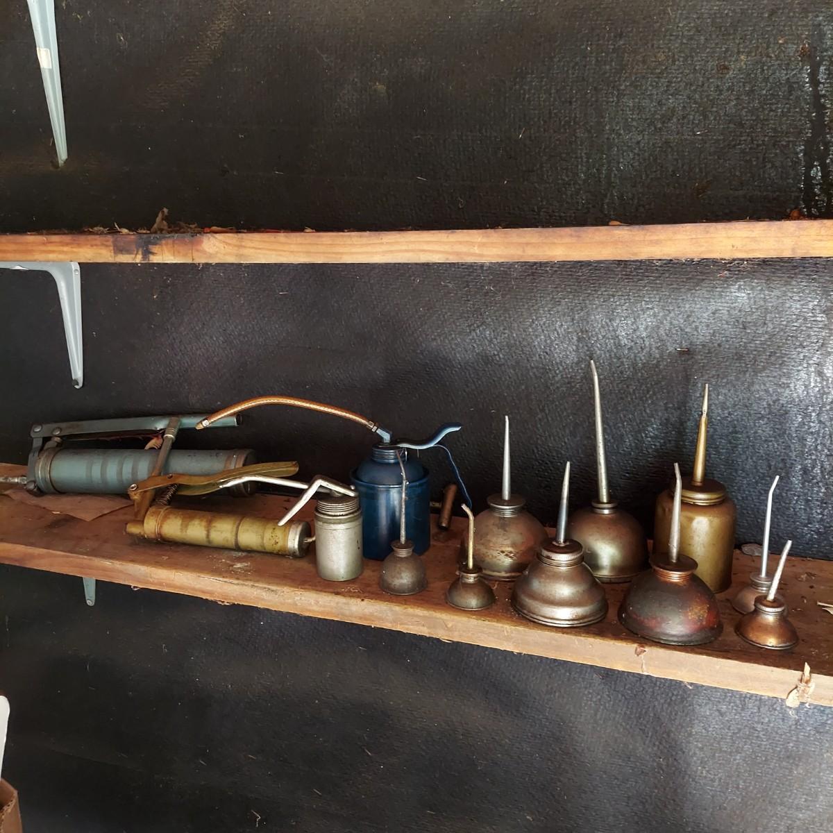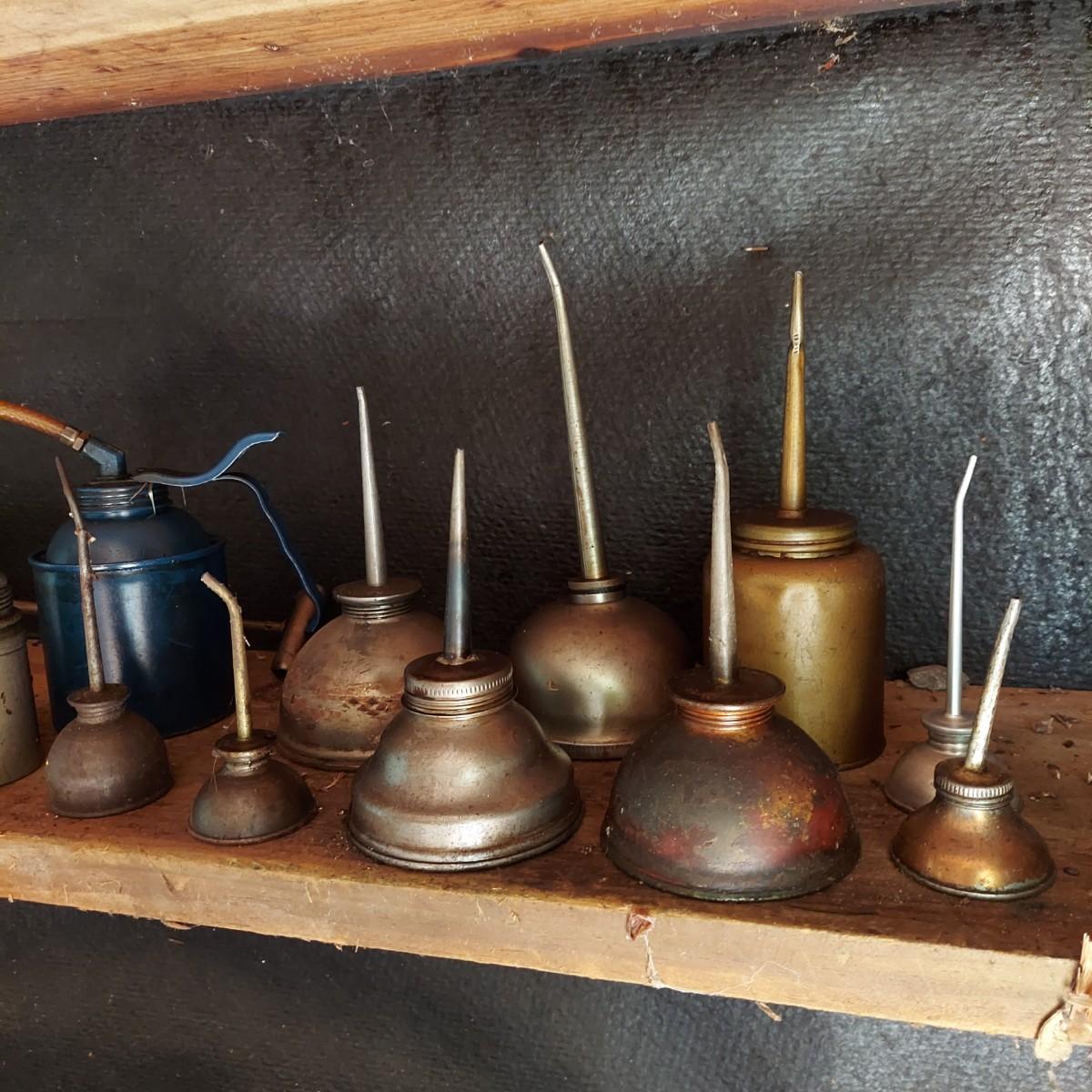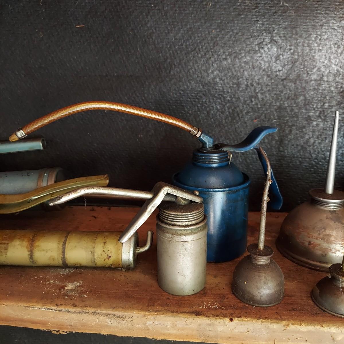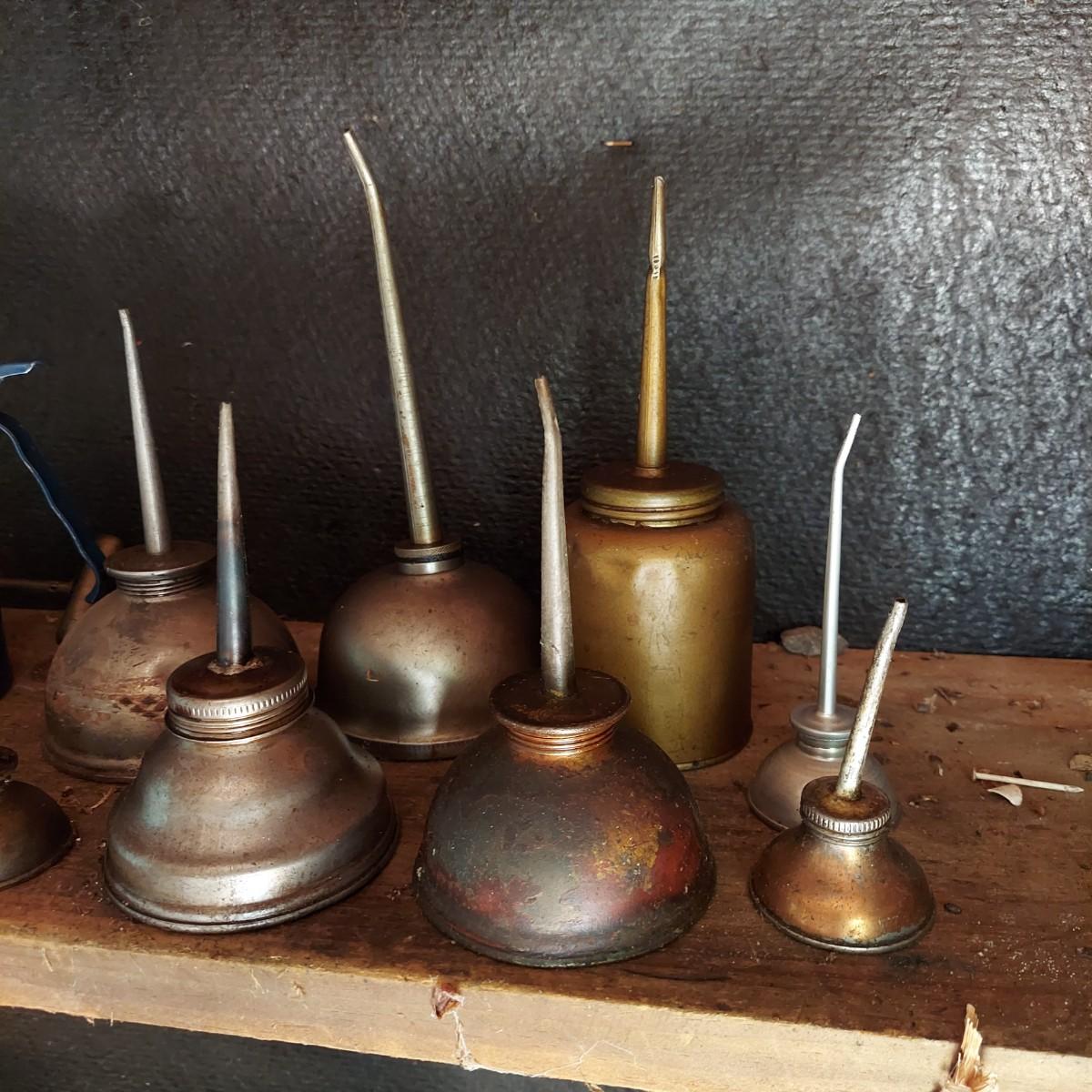 Several types of vintage oil cans. Some have liquid inside that cannot be verified. The blue oil can measures 3.25”D x 9”H. Please see photos for details. Local Pickup Only
