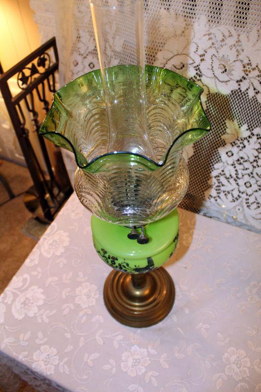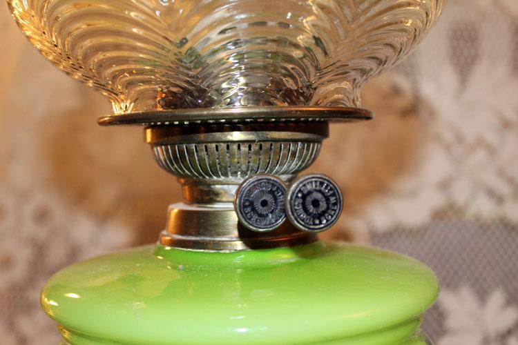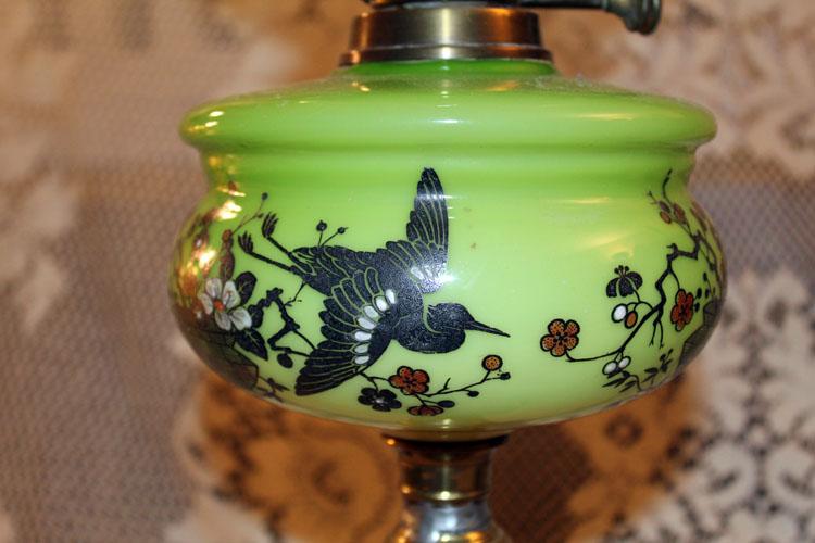 Vintage oil lamp, 23", painted milk glass column, toggles read Youngs Screw Fittings