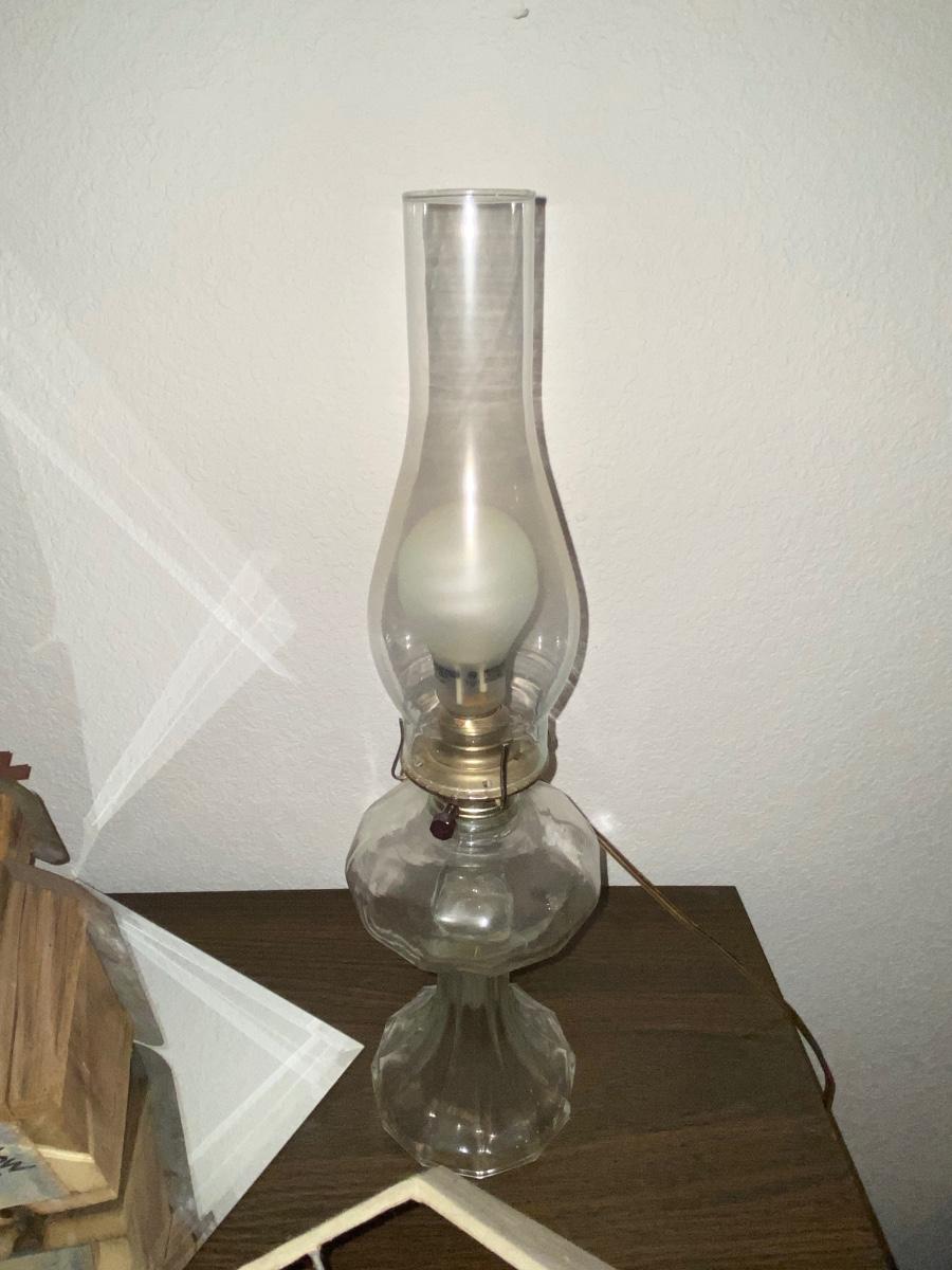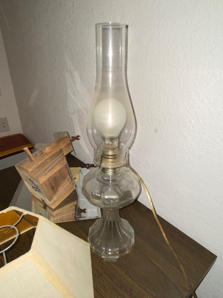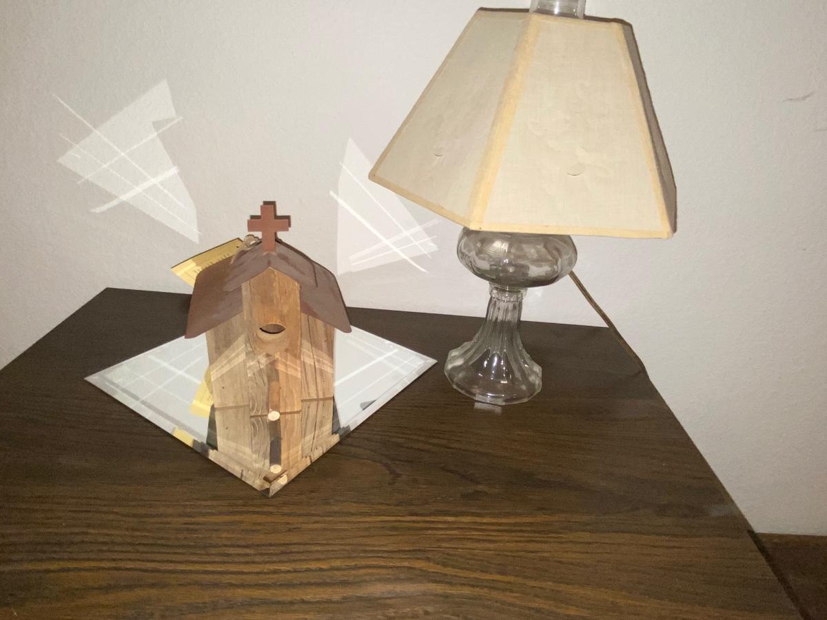 VINTAGE OIL LAMP CONVERTED TO A TABLE LAMP, A TIN AND WOOD BIRD HOUSE WITH FLAT DECORATIVE MIRROR
