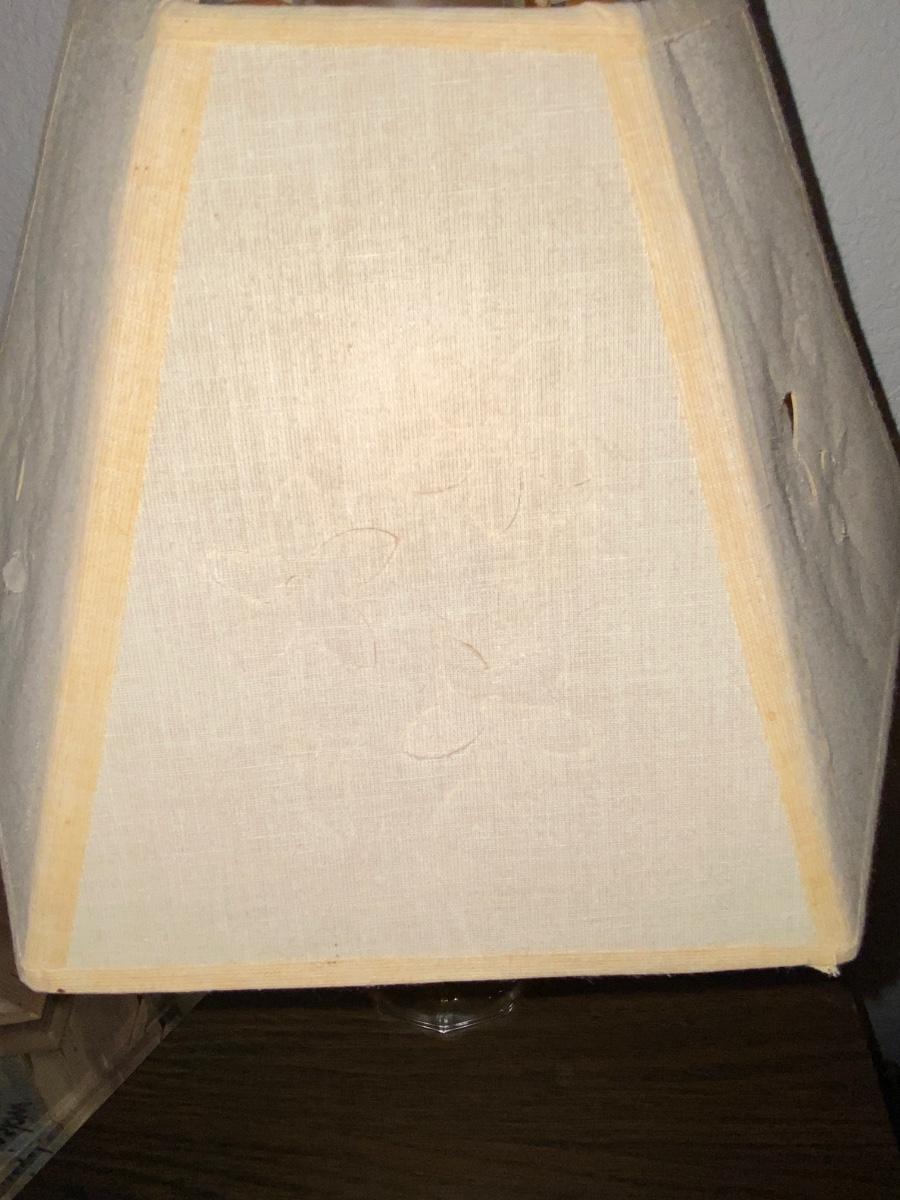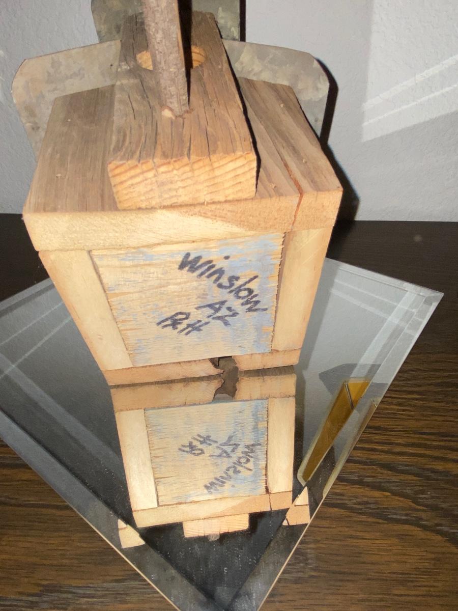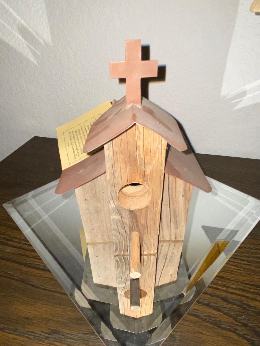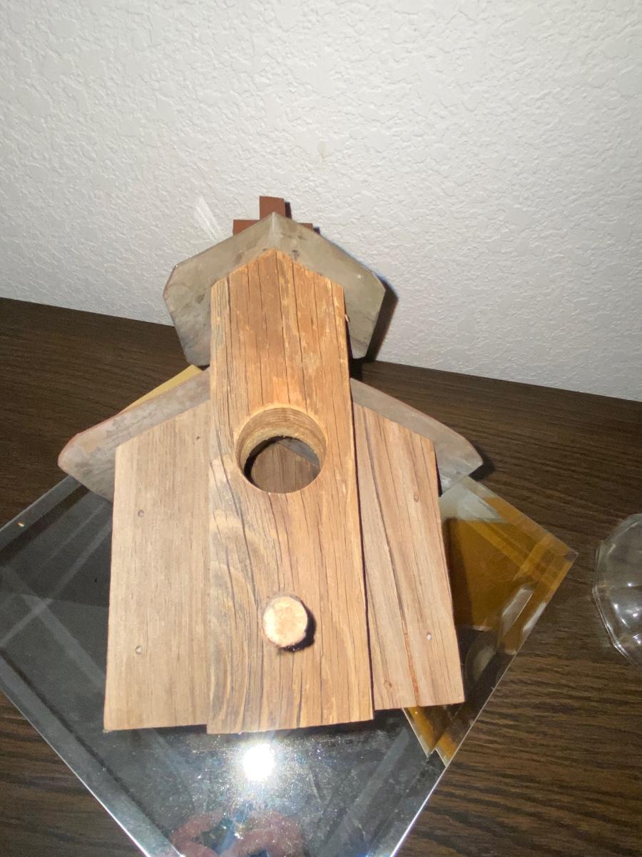 VINTAGE OIL LAMP CONVERTED TO A TABLE LAMP, A TIN AND WOOD BIRD HOUSE WITH FLAT DECORATIVE MIRROR