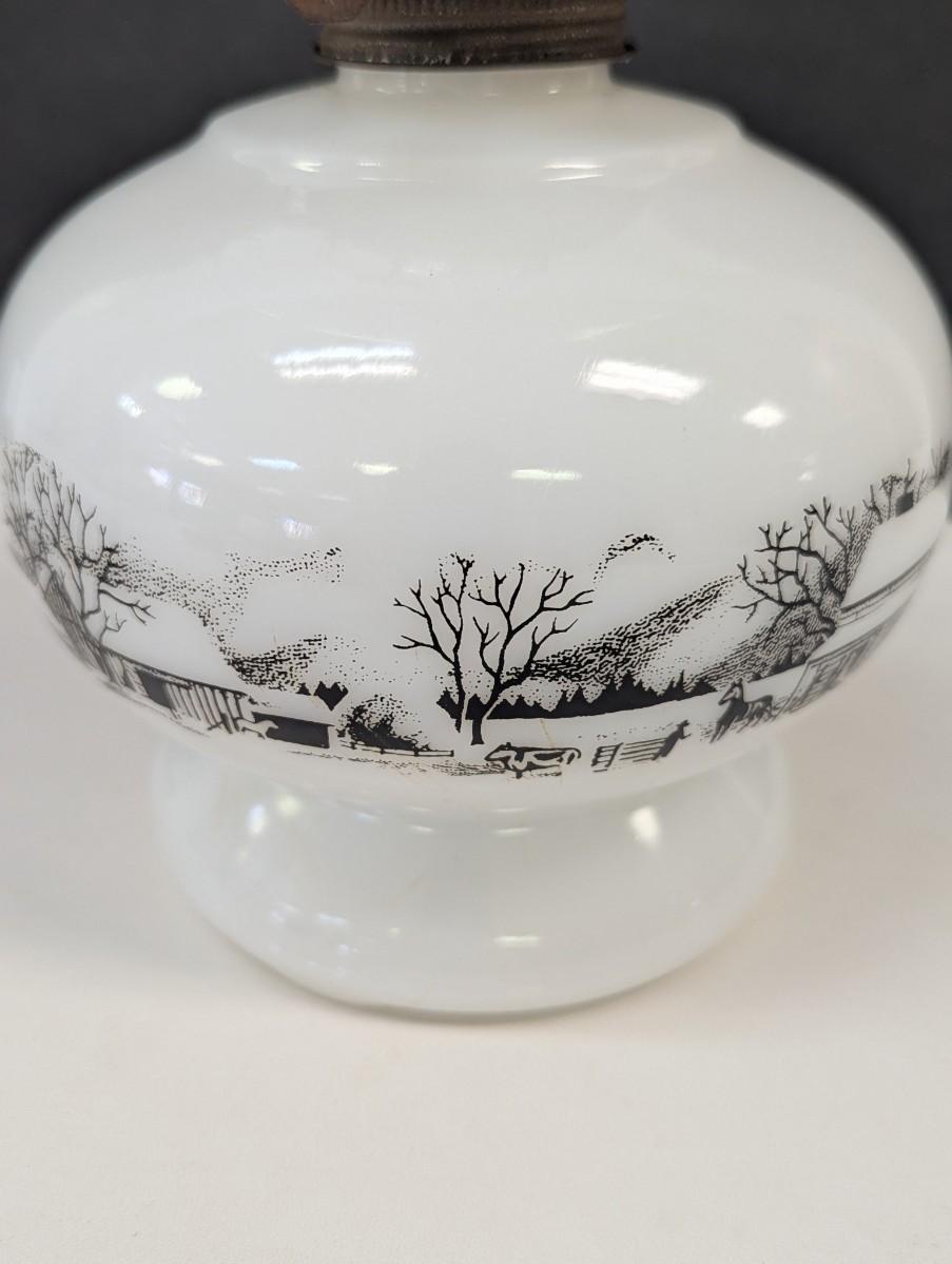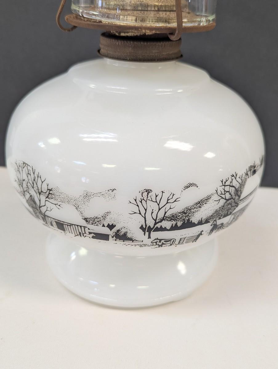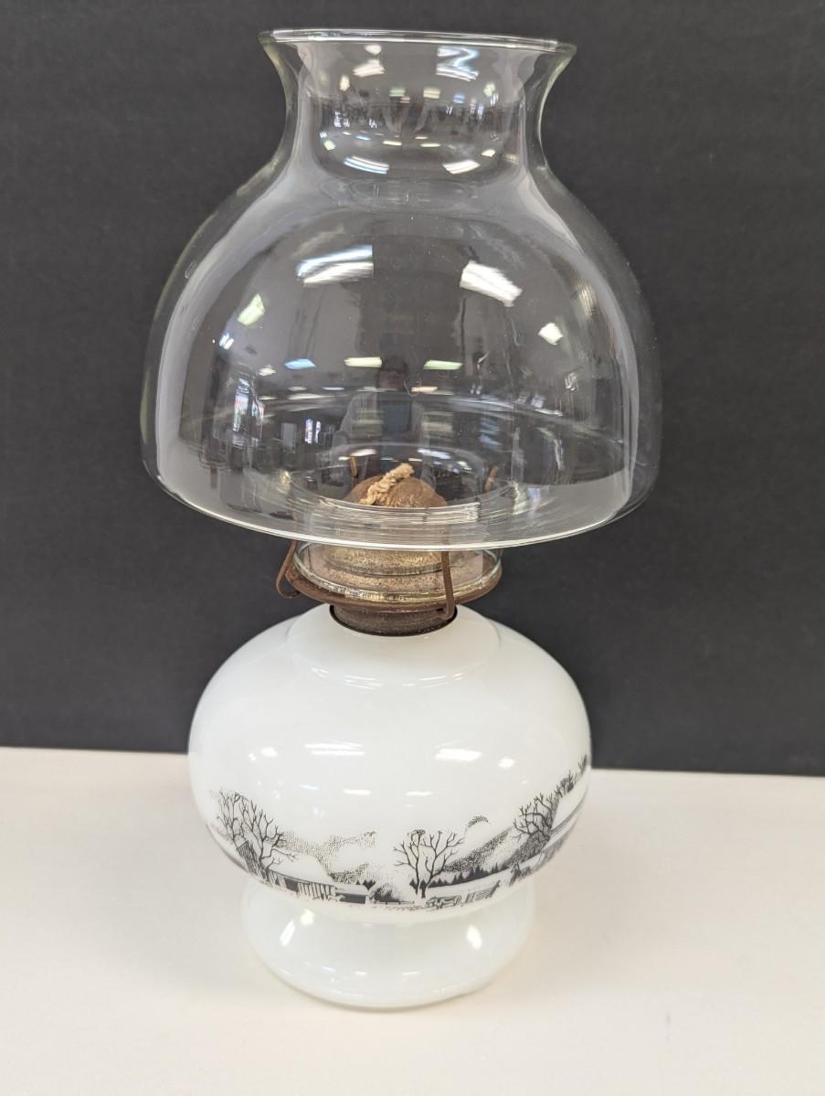 Vintage Oil Lamp Currier & Ives Milk Glass Base With Clear Glass Shade Choice 1