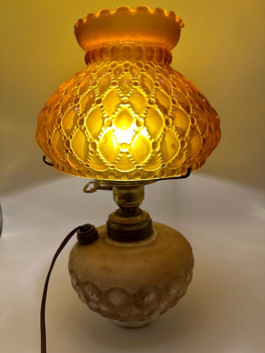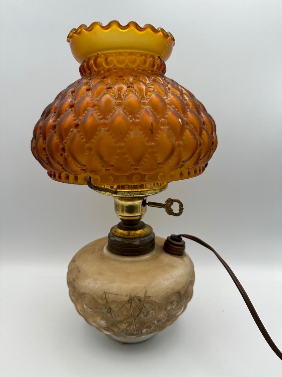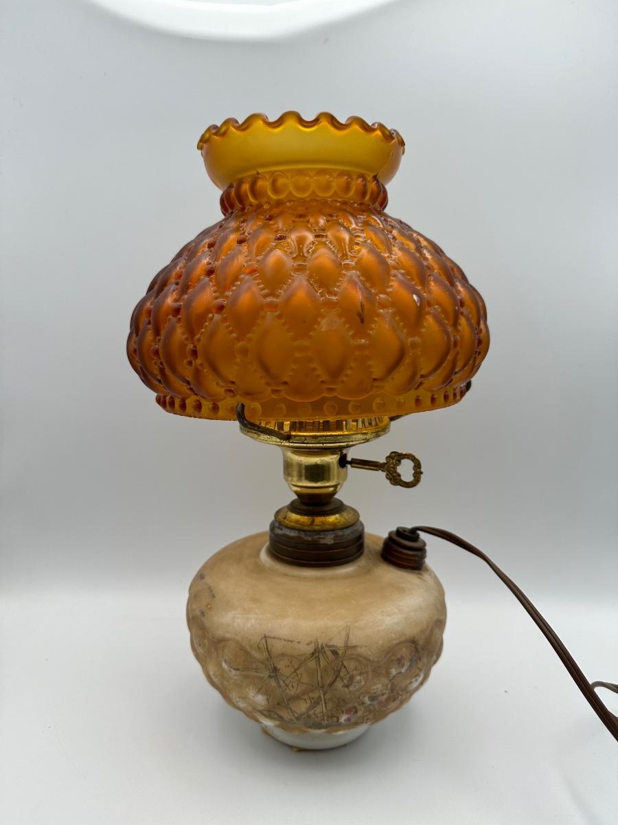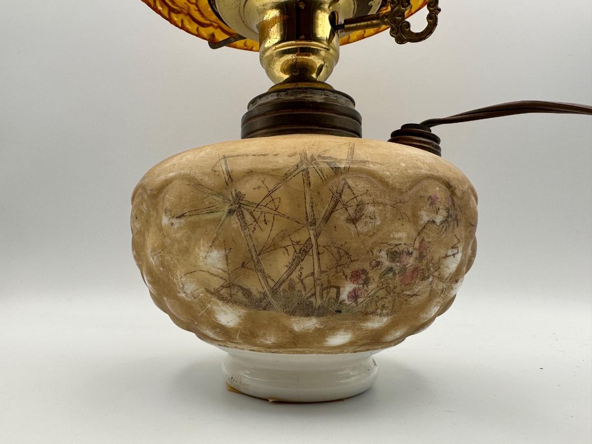 Antique Oil Lamp w/ Amber Glass Shade