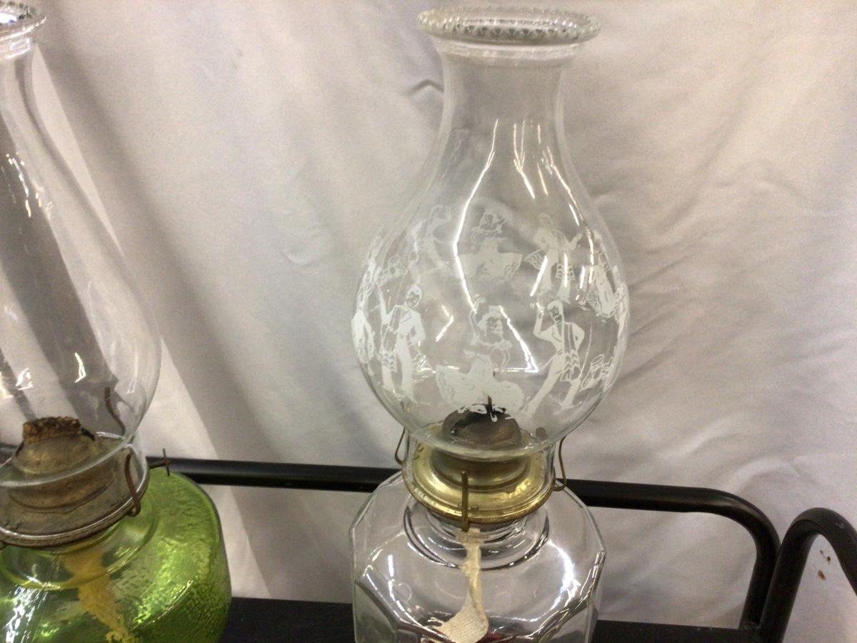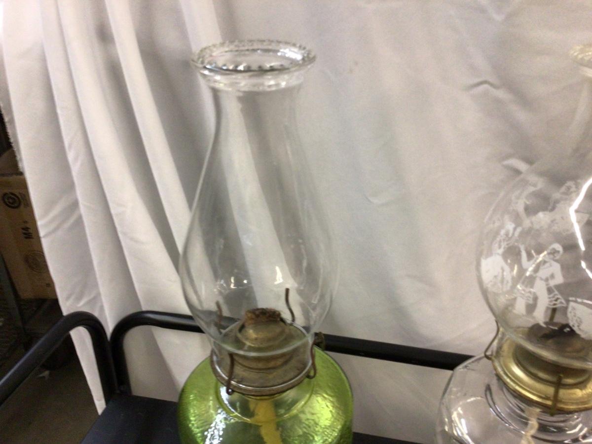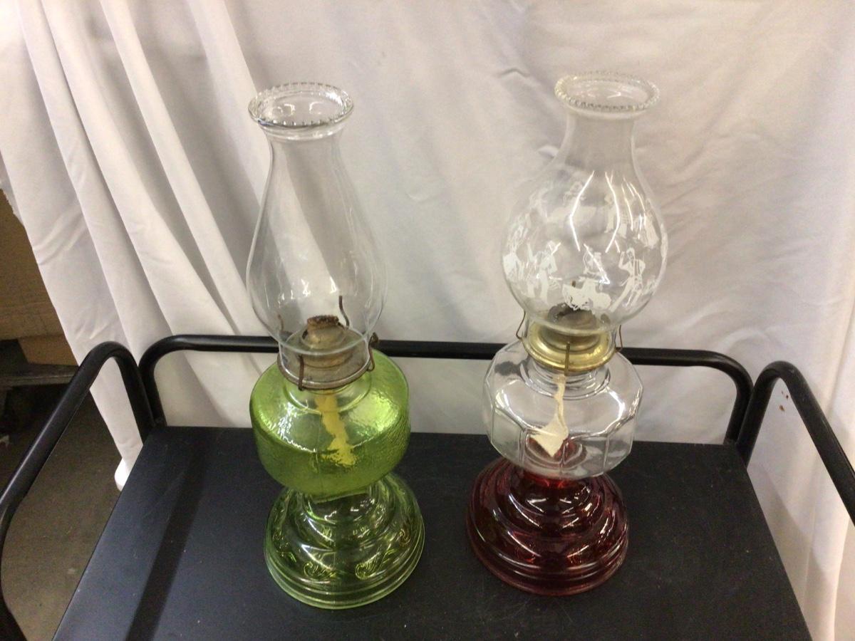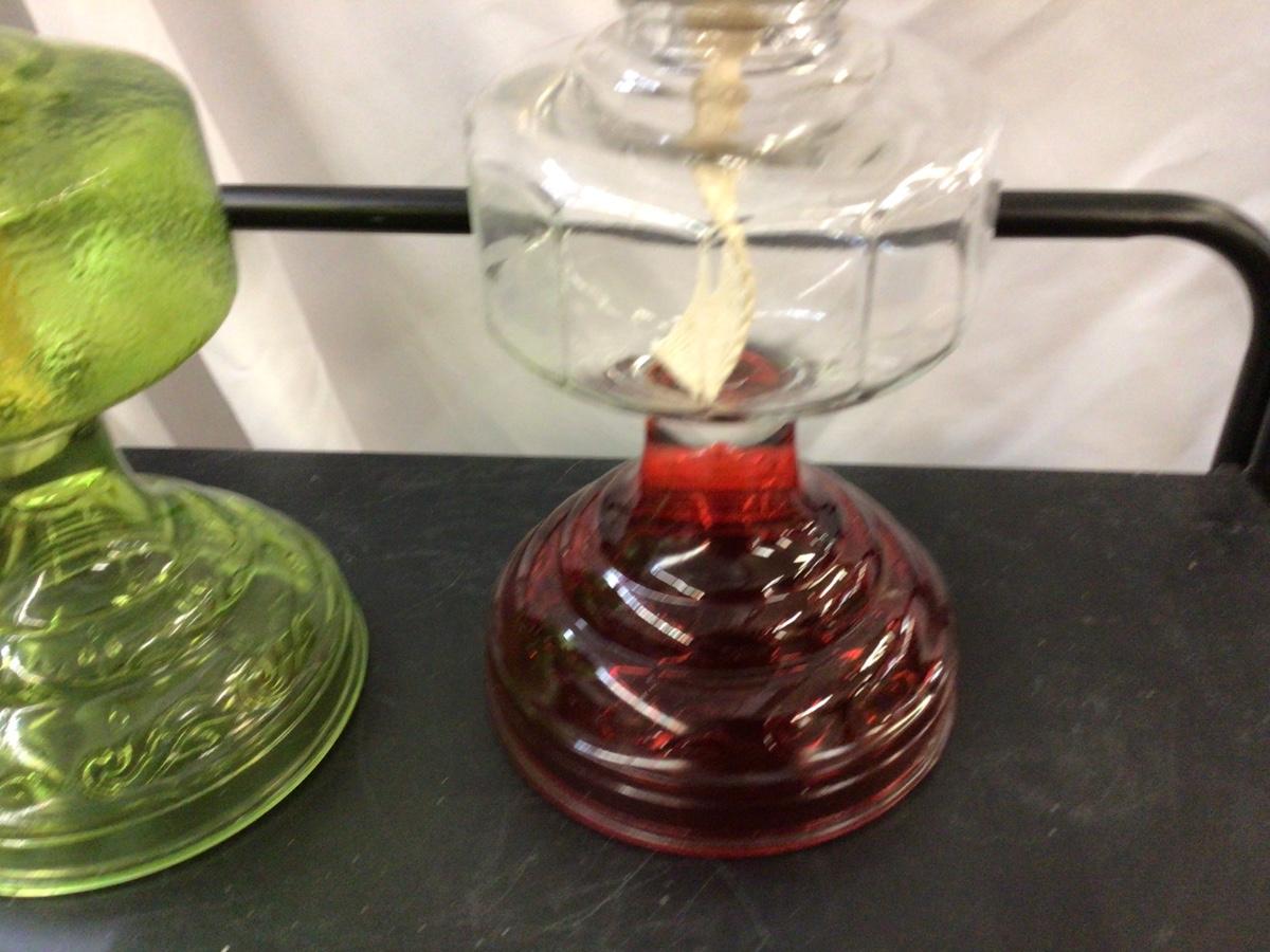 You get two oil lamps. One is flash green and one is flash red bases. Red flash has white figures on the chimney, green flash has clear chimney.