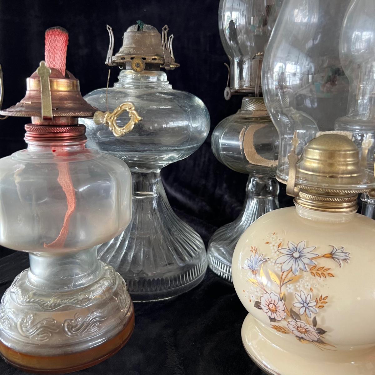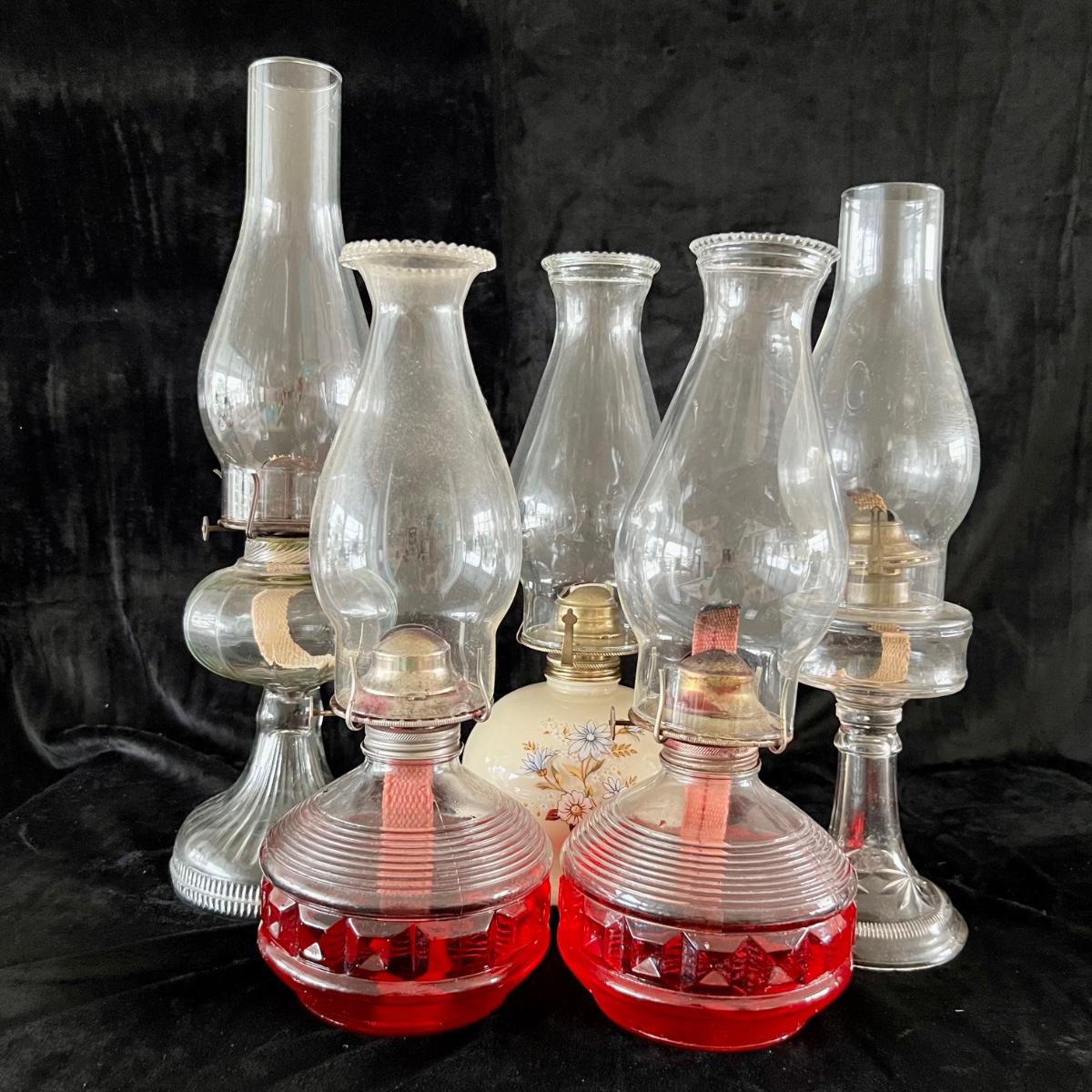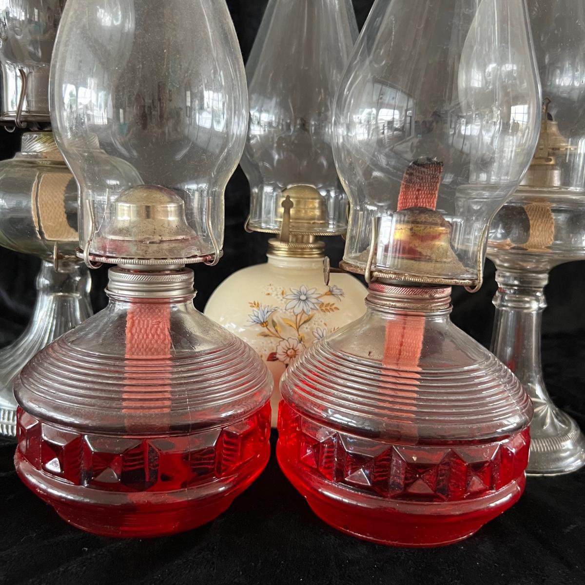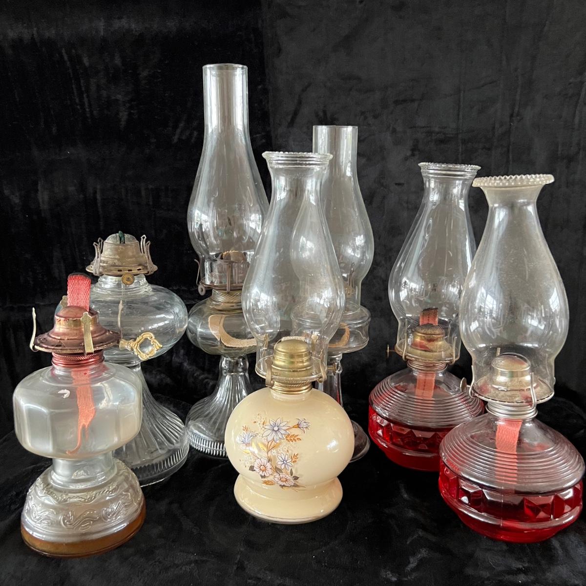 Collection of eight Glass and one ceramic oil lamps. Tallest lamp meas. 18”h, Pair of lamps with red oil measures 14”h. No visible chips, 2 missing globes,