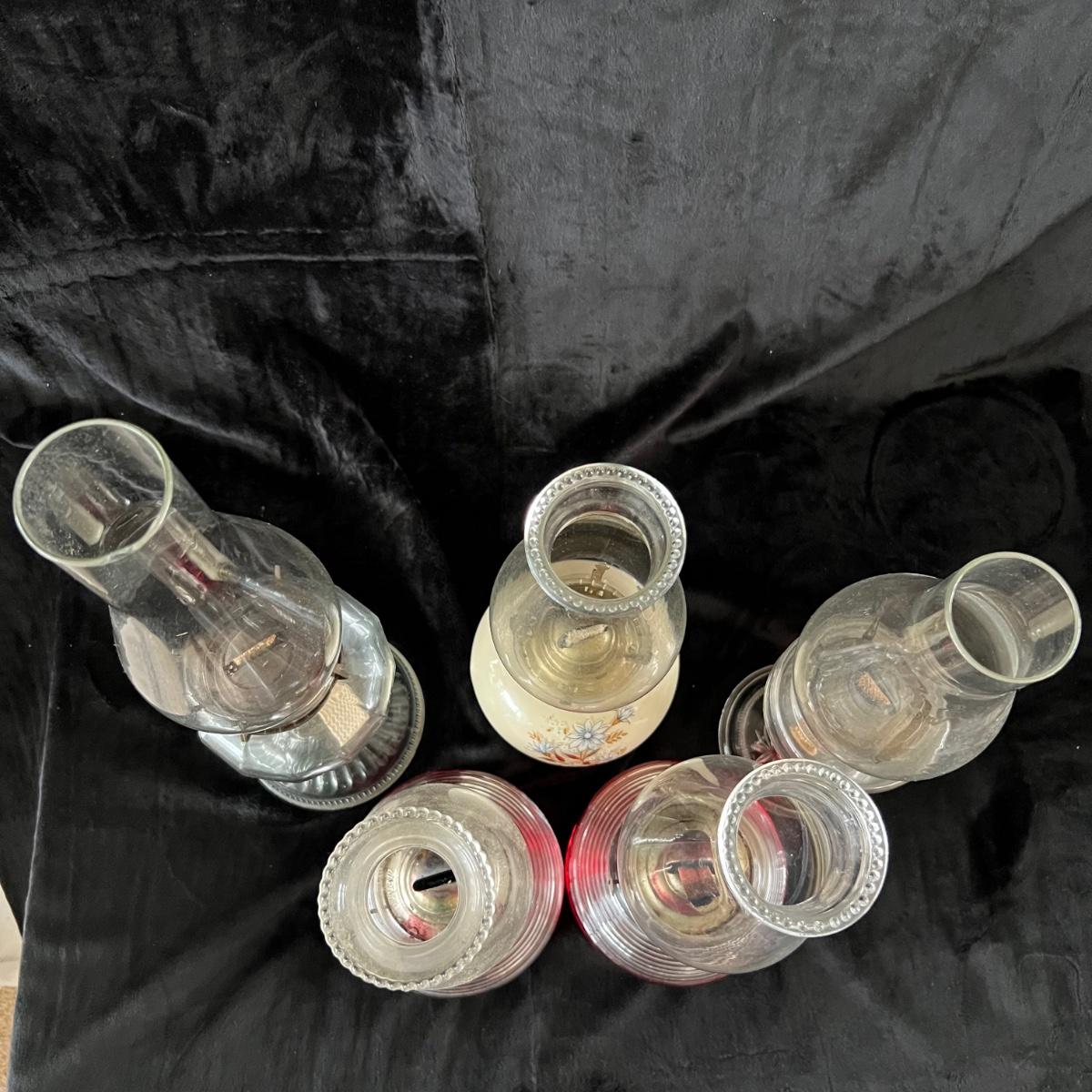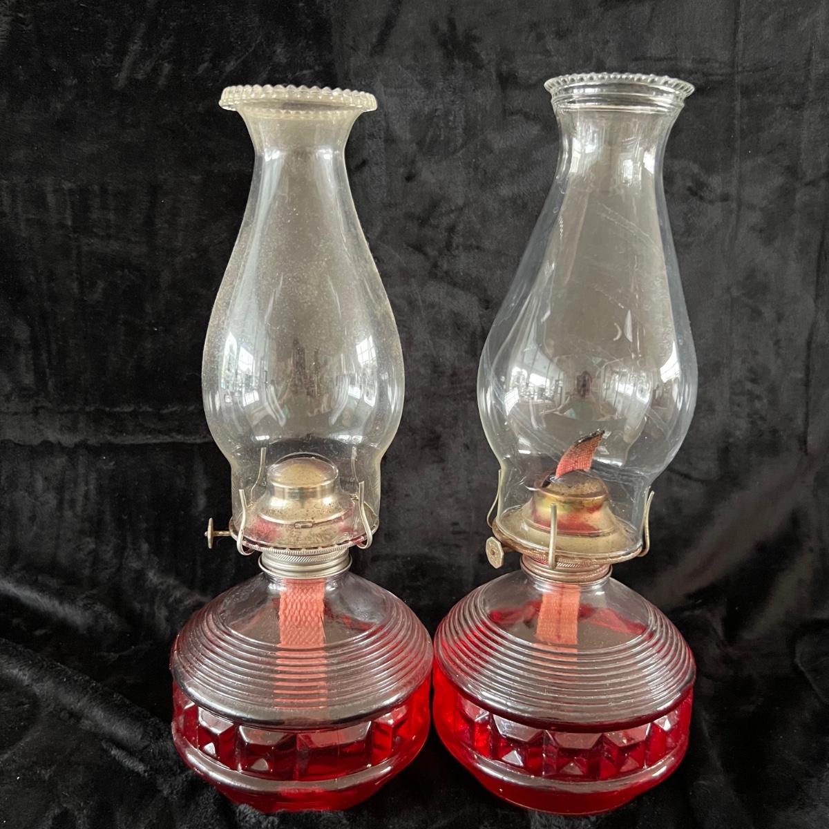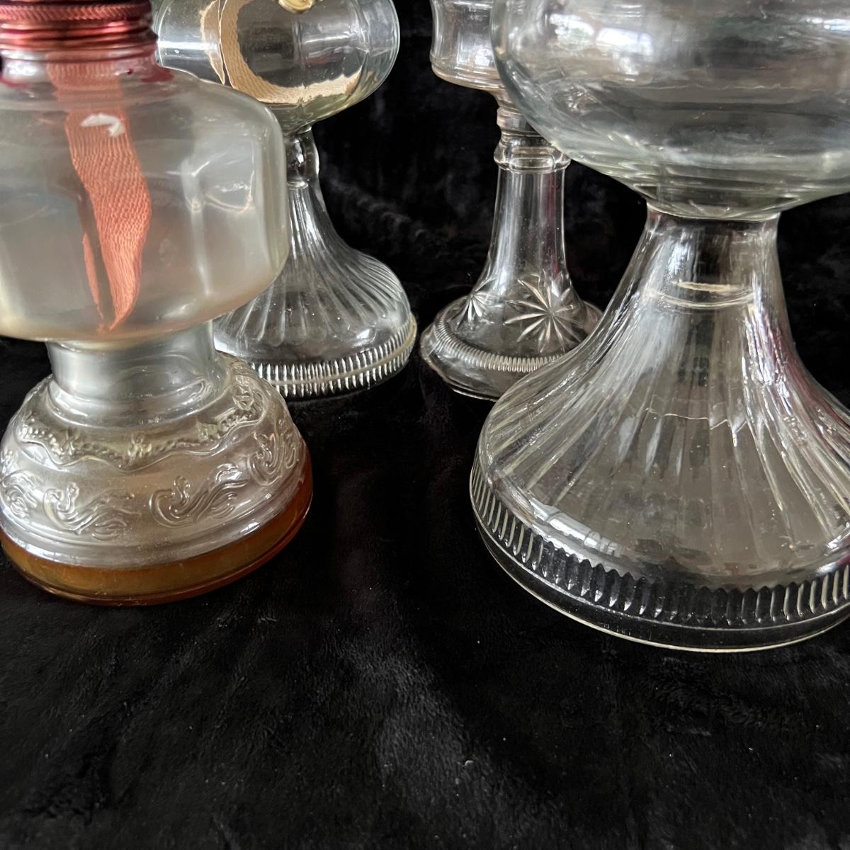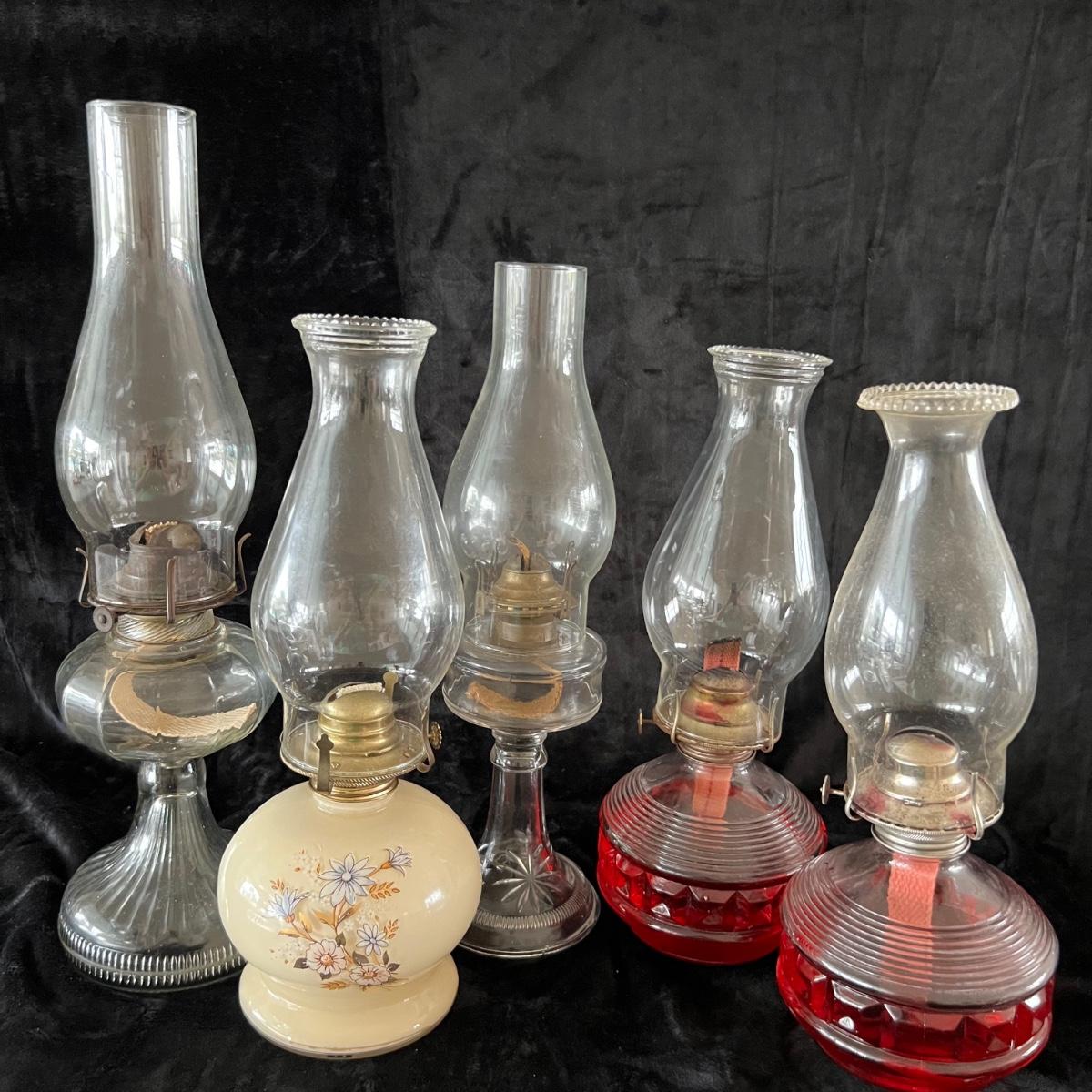 Collection of eight Glass and one ceramic oil lamps. Tallest lamp meas. 18”h, Pair of lamps with red oil measures 14”h. No visible chips, 2 missing globes,