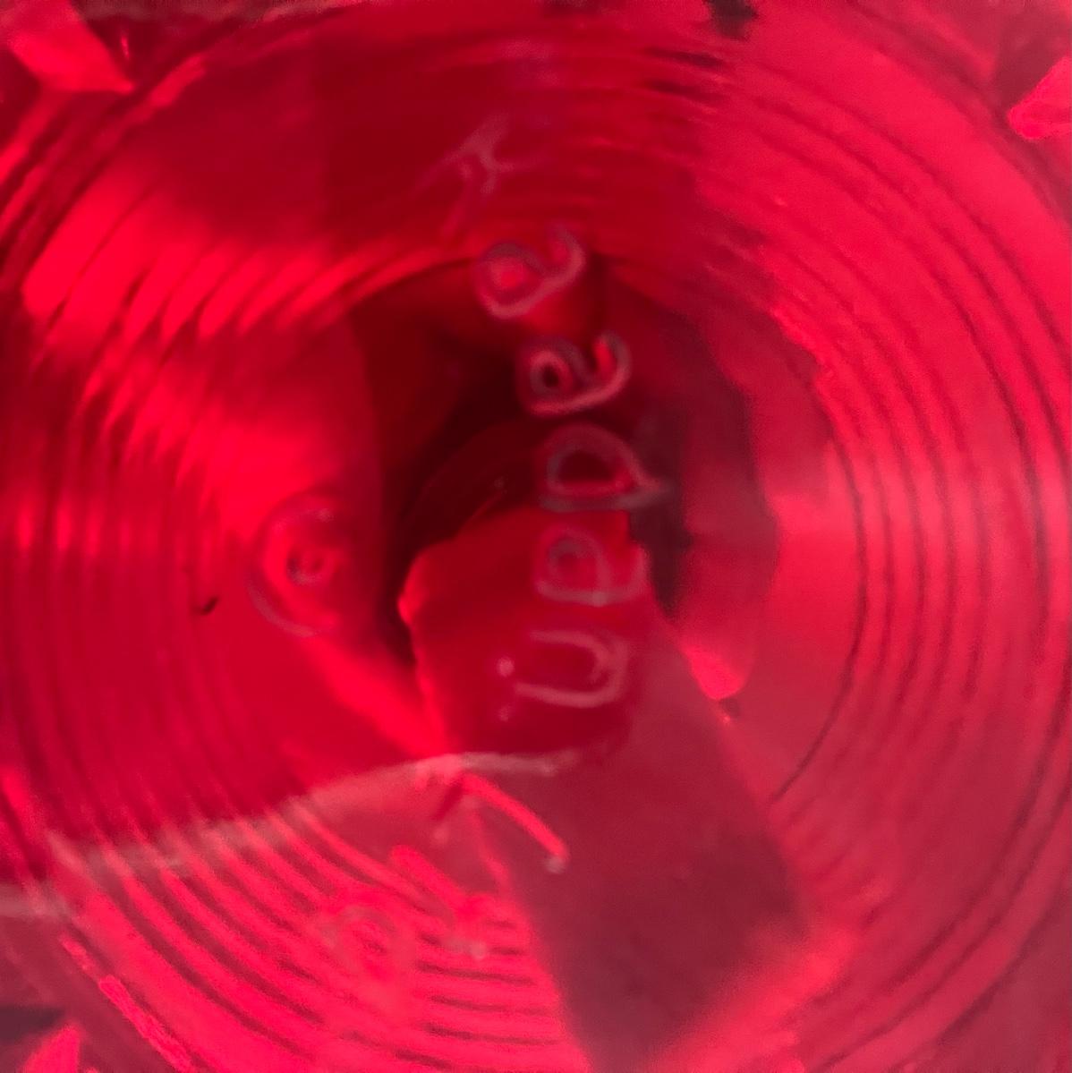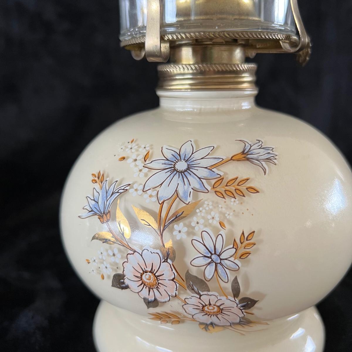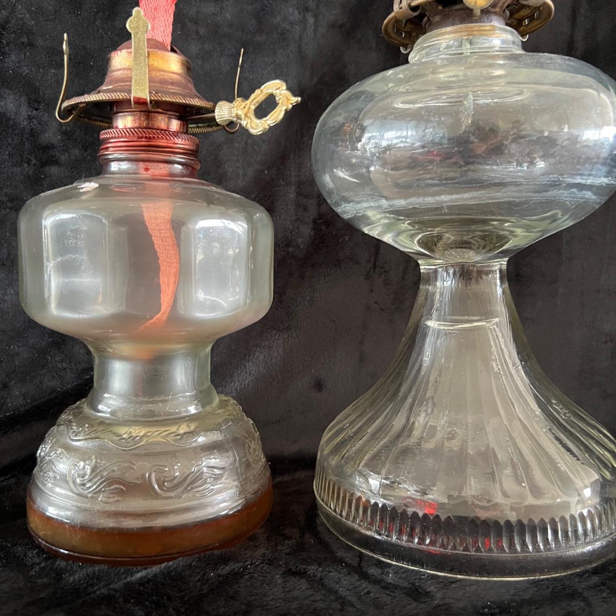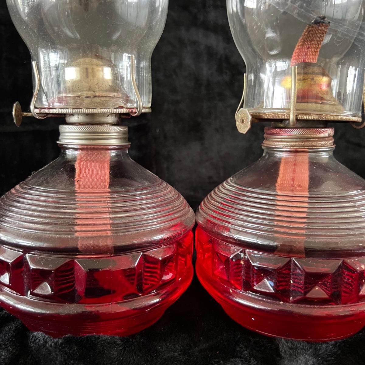 Collection of eight Glass and one ceramic oil lamps. Tallest lamp meas. 18”h, Pair of lamps with red oil measures 14”h. No visible chips, 2 missing globes,